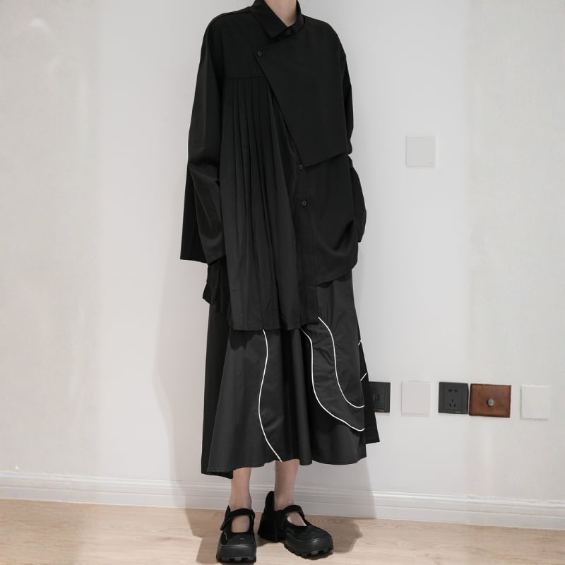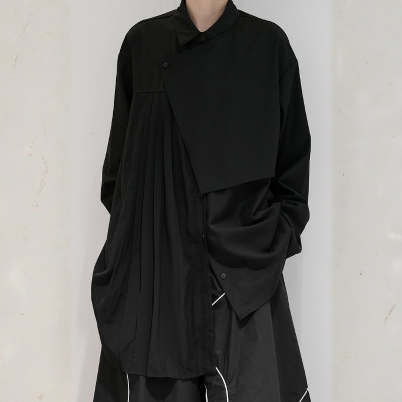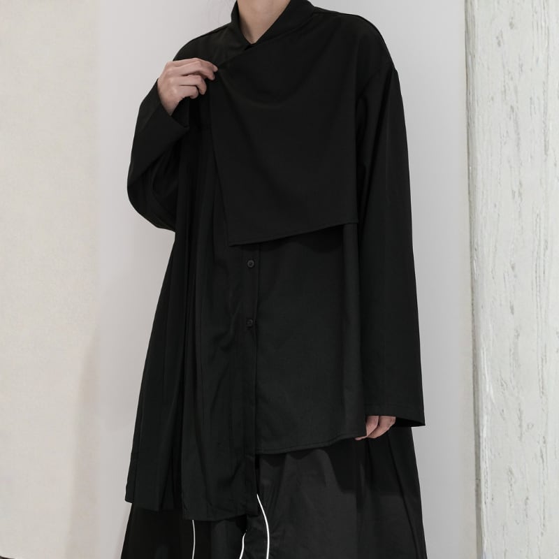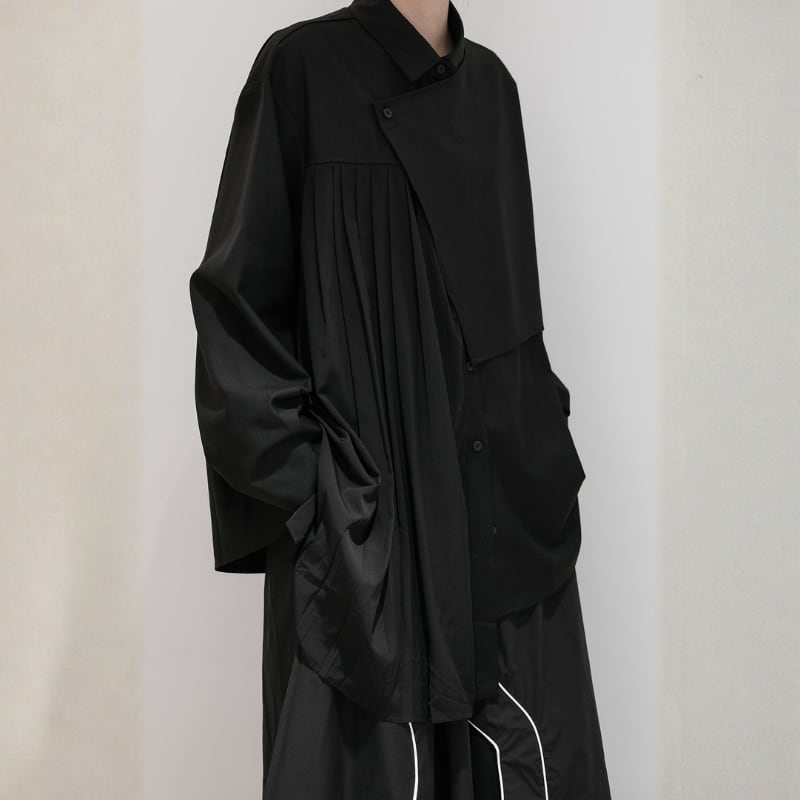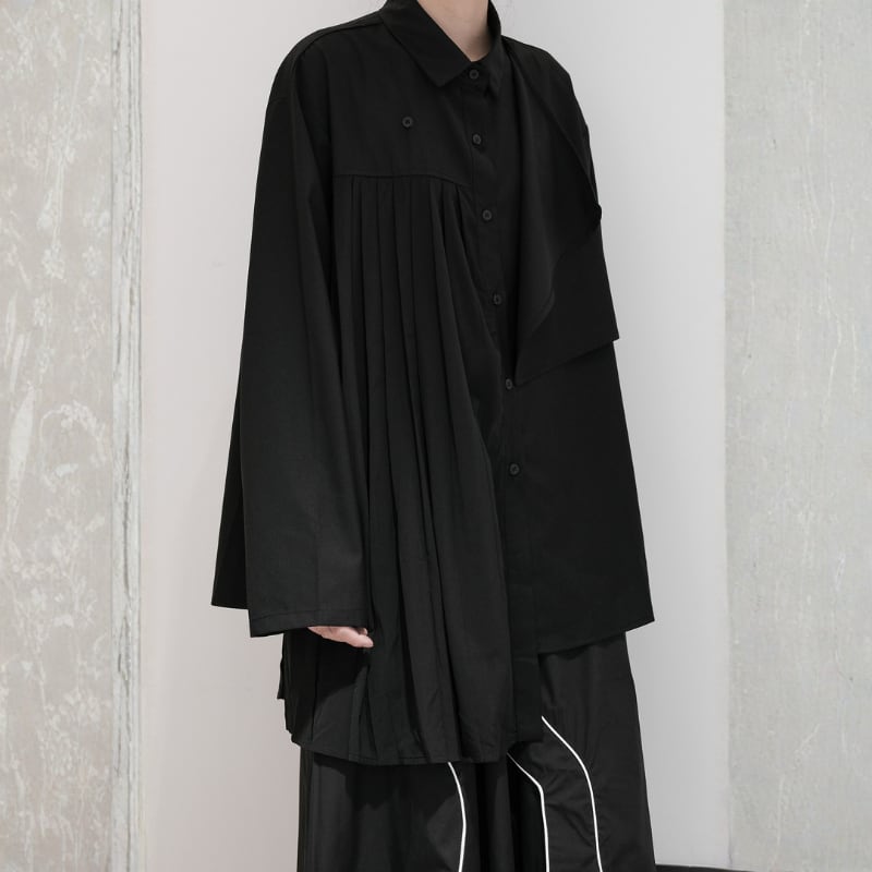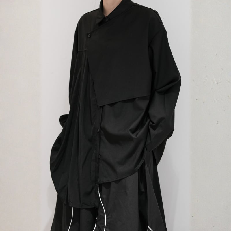 オーバーサイズのロングシャツに、モードな構築性を織り込んだデザイン。