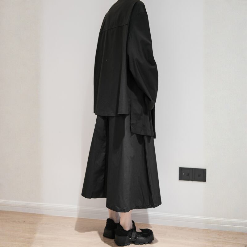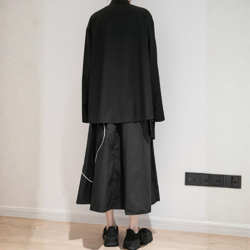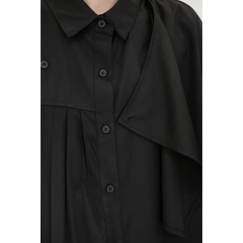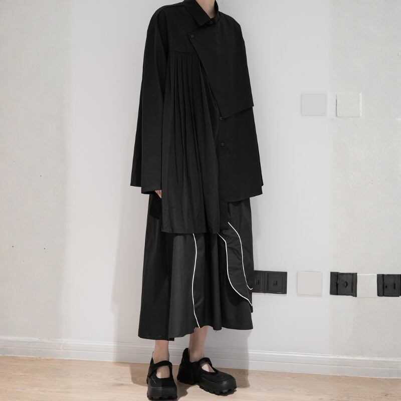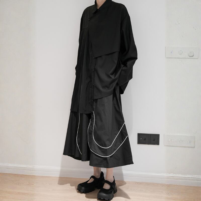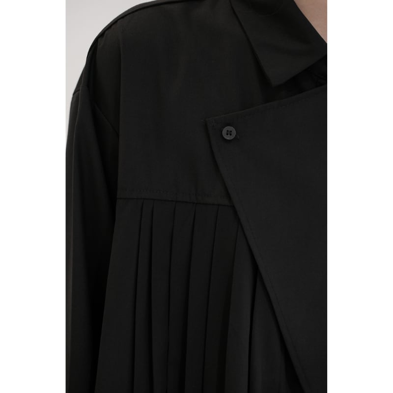 オーバーサイズのロングシャツに、モードな構築性を織り込んだデザイン。