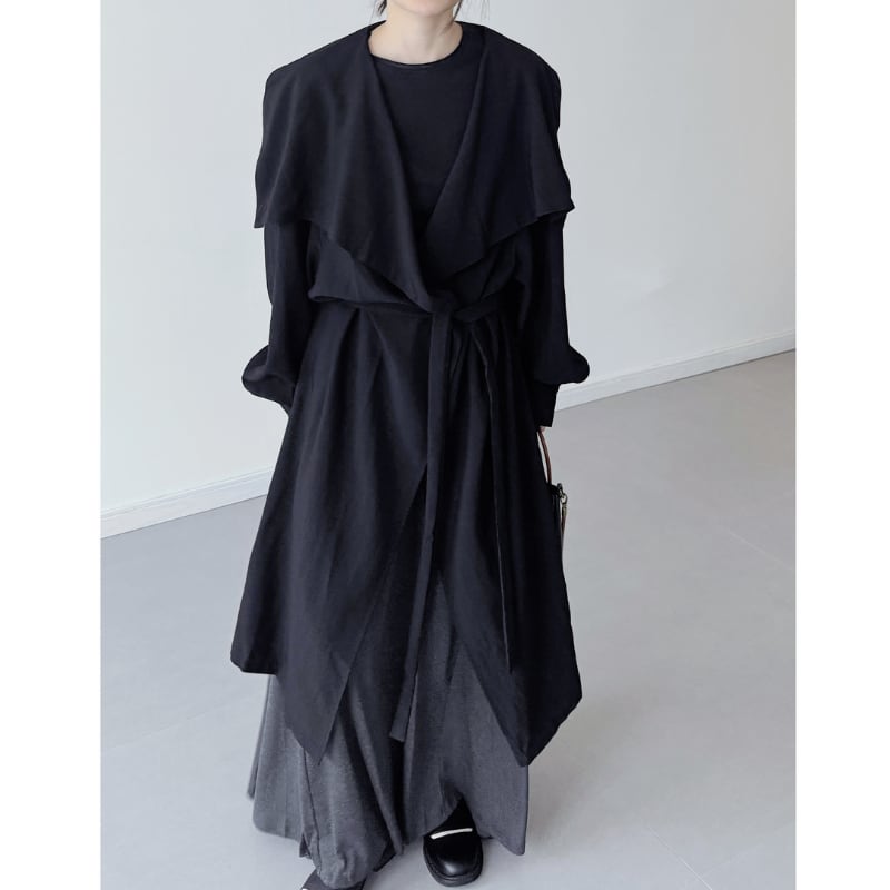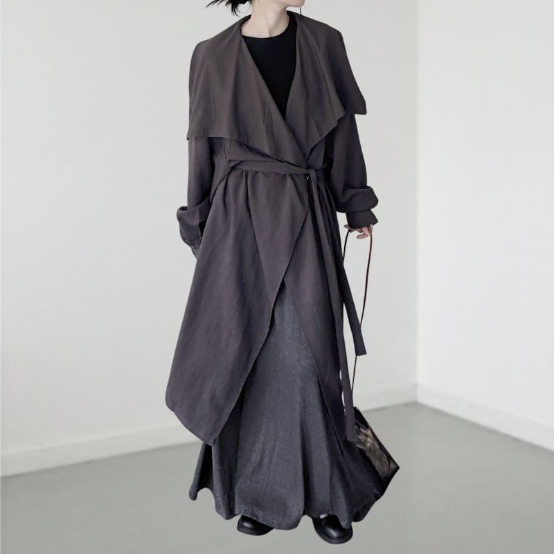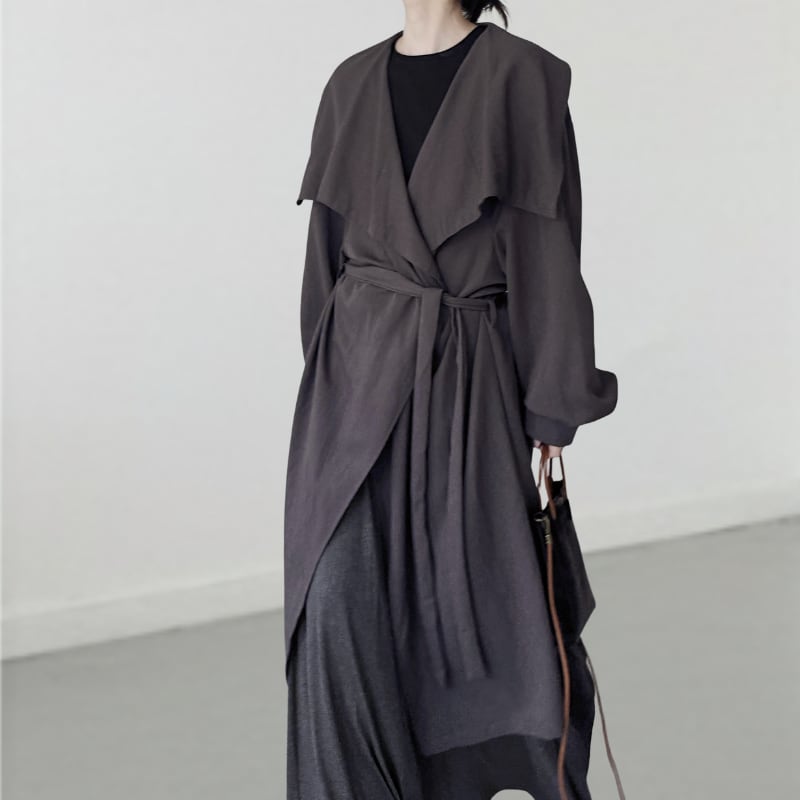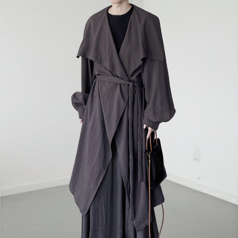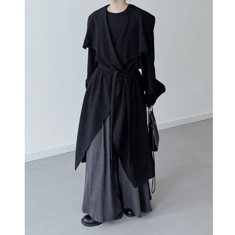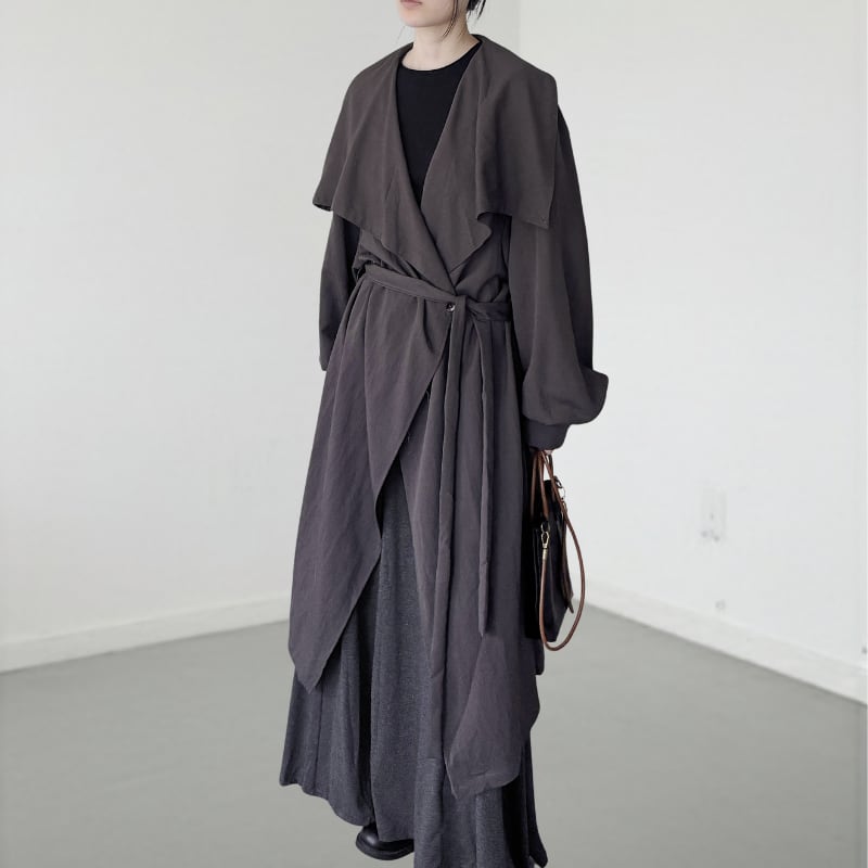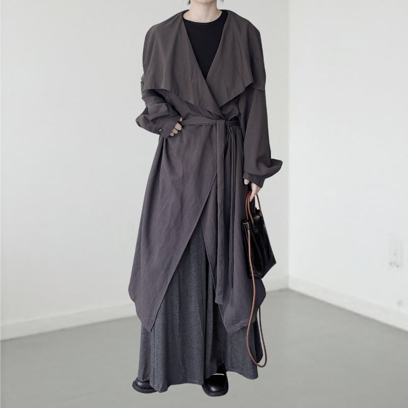 共布ベルトでシルエットを調節すれば、オーバーサイズながらも洗練されたムードを演出できます。