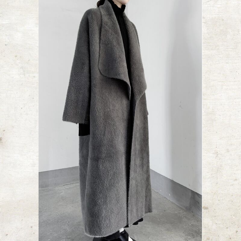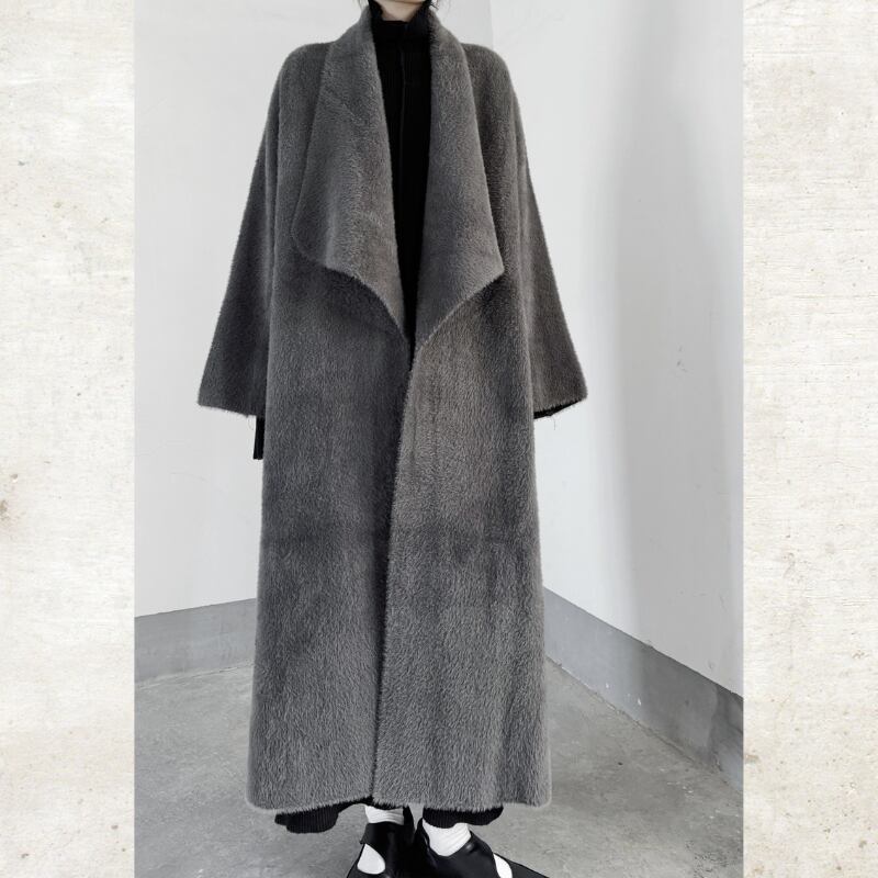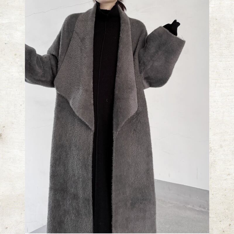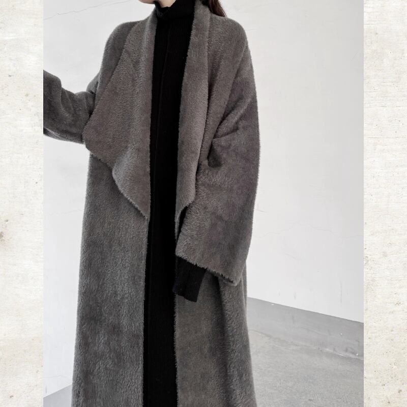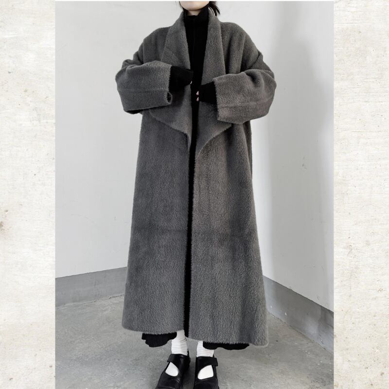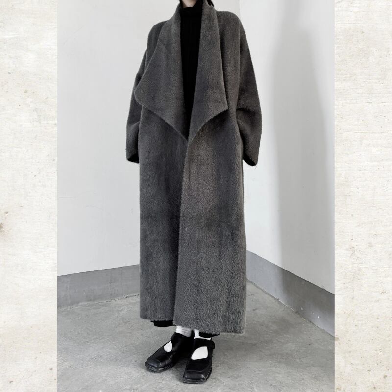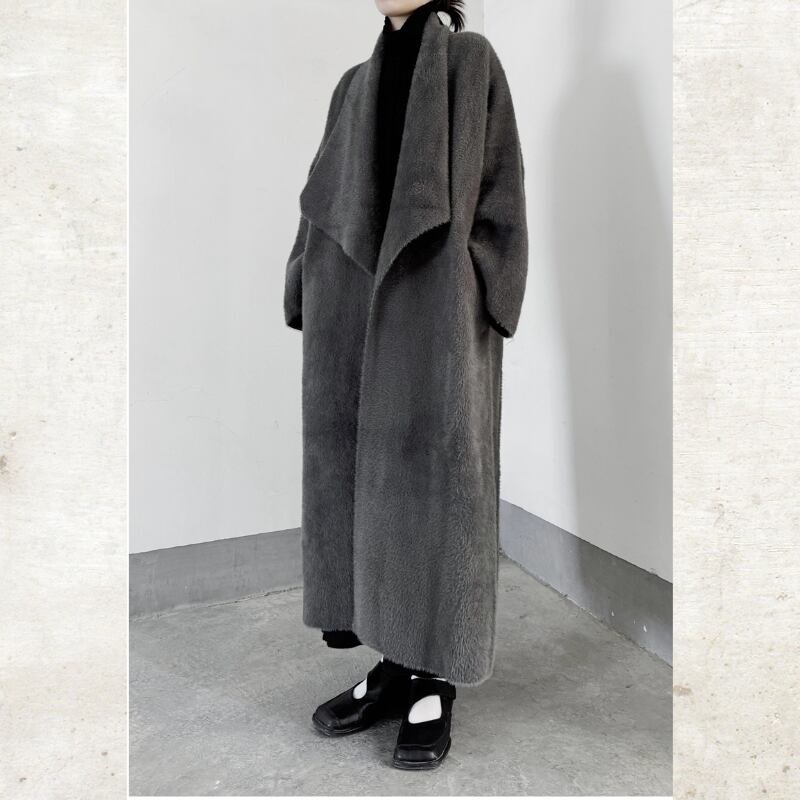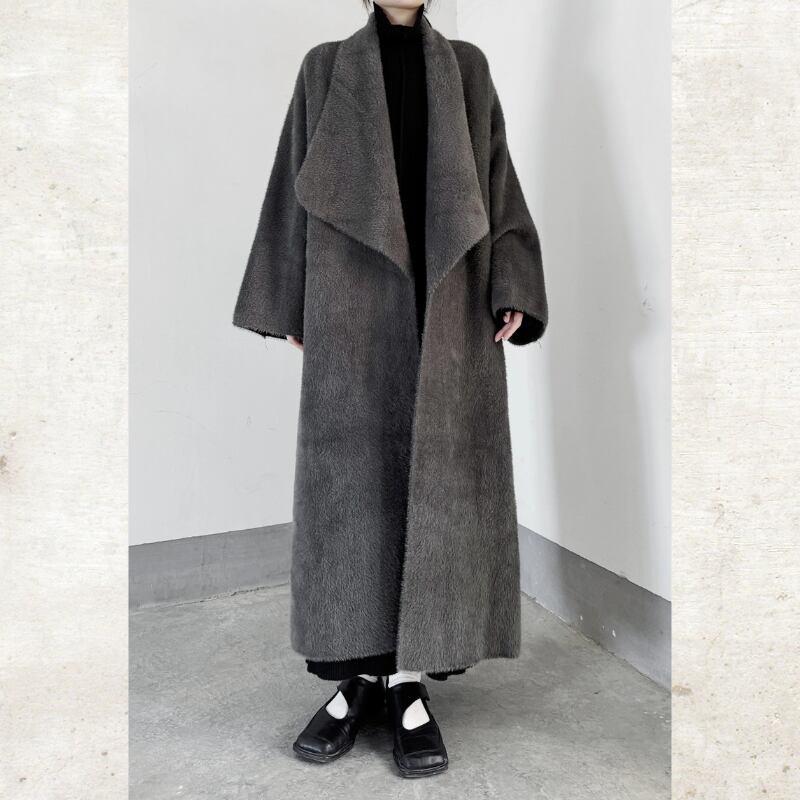 柔らかなシャギー素材と、ドレープを描くショールカラーを融合させたロングコート。