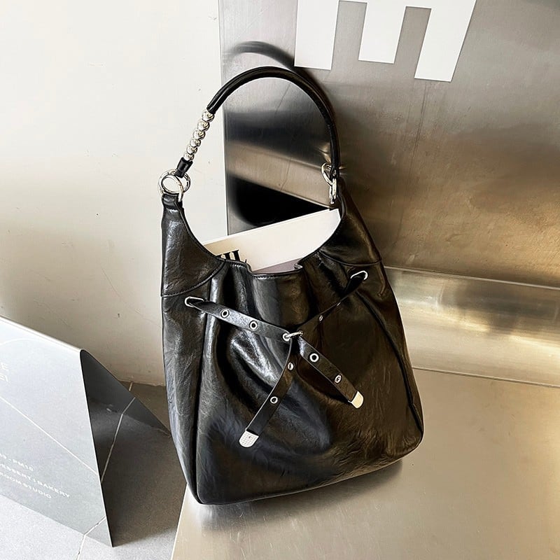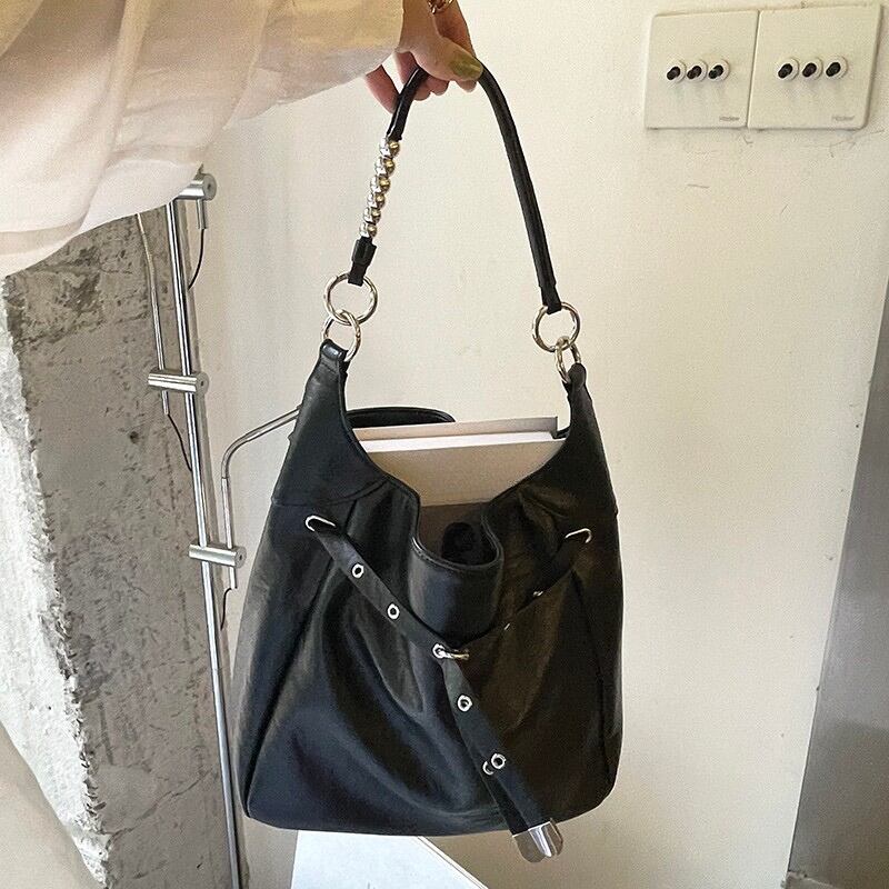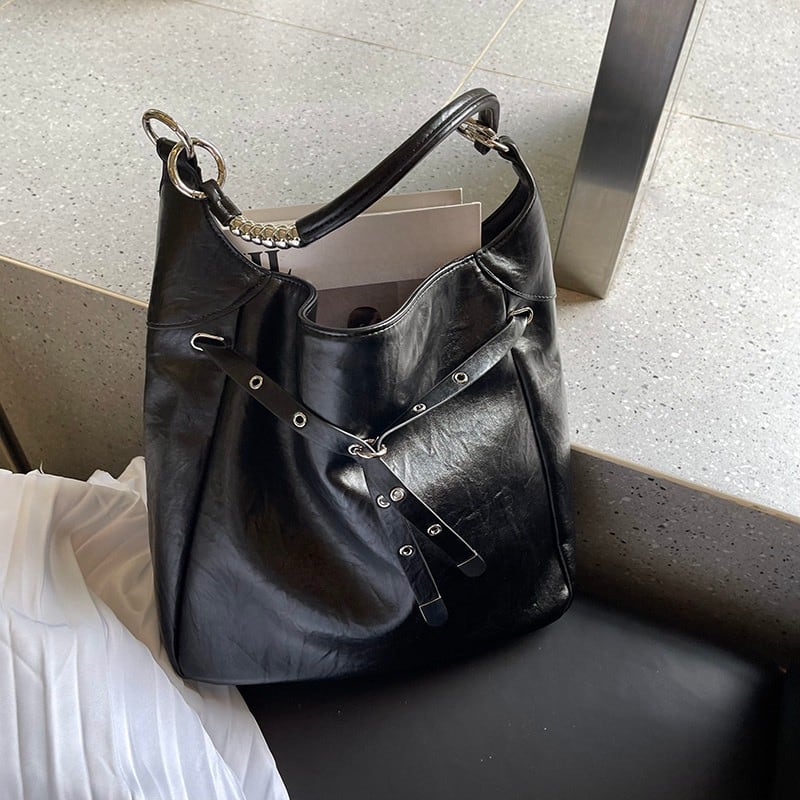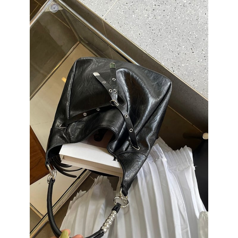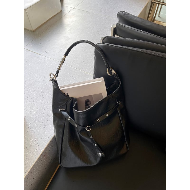 アイレットとバックル装飾を大胆にあしらった、エッジの効いたデザインバッグ。