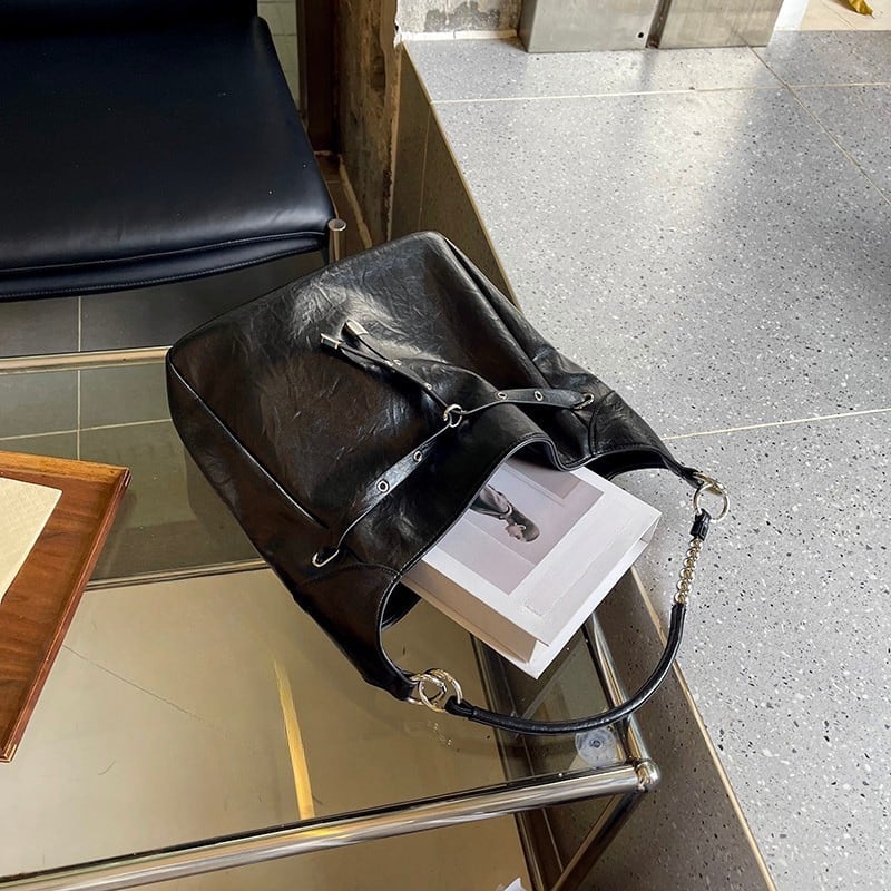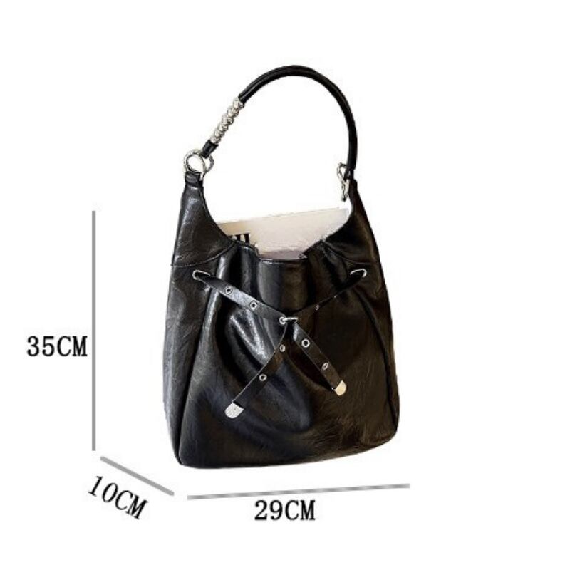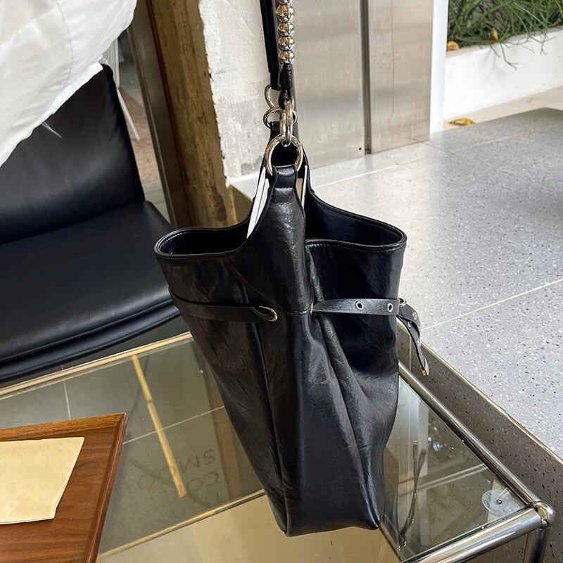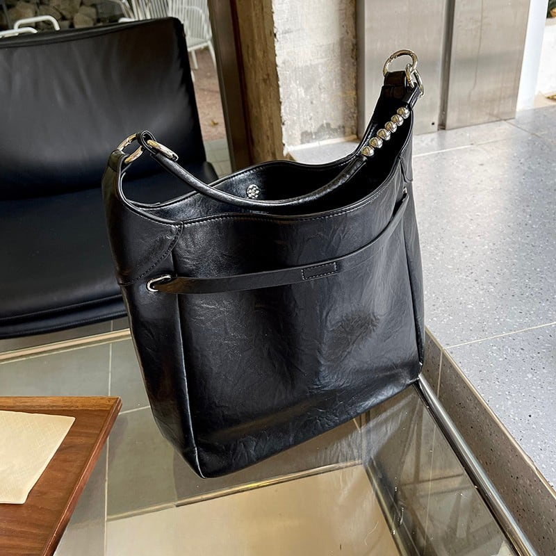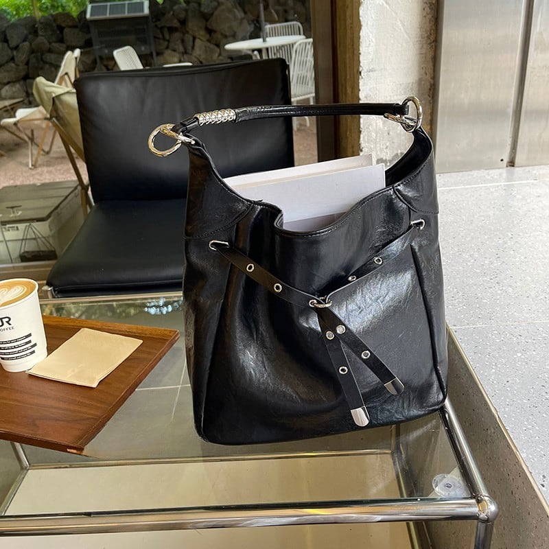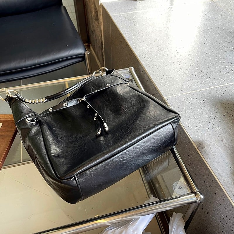 アイレットとバックル装飾を大胆にあしらった、エッジの効いたデザインバッグ。