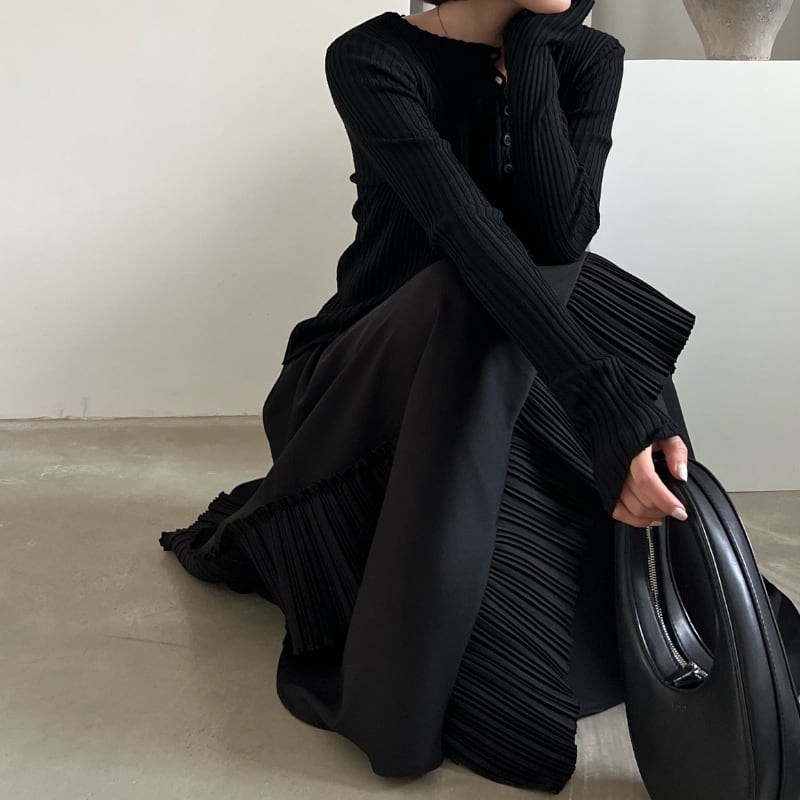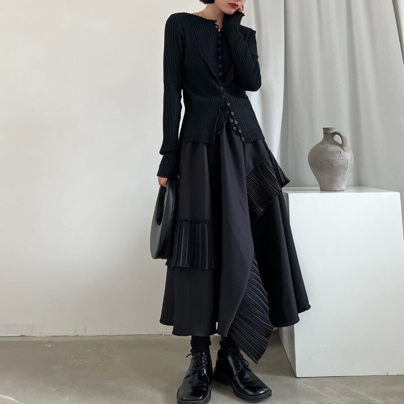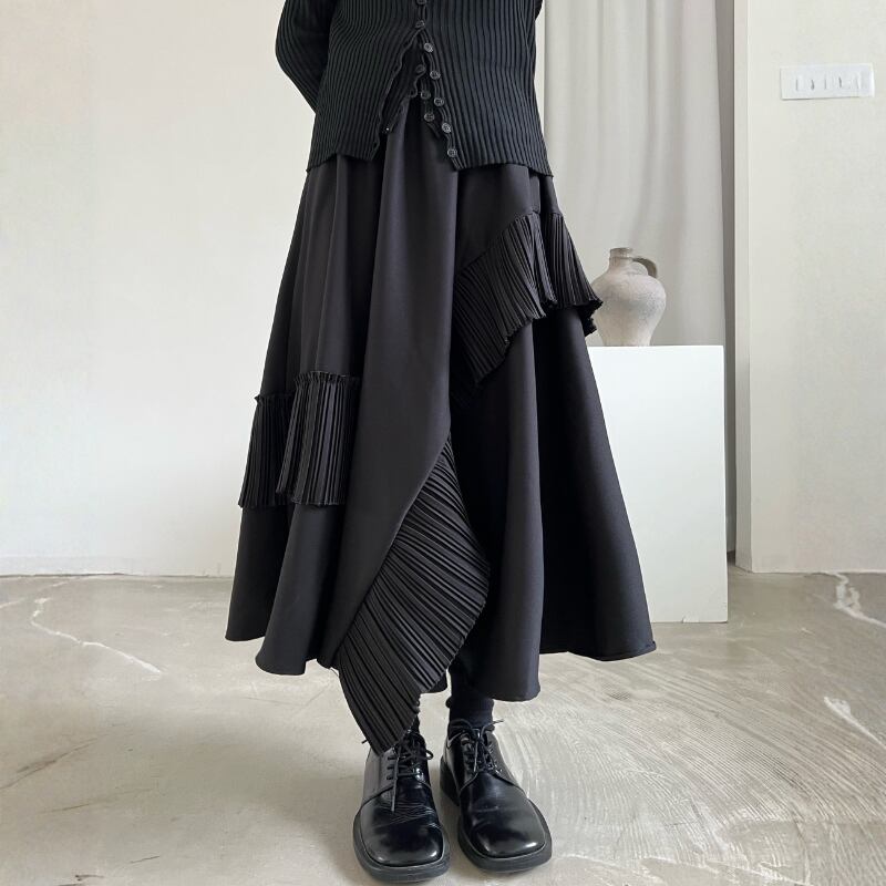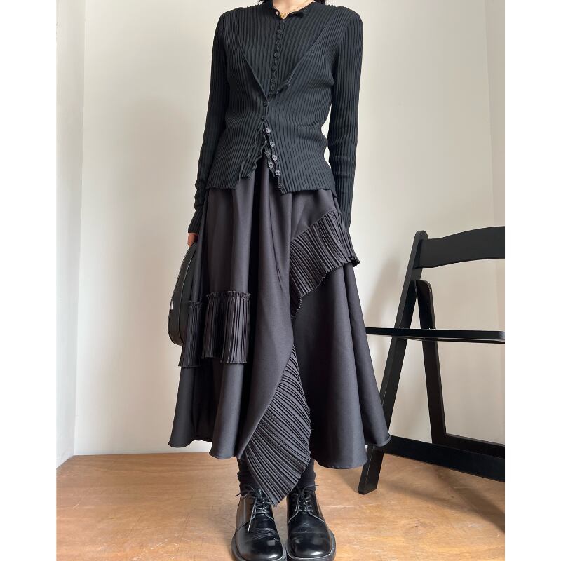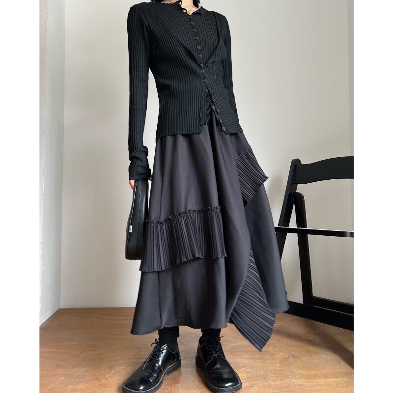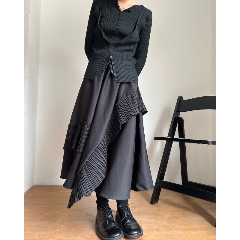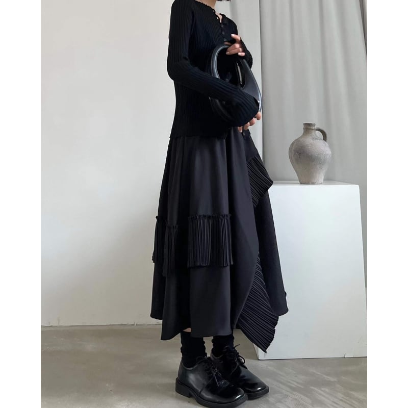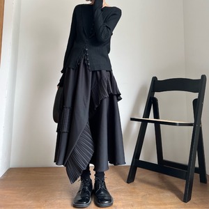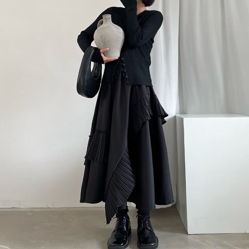 アシンメトリーなティアードデザインに、立体的なプリーツを大胆に配したロングスカート。