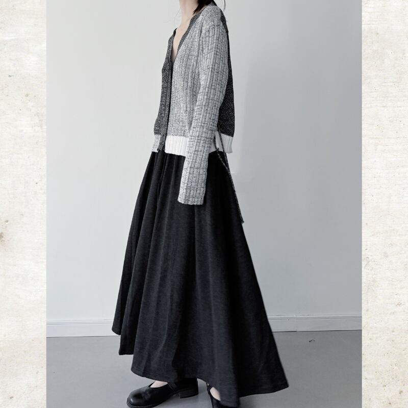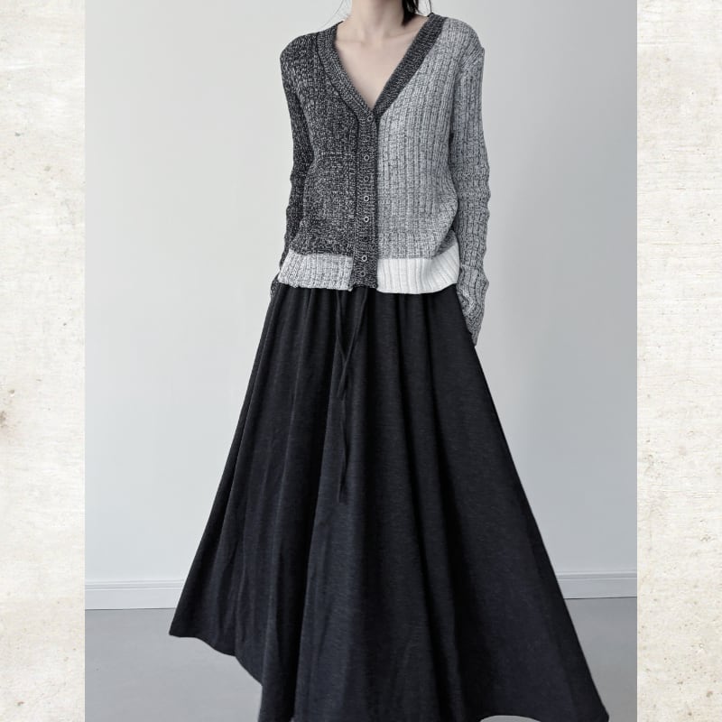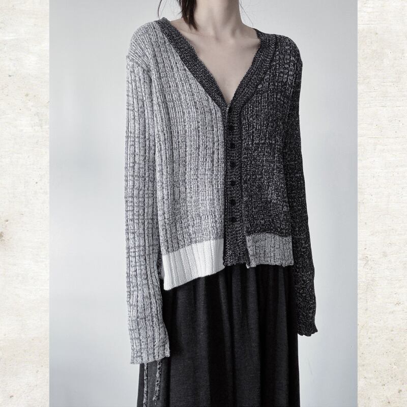 左右で色を大胆に切り替えたバイカラーのニットカーディガン。