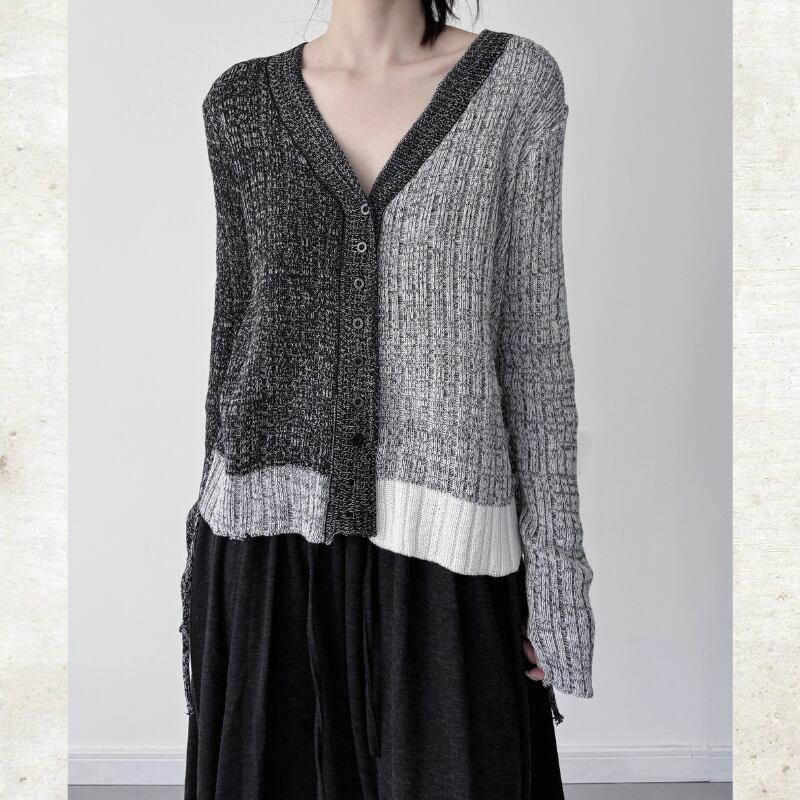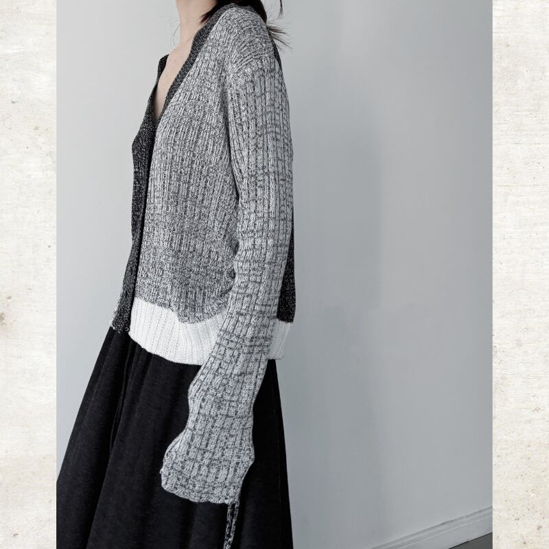 Bi-Color Mixed Knit V-Neck Cardigan H0366