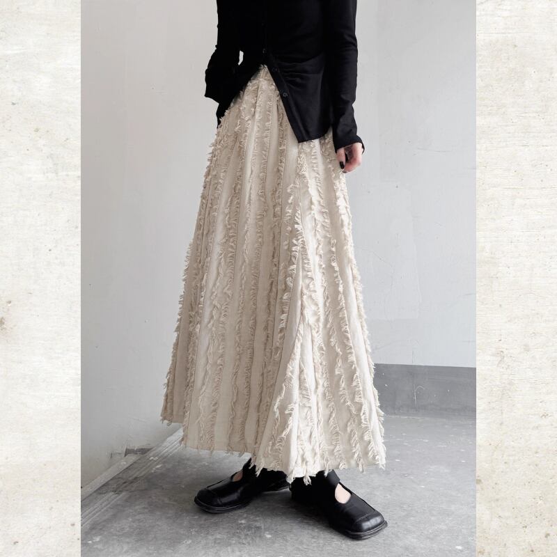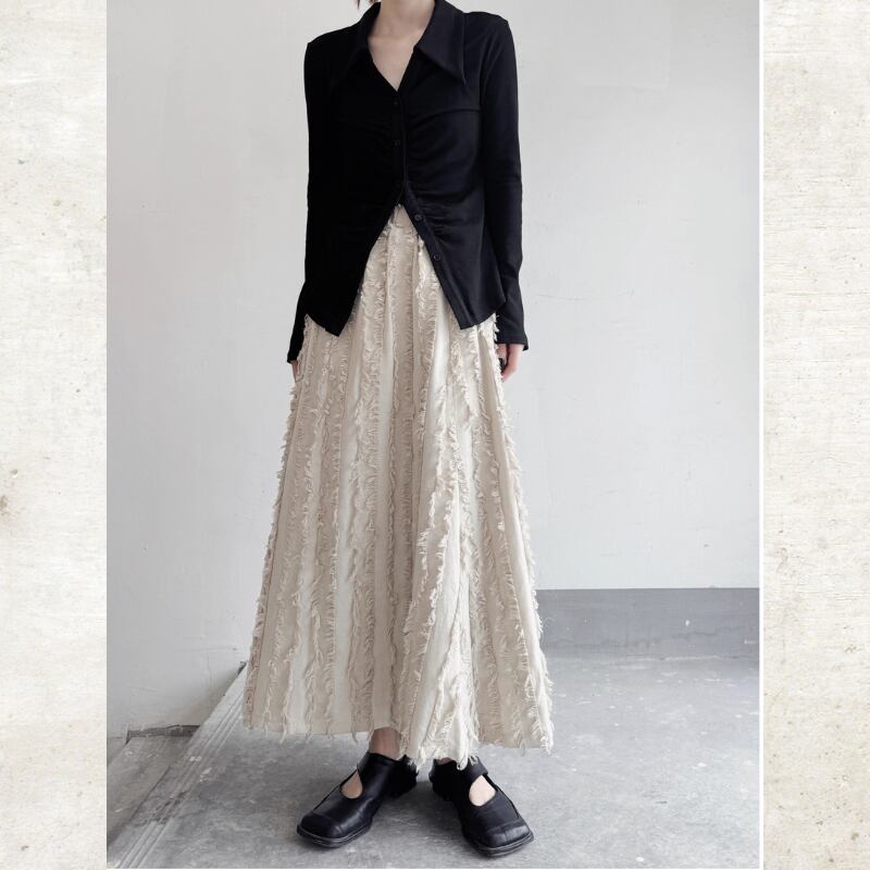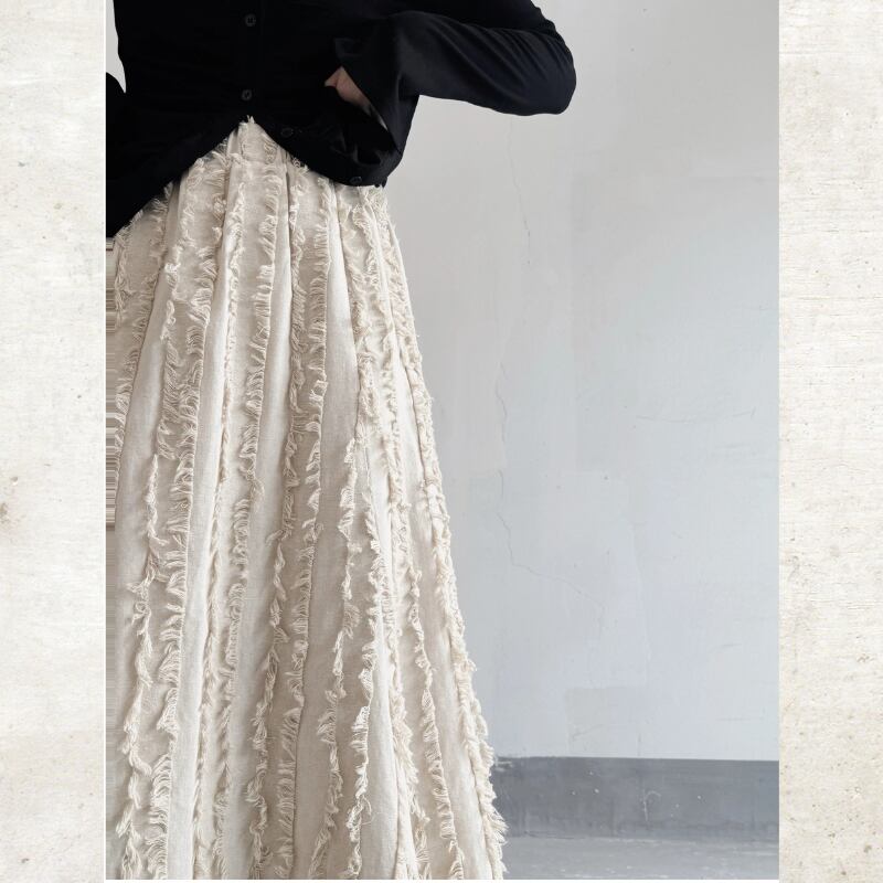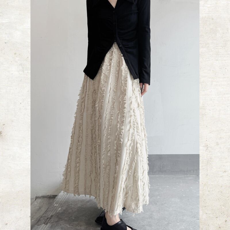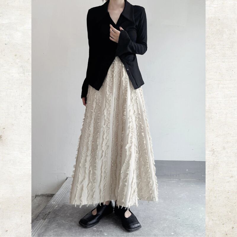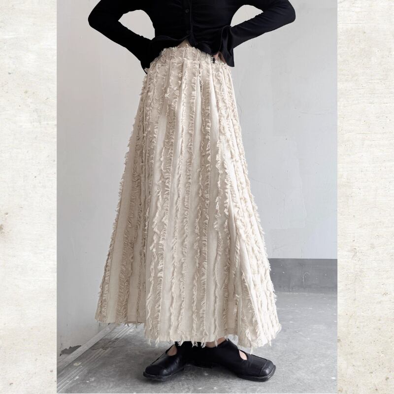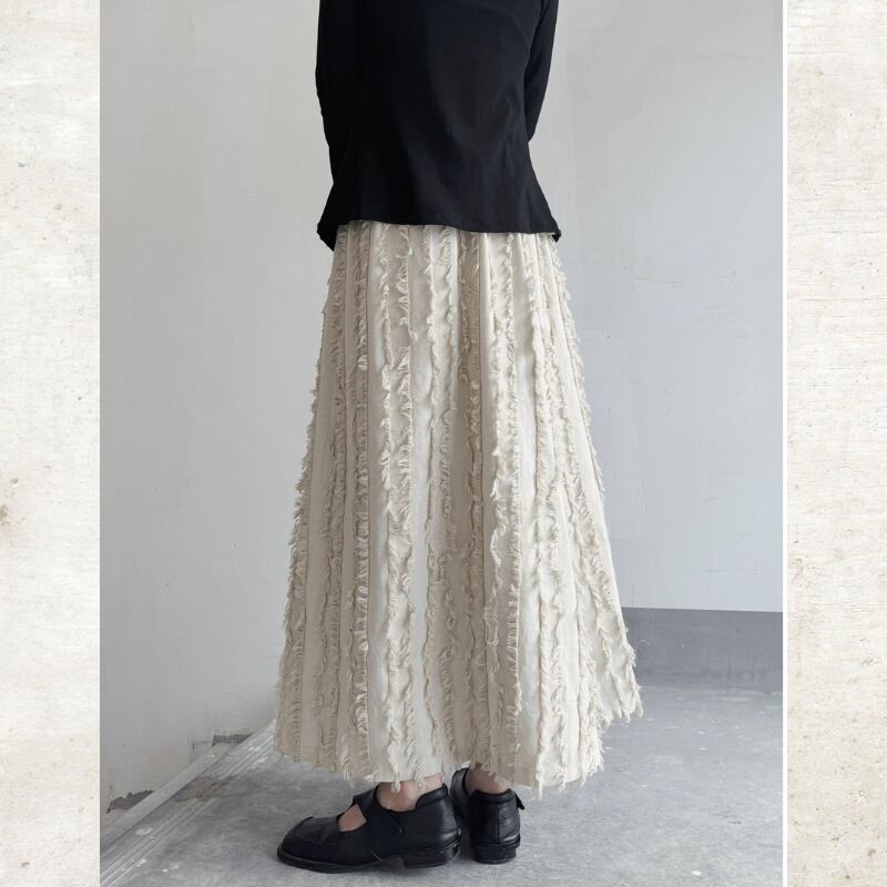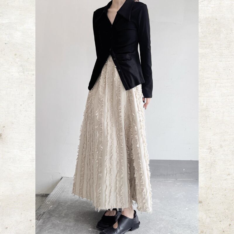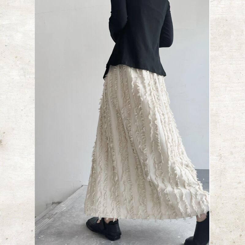 流れるようなロングフレアシルエットに、フリンジストライプのテクスチャーを重ねたモードな一着。