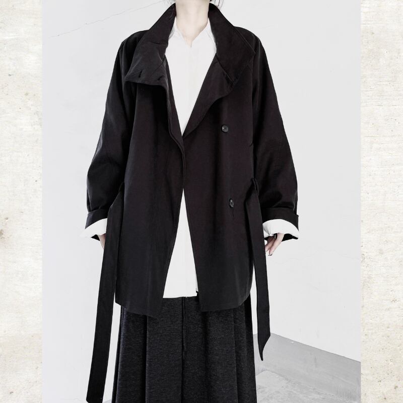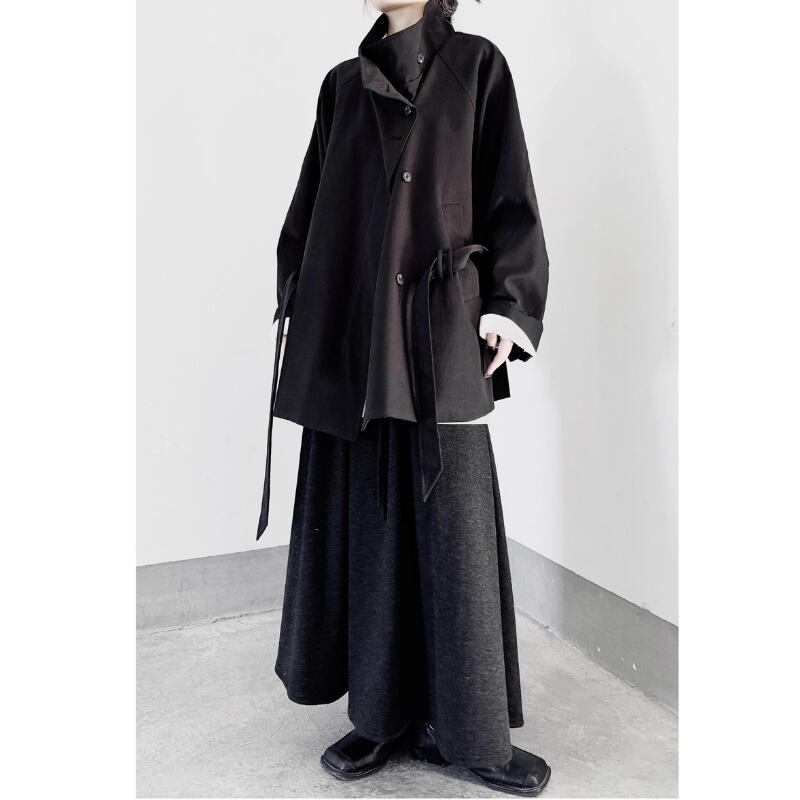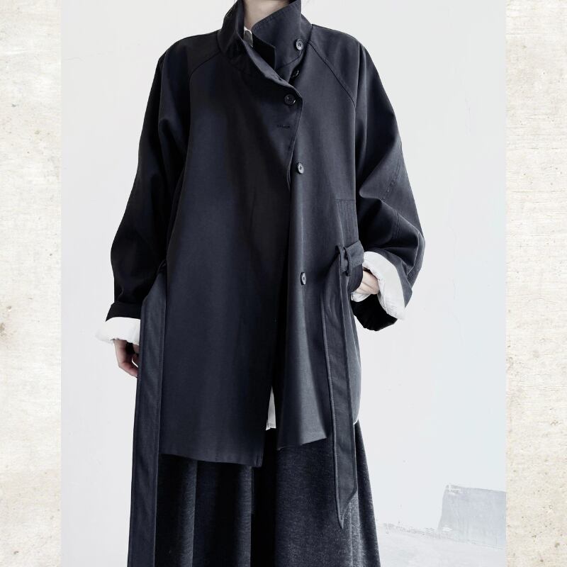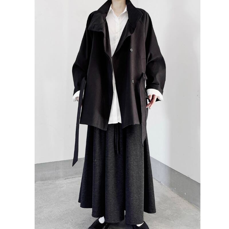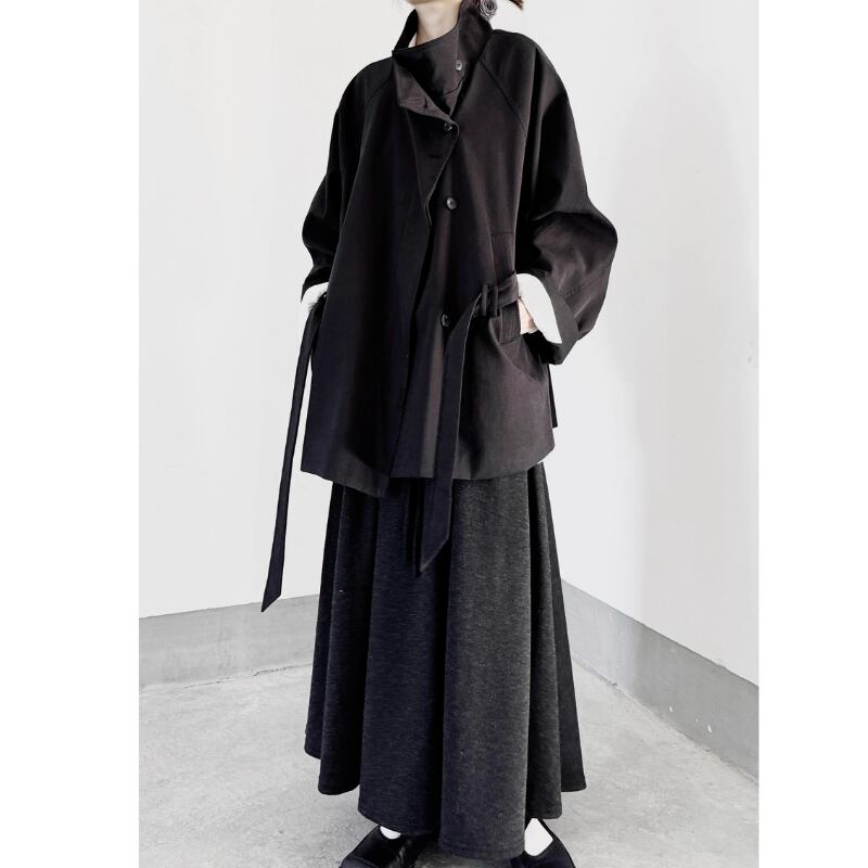 襟を立ててスタンドカラーとしても着用でき、ウエストベルトでシルエットをアレンジ可能。