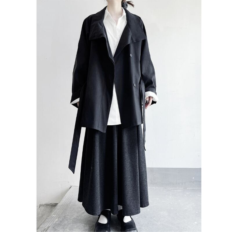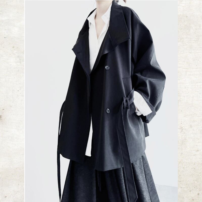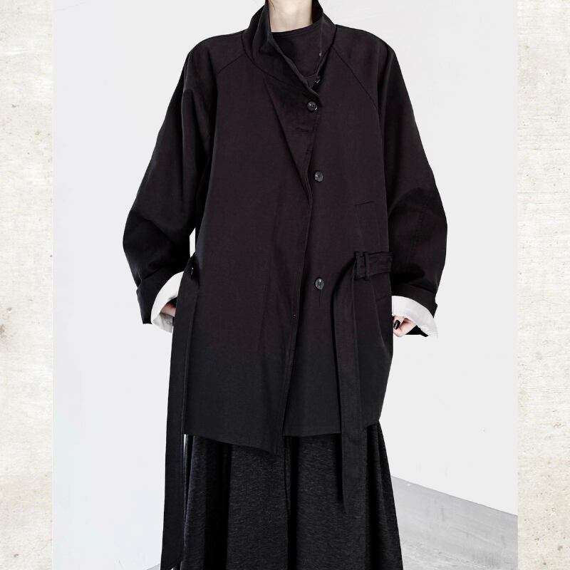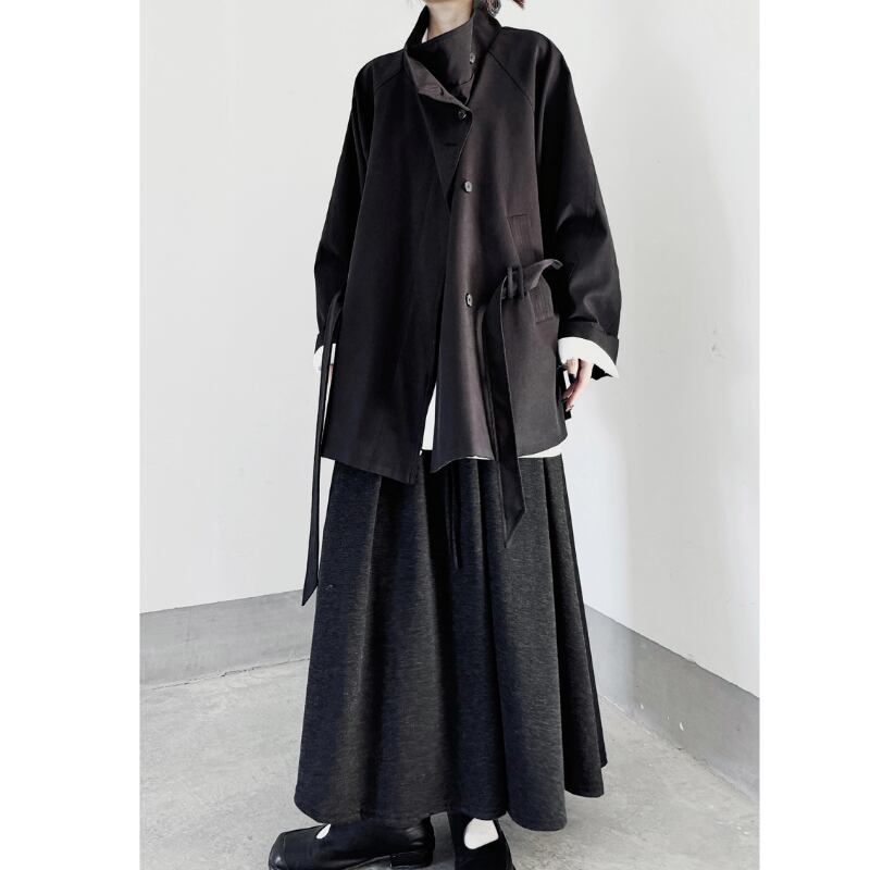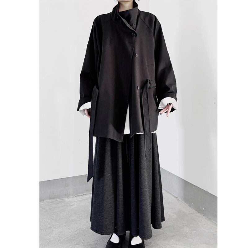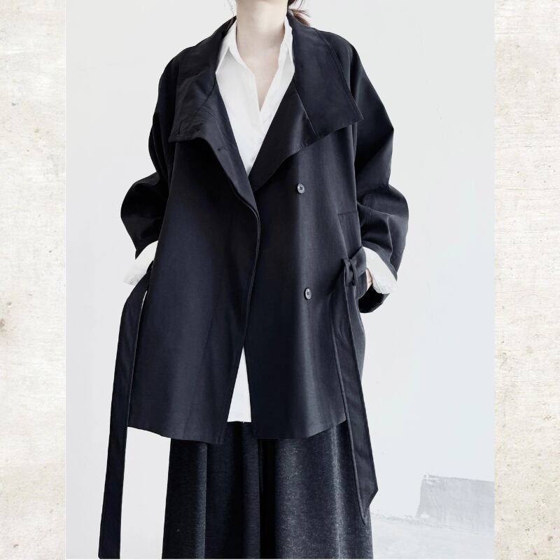 襟を立ててスタンドカラーとしても着用でき、ウエストベルトでシルエットをアレンジ可能。