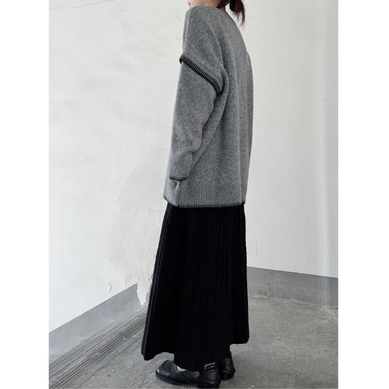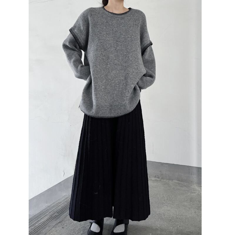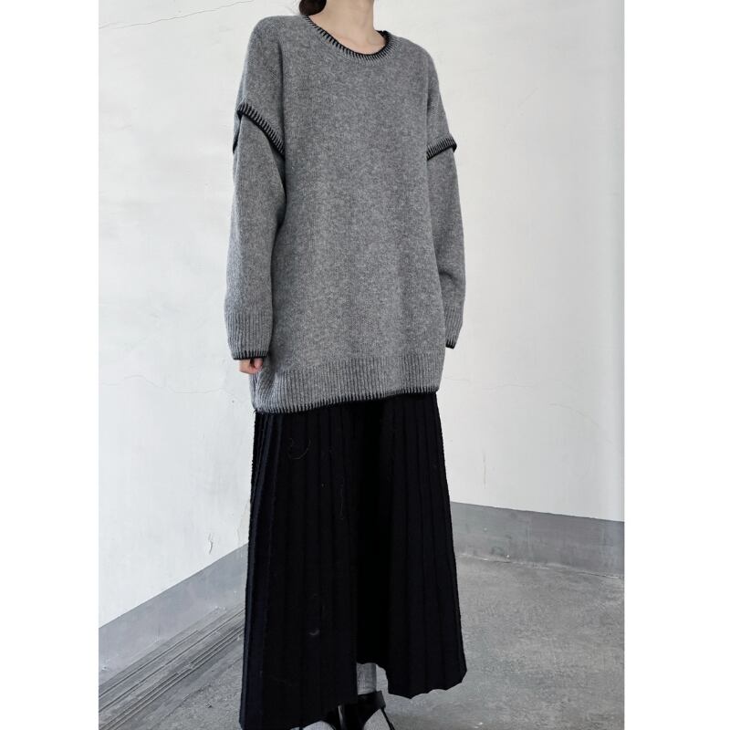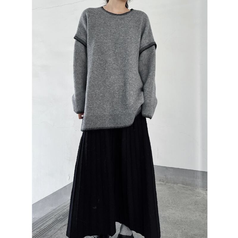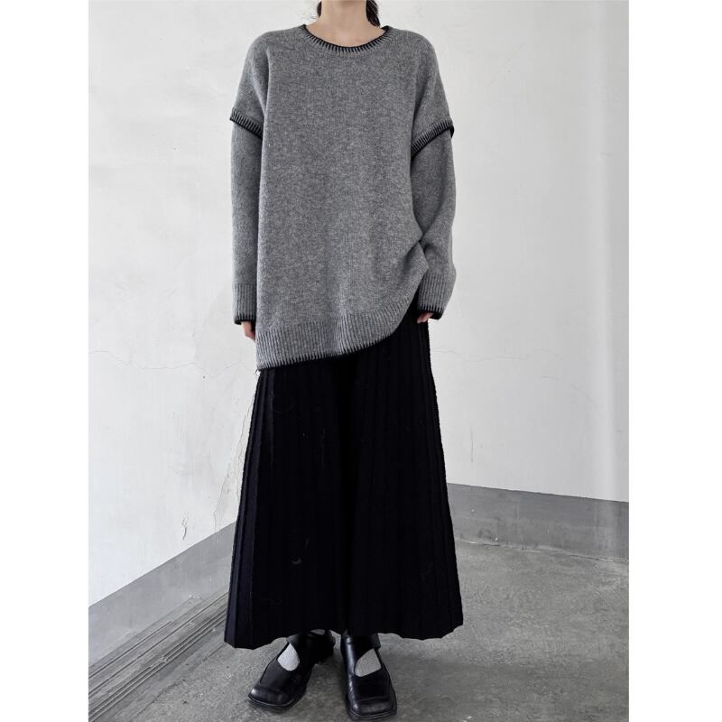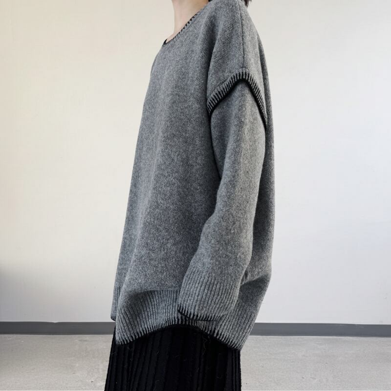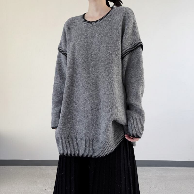 ゆったりとしたルーズフィットのシルエットに、コントラストの効いた黒のステッチを施したモードなニット。
