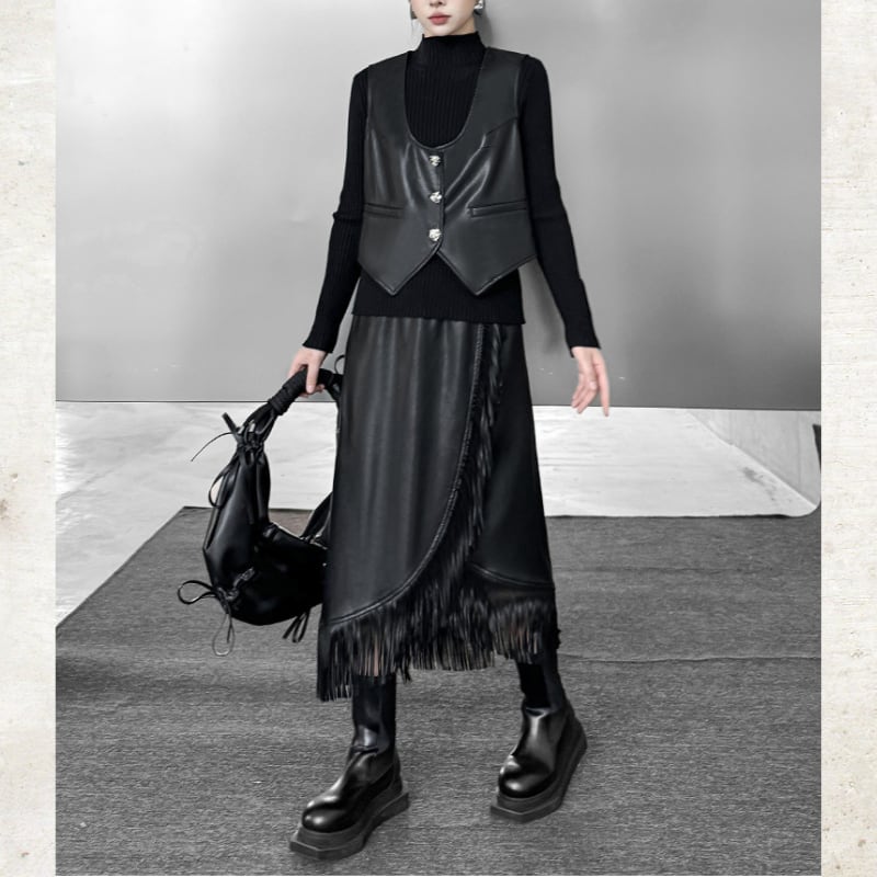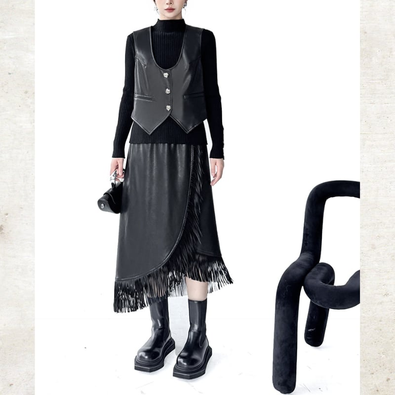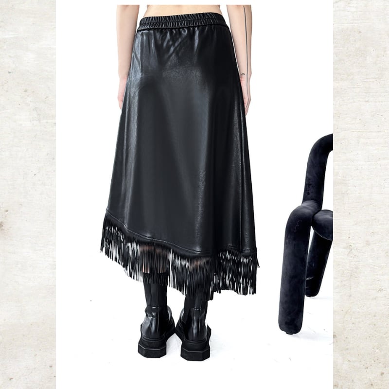 エコレザーのクールな質感に、歩くたびに揺れるフリンジがモードなリズムを生み出すスカート。
