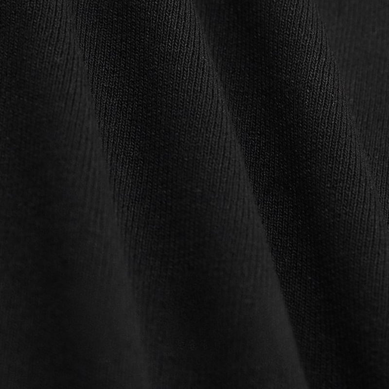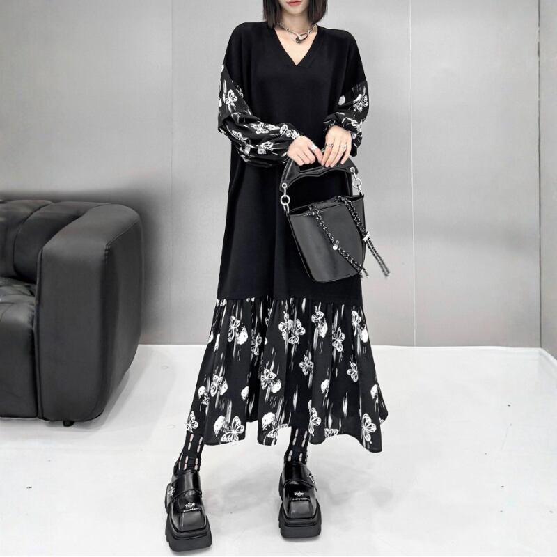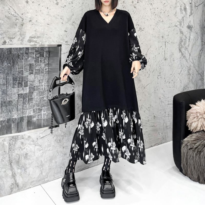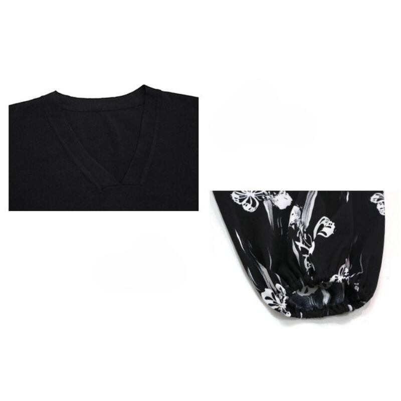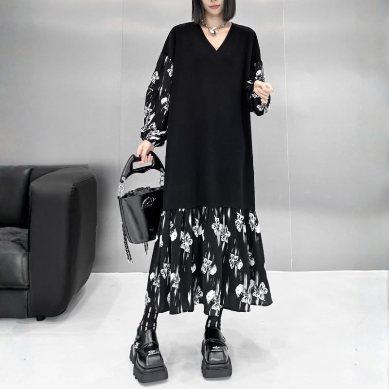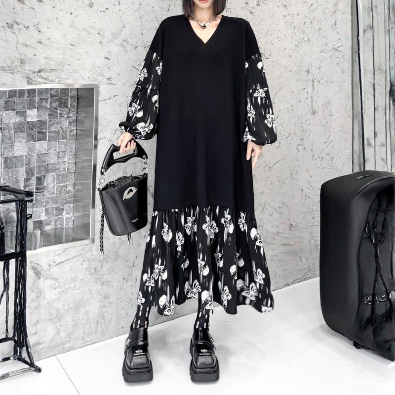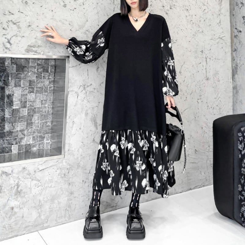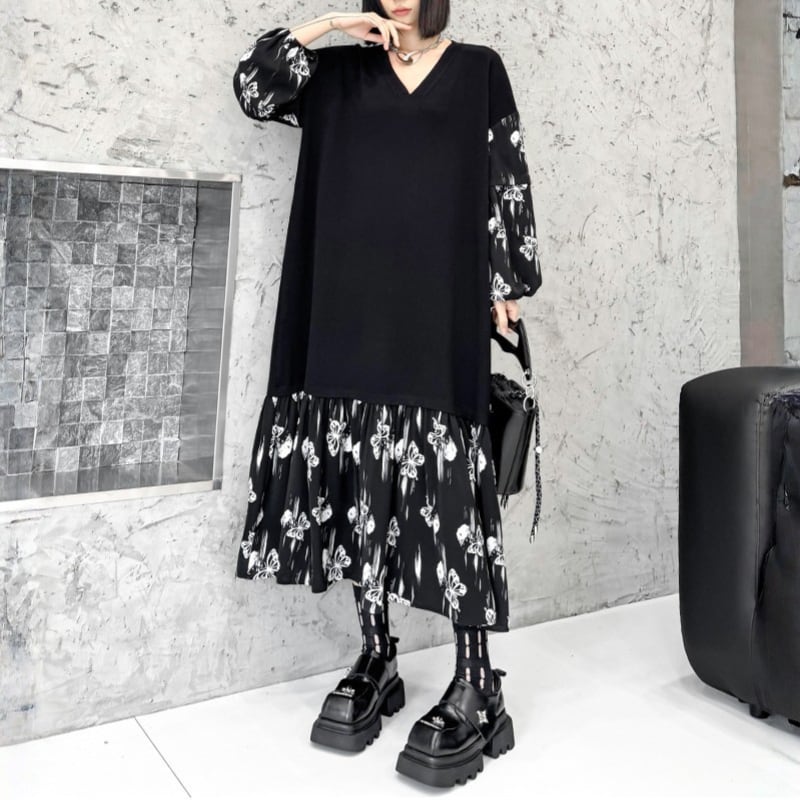 袖と裾に施された花柄の切り替えが、ミニマルなブラックにアートピースのような遊び心をプラス。