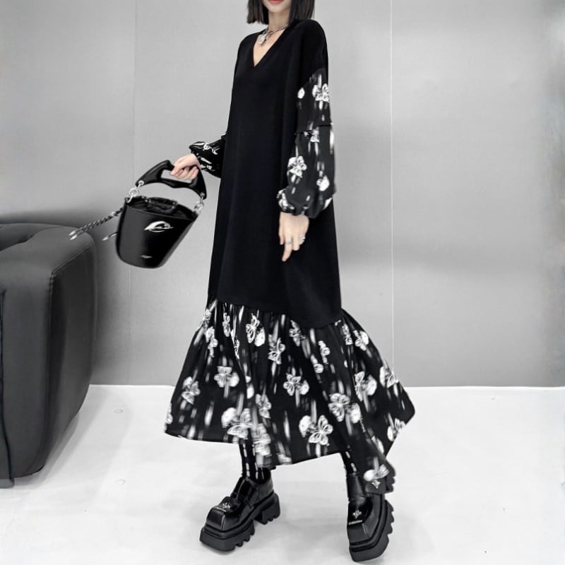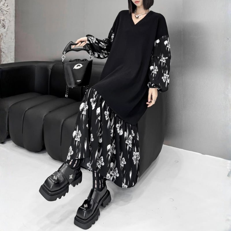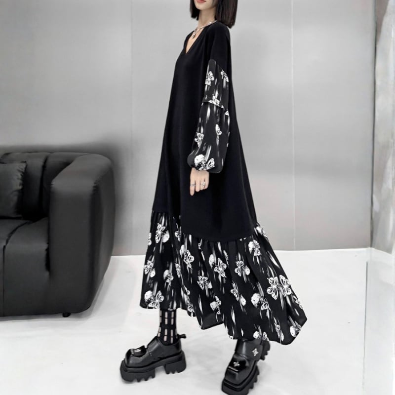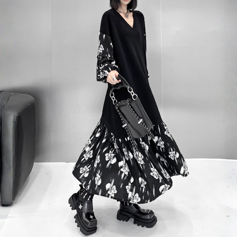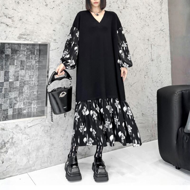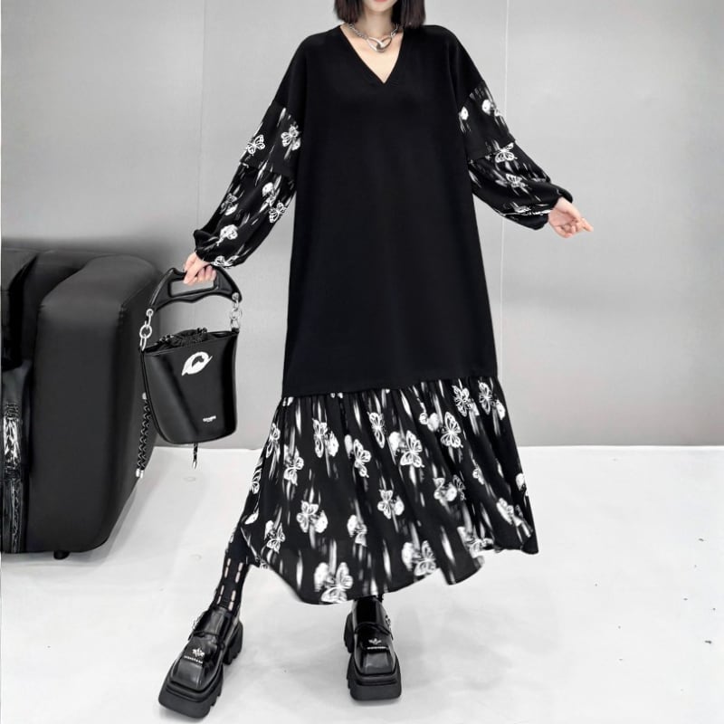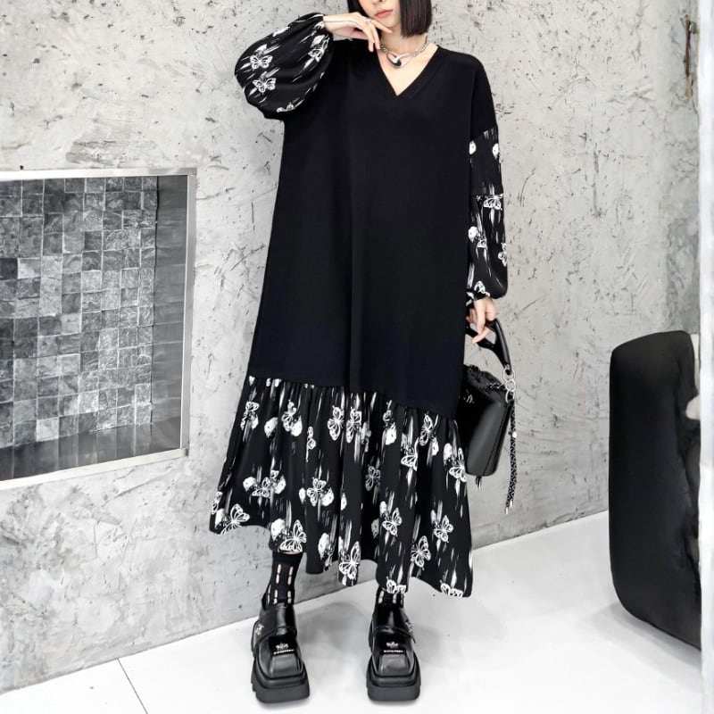 ゆったりとしたオーバーサイズのシルエットに、Vネックのシャープさが映えるロングワンピース。