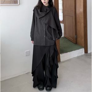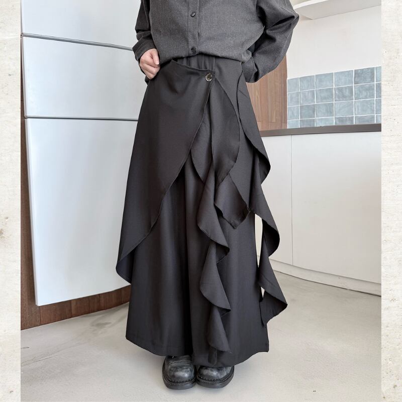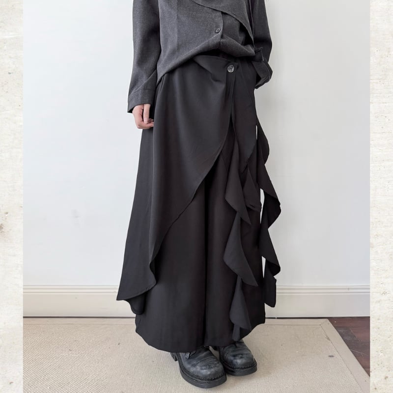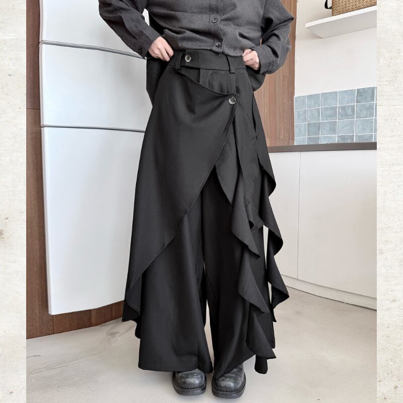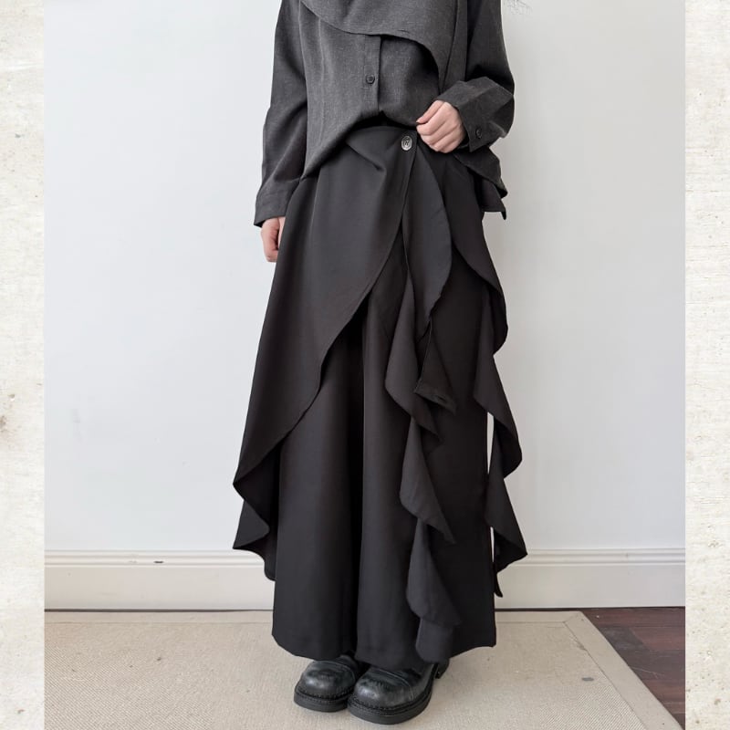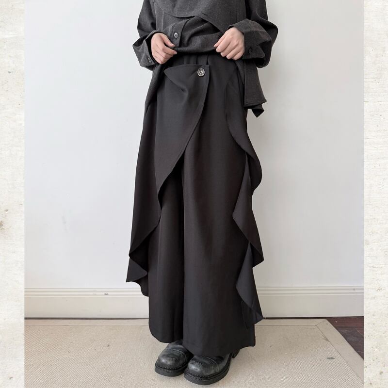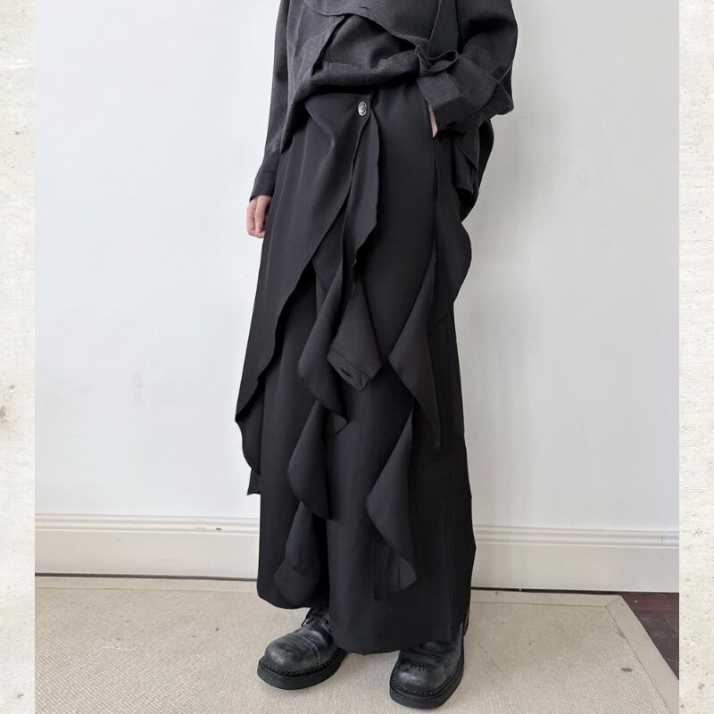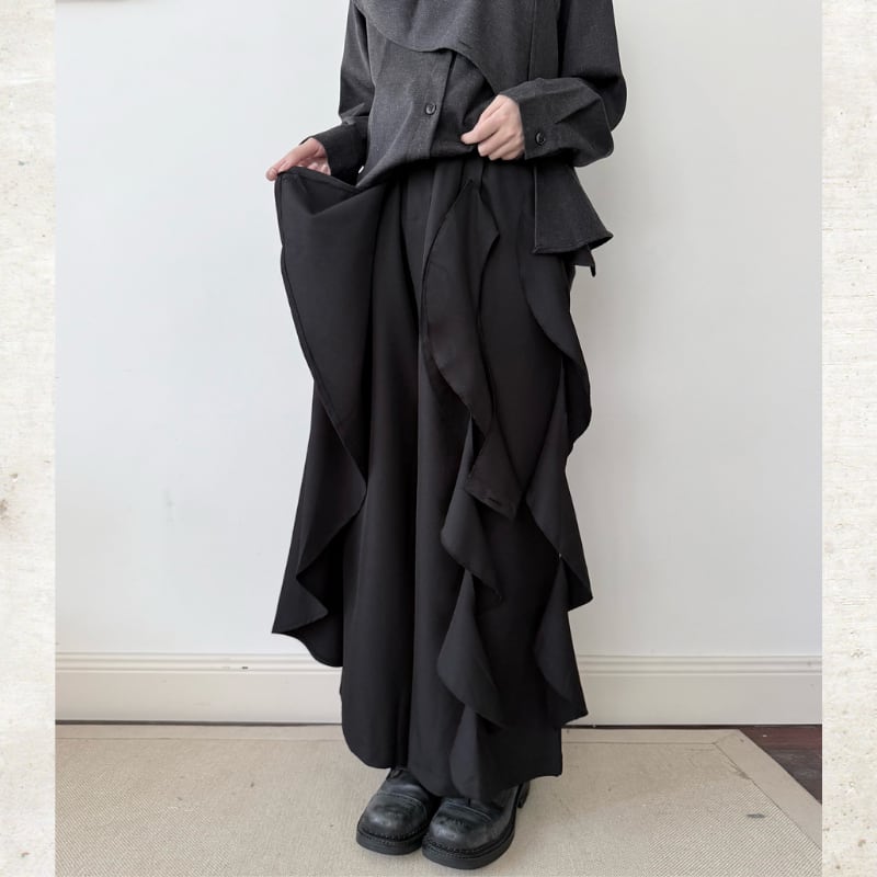 動くたびに揺れるアシンメトリーなフリルが目を惹く、スーパーワイドパンツ。