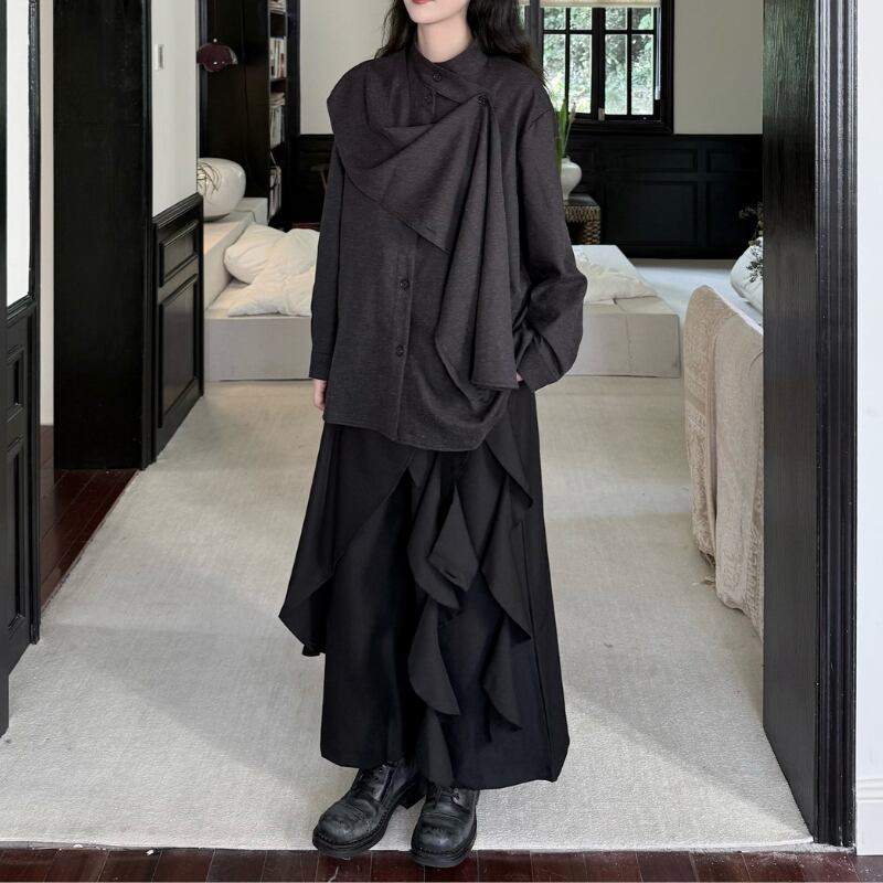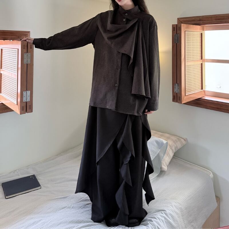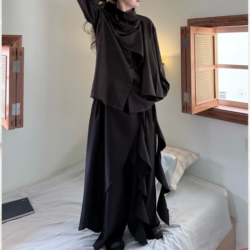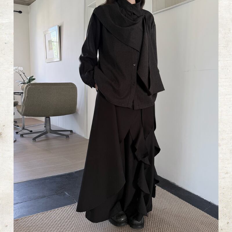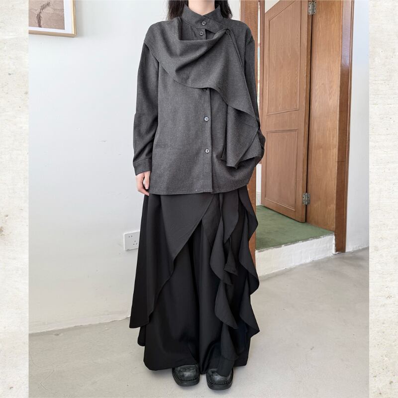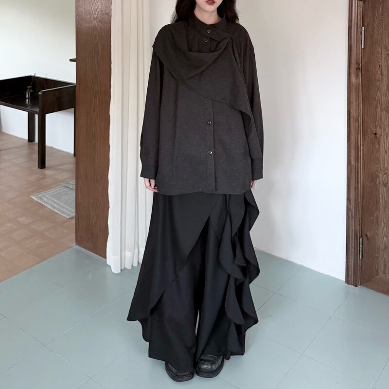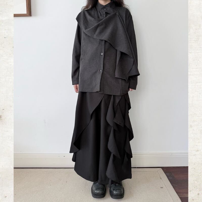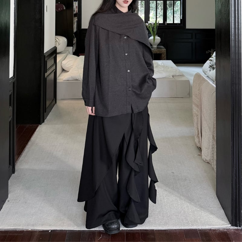 動くたびに揺れるアシンメトリーなフリルが目を惹く、スーパーワイドパンツ。
