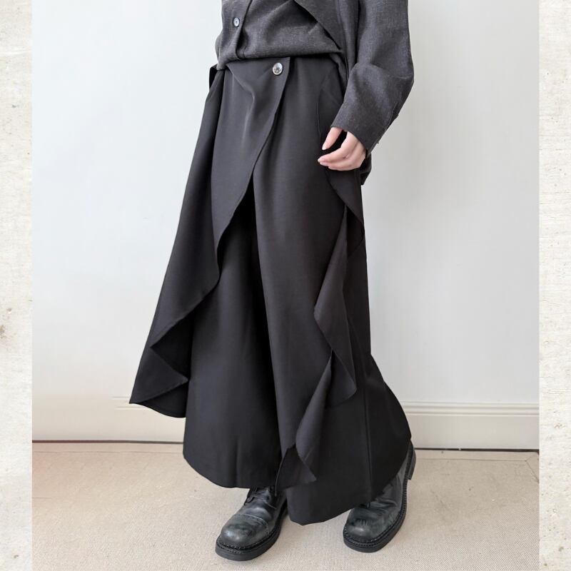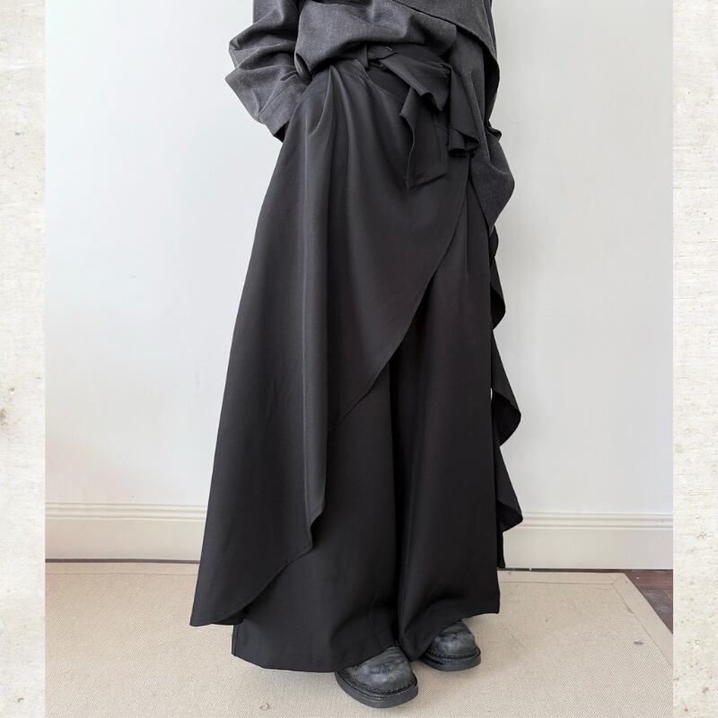 フロントのラップデザインがスカートのような豊かな表情を演出し、モードなスタイリングを完成させます。