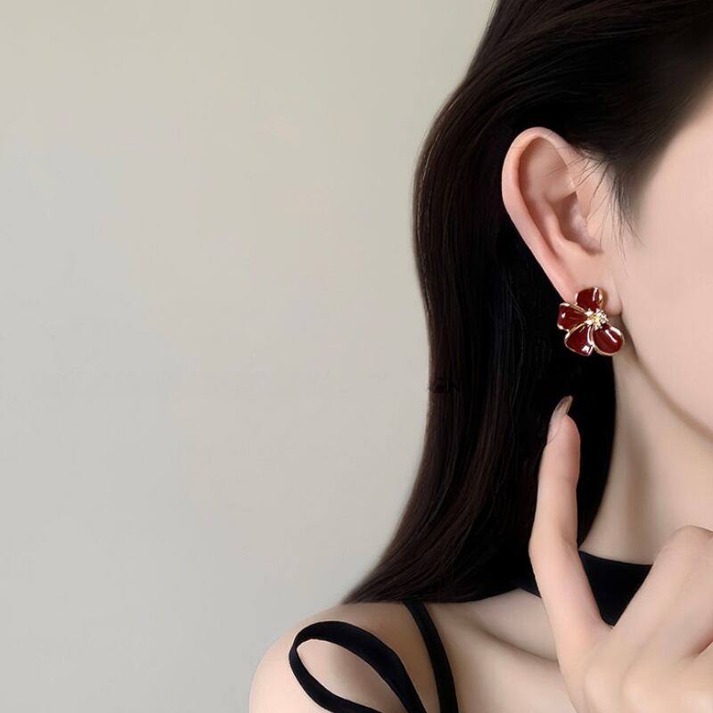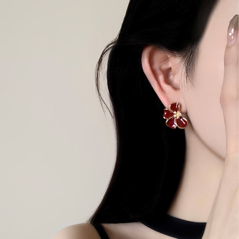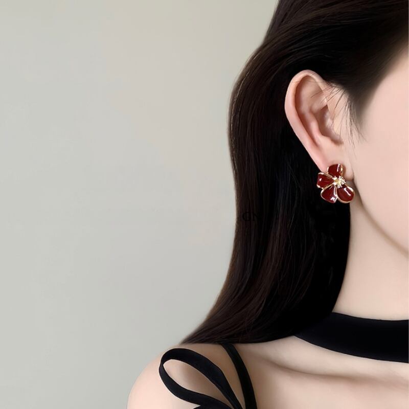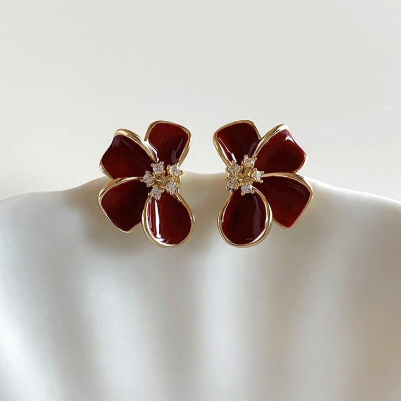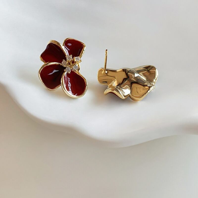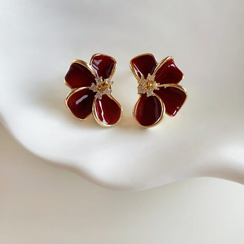 エナメルの質感とゴールドの縁取りが際立つ、立体的なフラワーモチーフピアス。