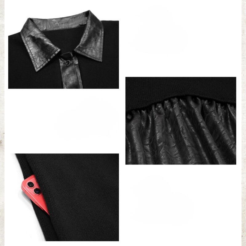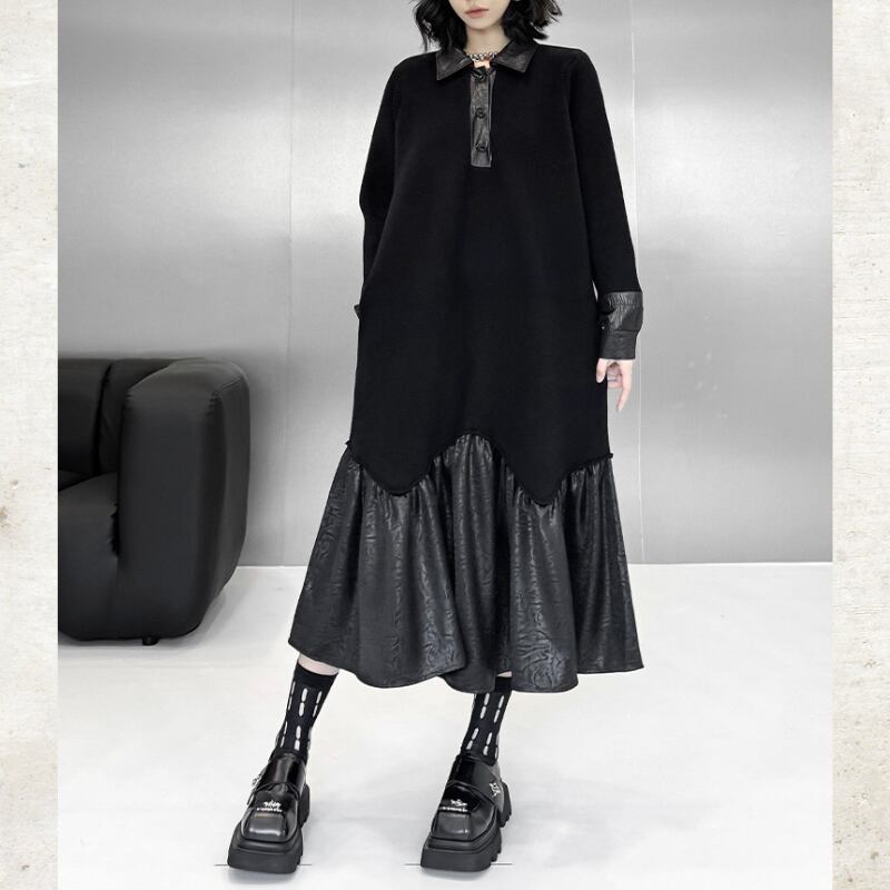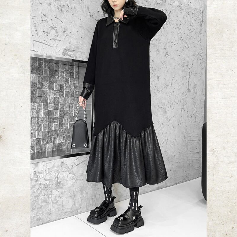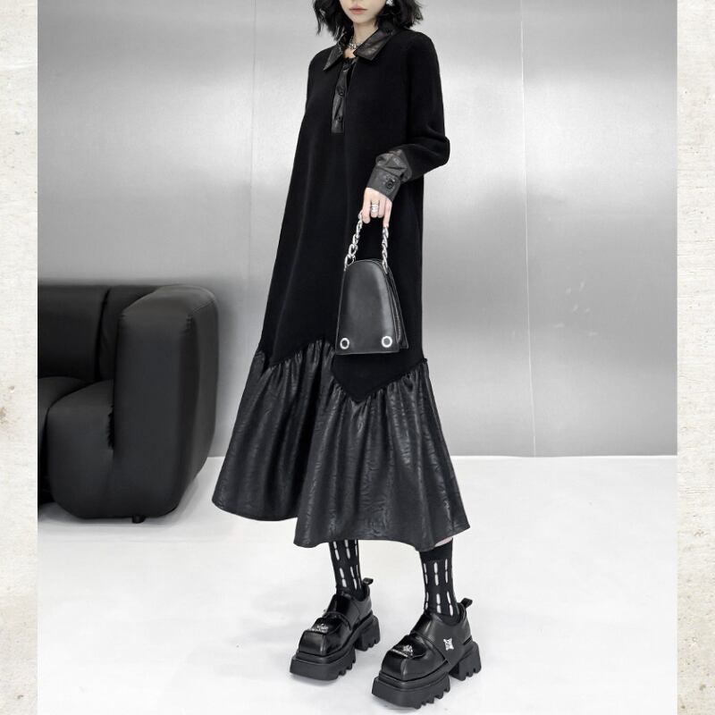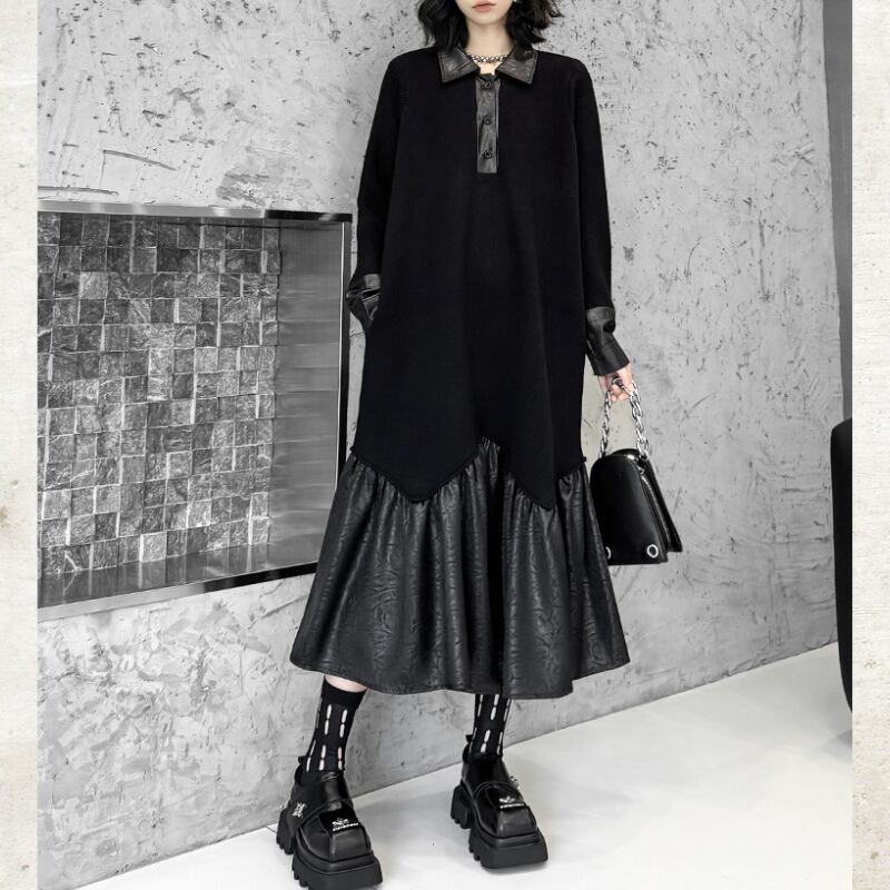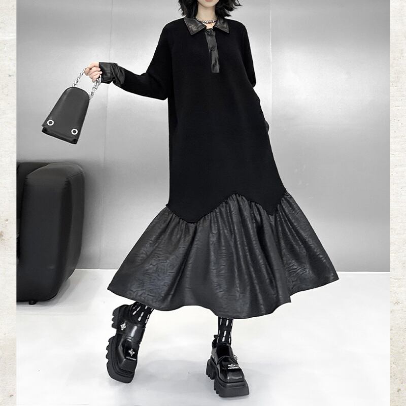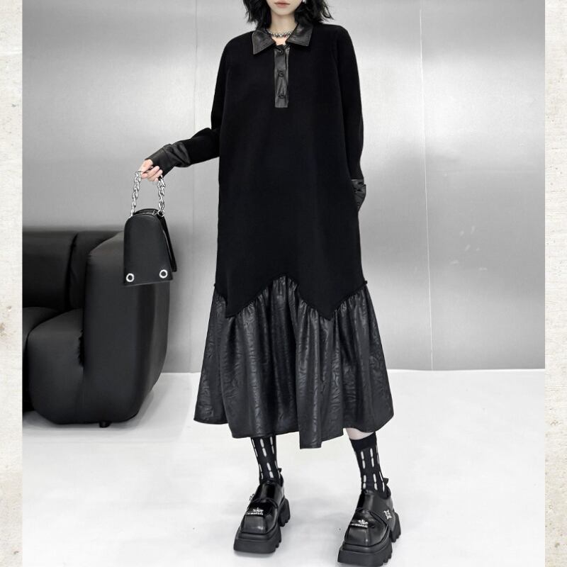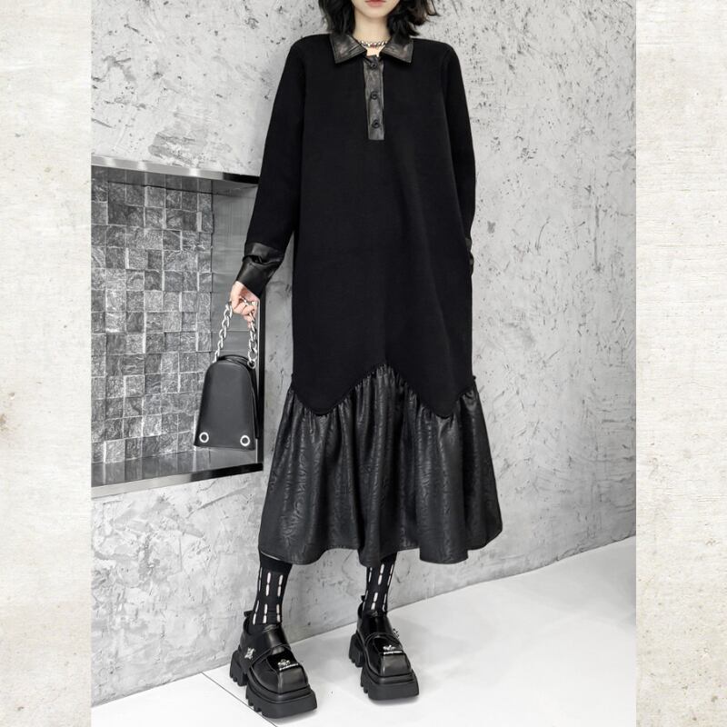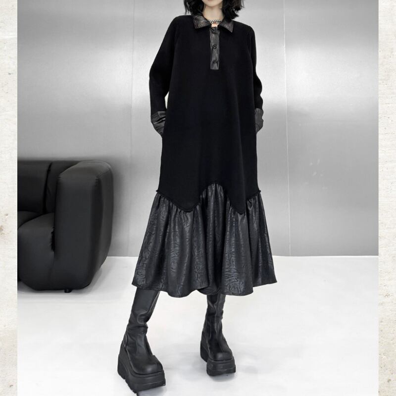 Polo Collar Leather Patchwork Long Dress H0383