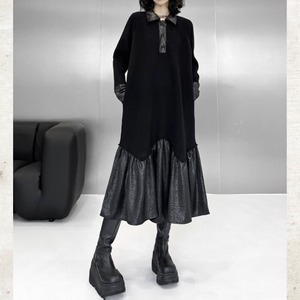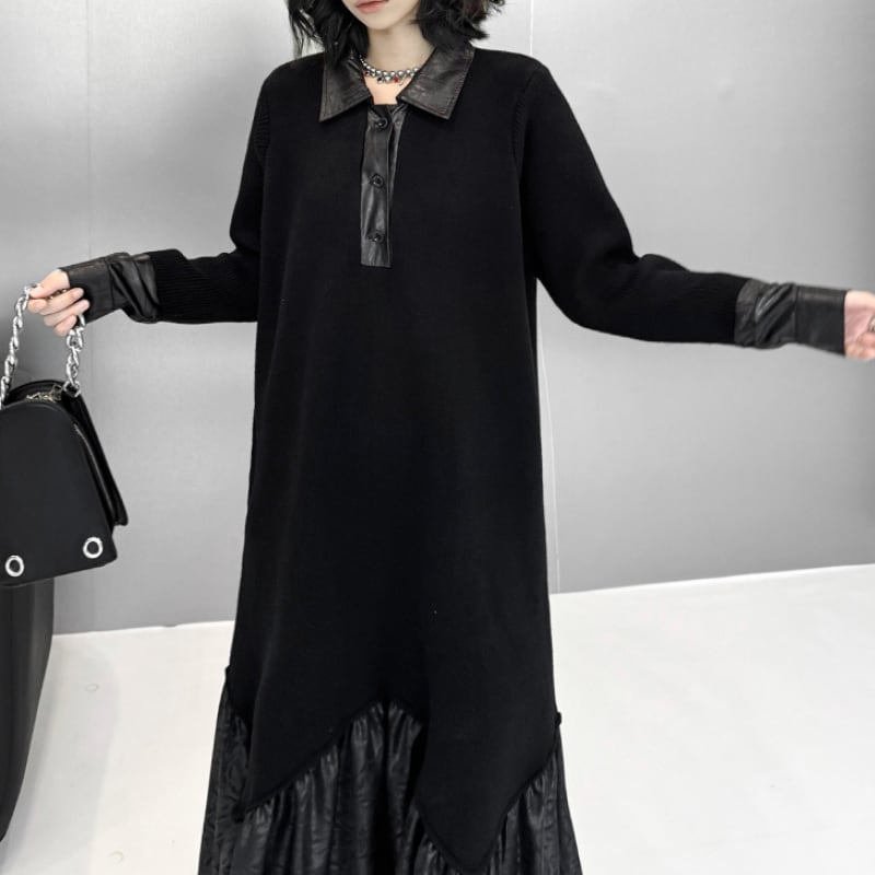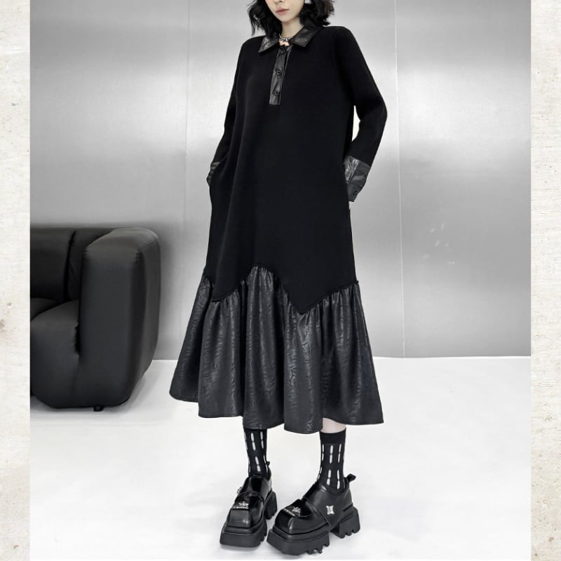 ポロカラーレザー切替ロングワンピース