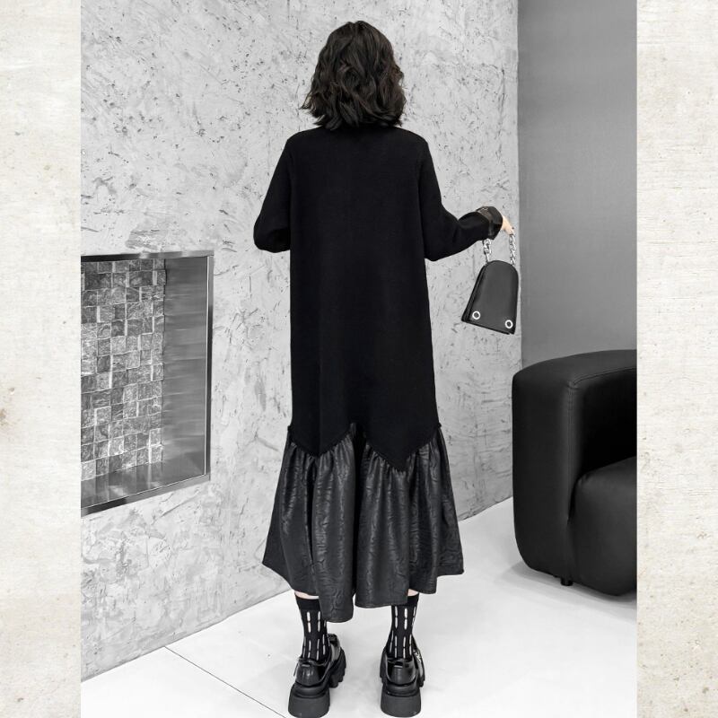 柔らかなニット素材に、クロコ調の型押しが施されたエコレザーを大胆に切替えたモードなワンピース。