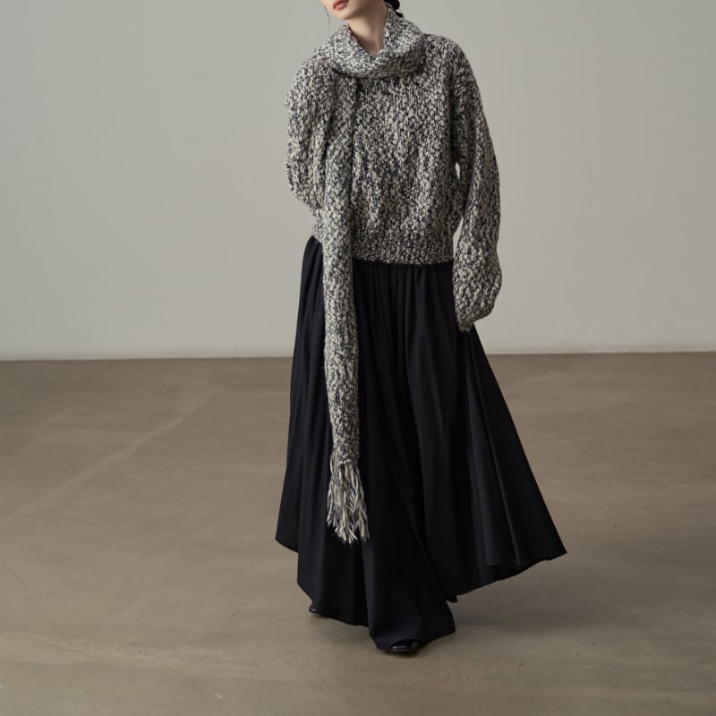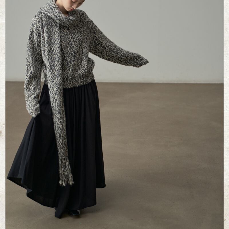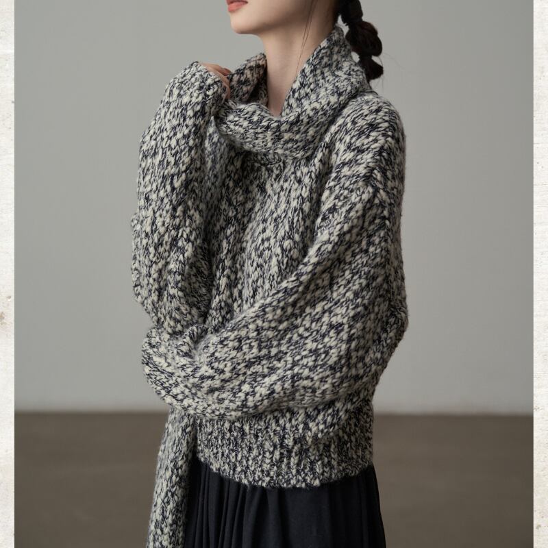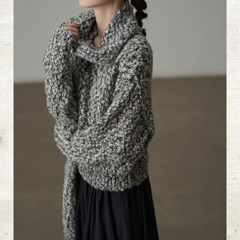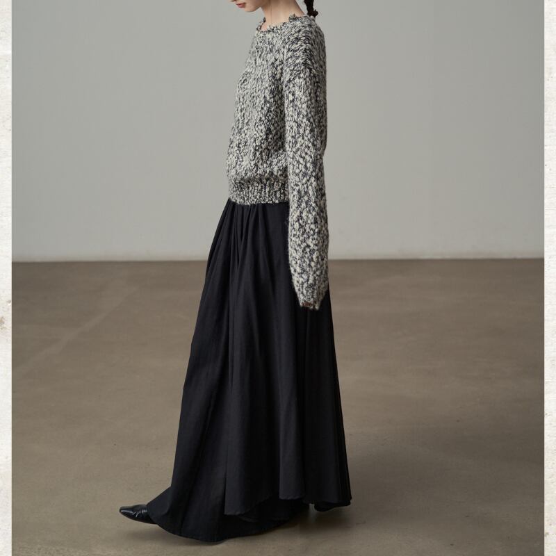 白と黒のミックスヤーンがシックな表情を見せる、ざっくりとした編み地のルーズニット。