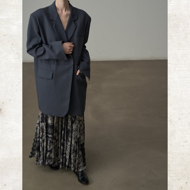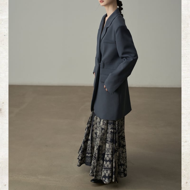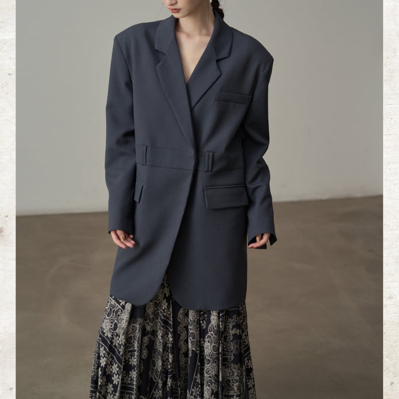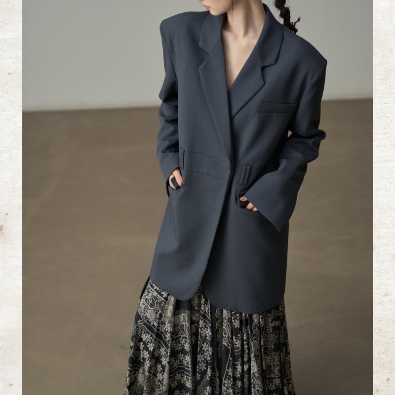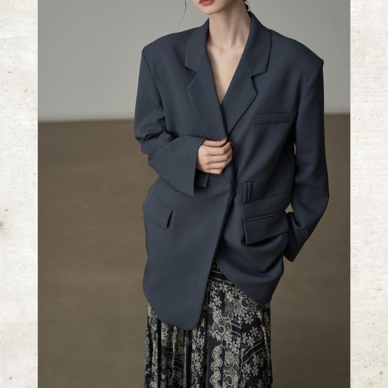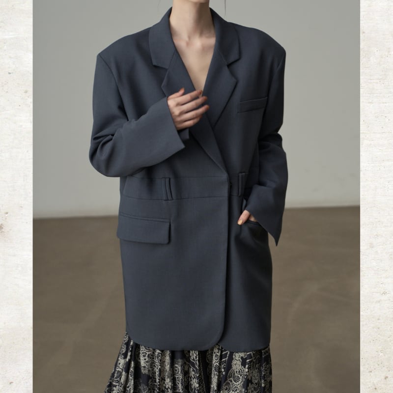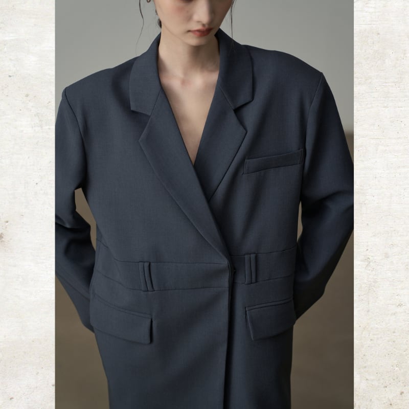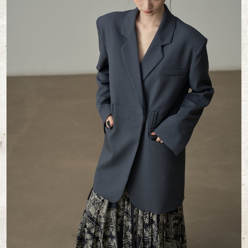 ビッグショルダーと深く開いたダブルブレスト風のデザインが、モードな存在感を放ちます。