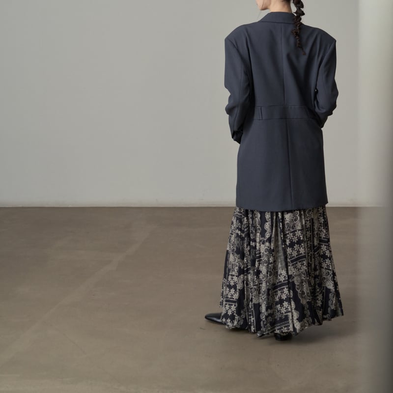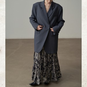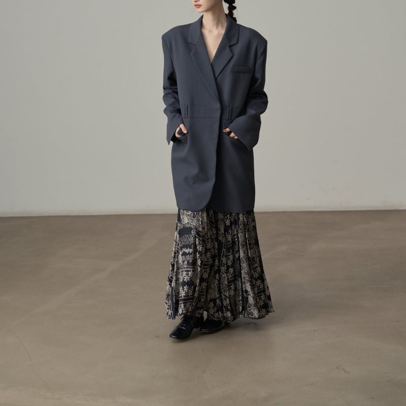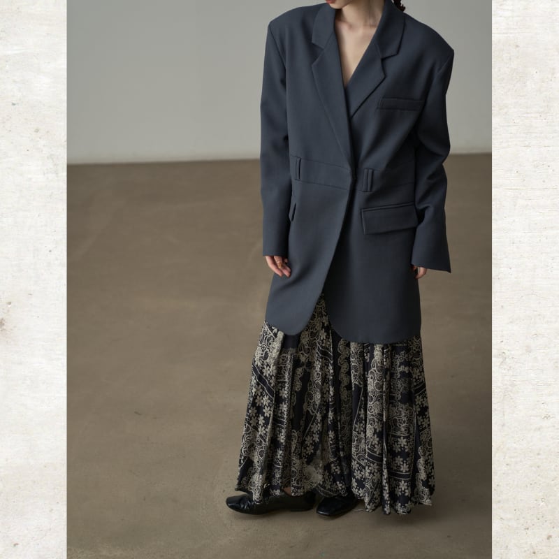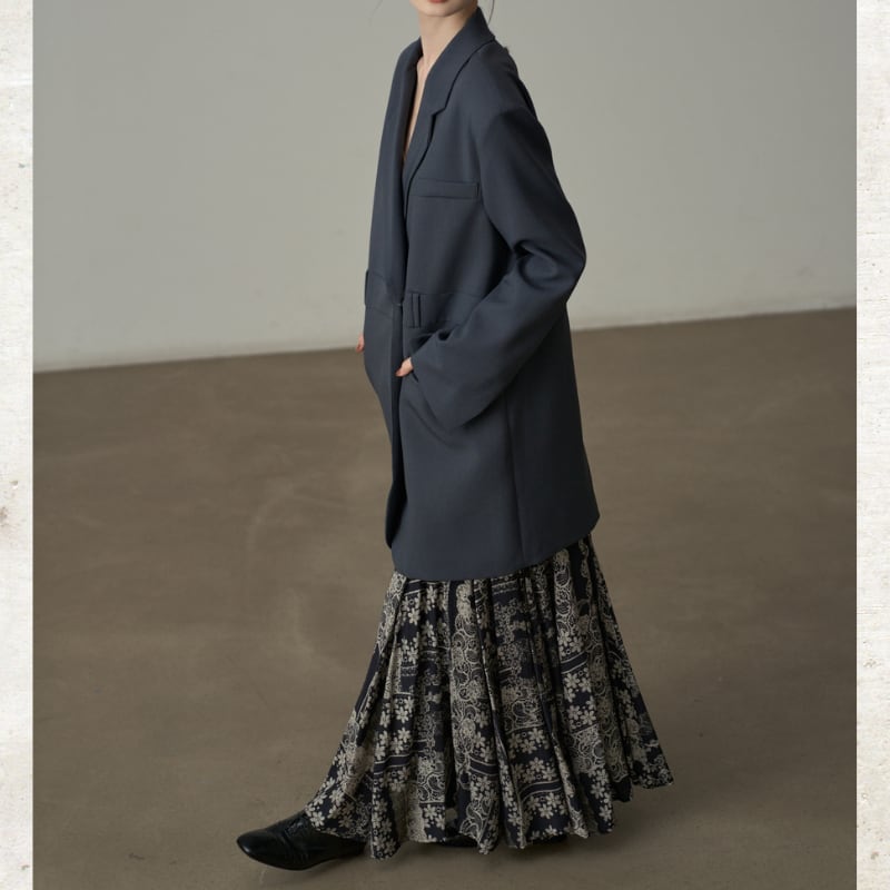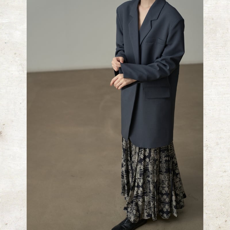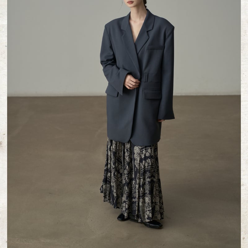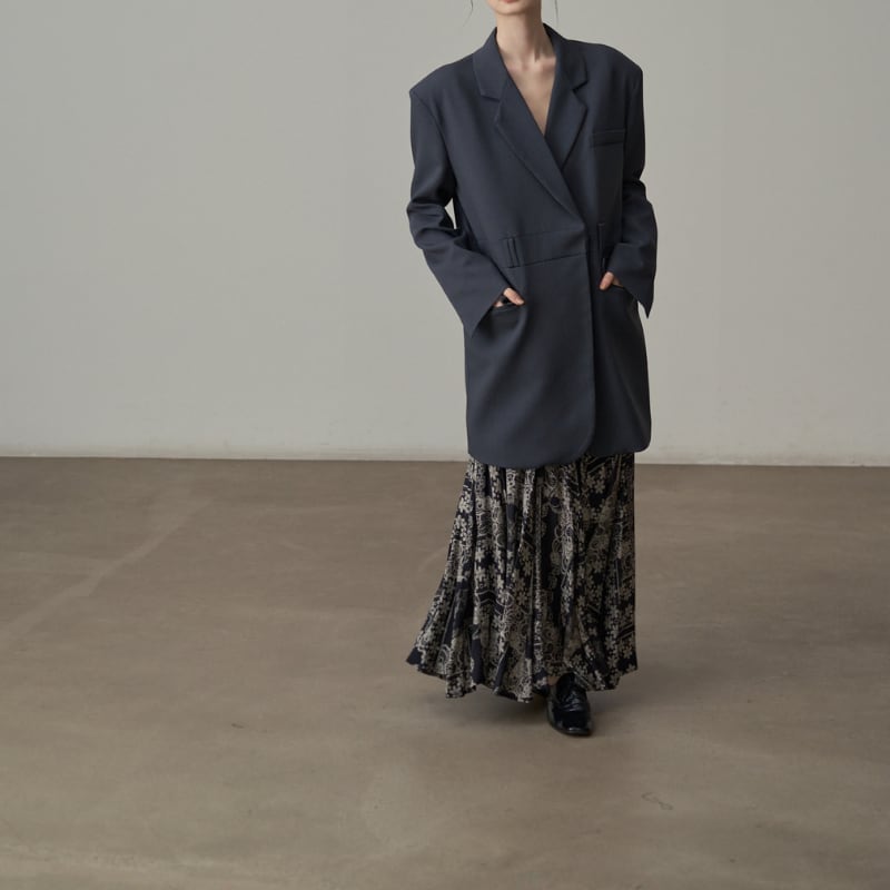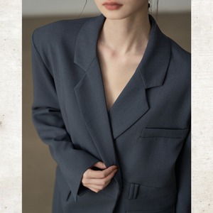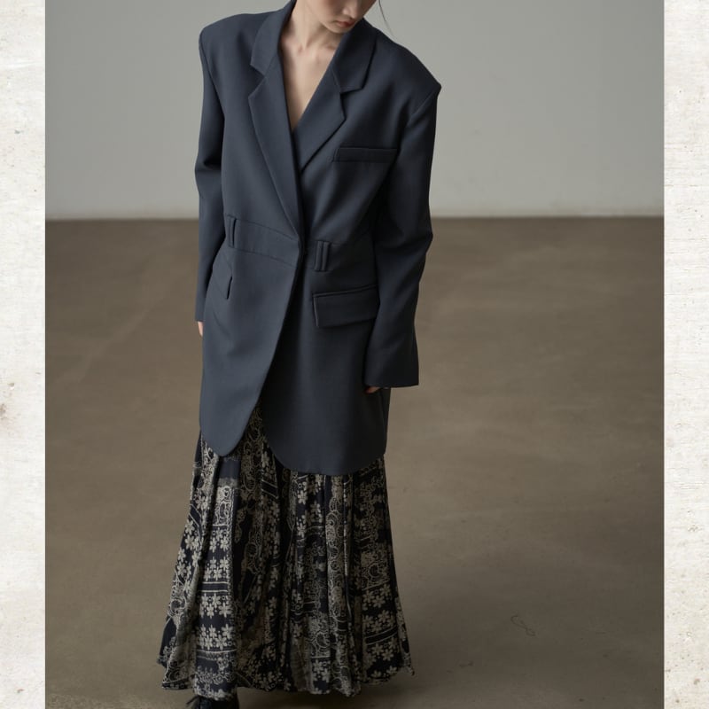 ビッグショルダーと深く開いたダブルブレスト風のデザインが、モードな存在感を放ちます。