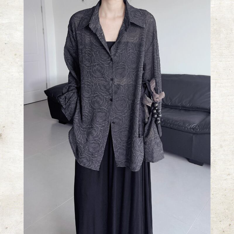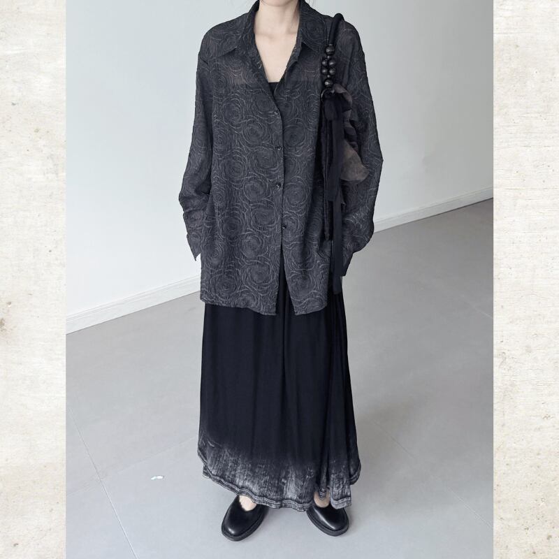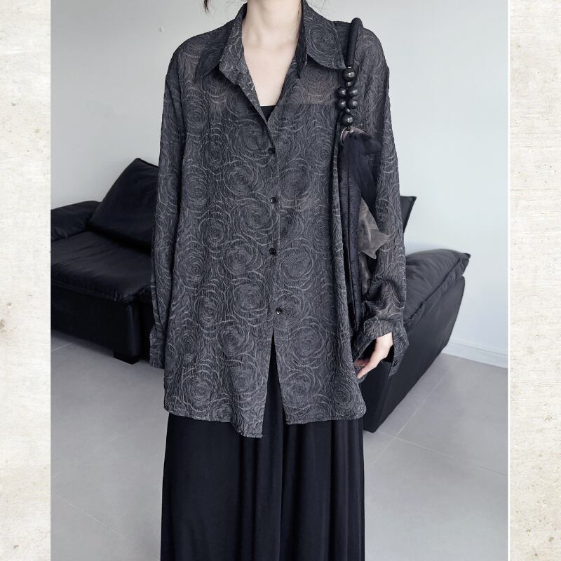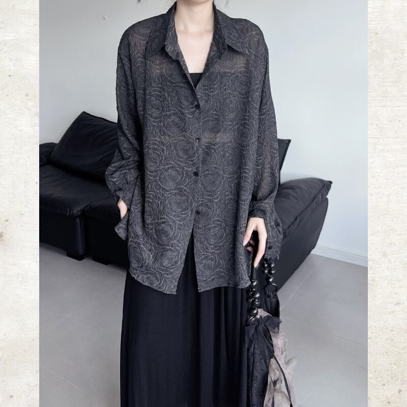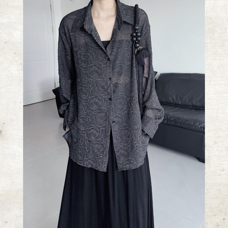 スモーキーなダークカラーにバラのジャガード織りが浮かび上がる、モードなシースルーシャツ。