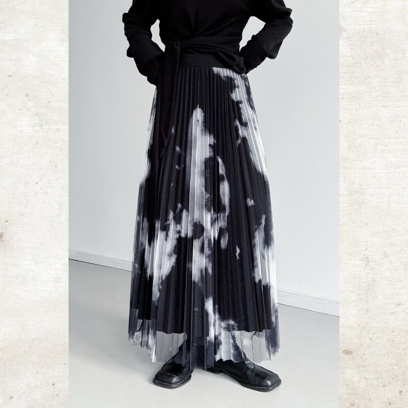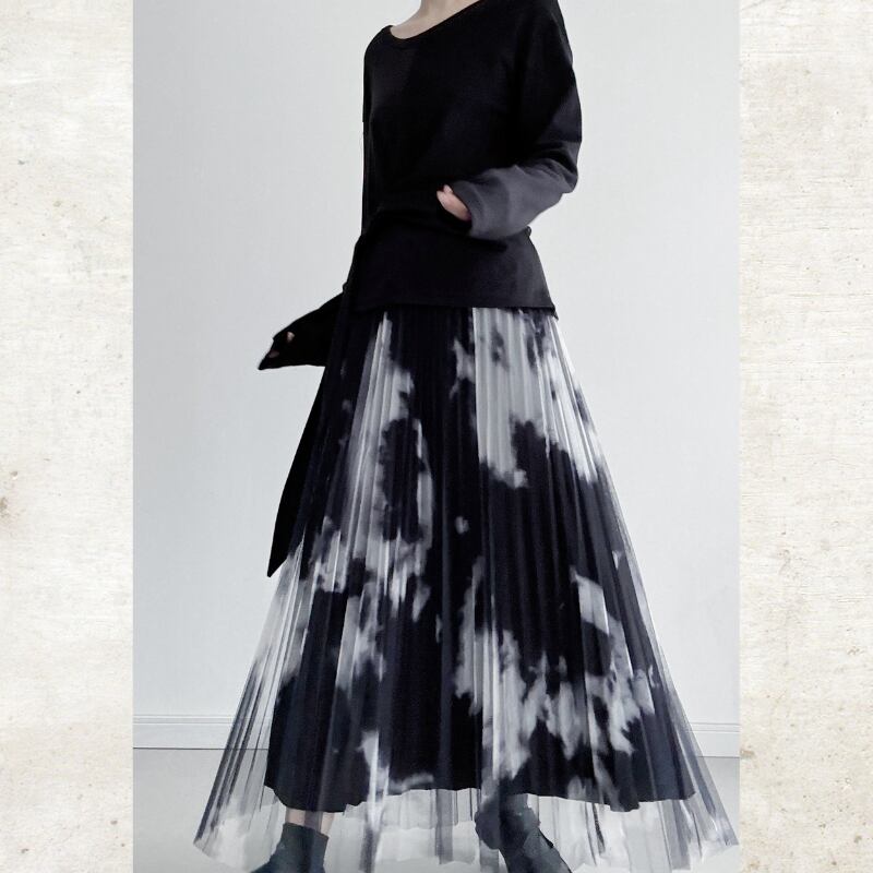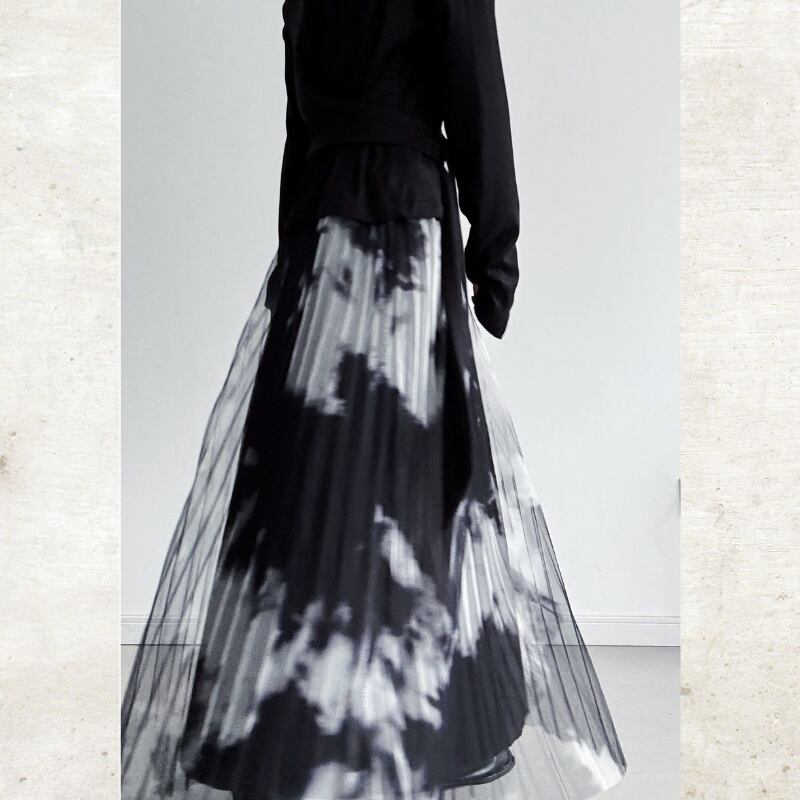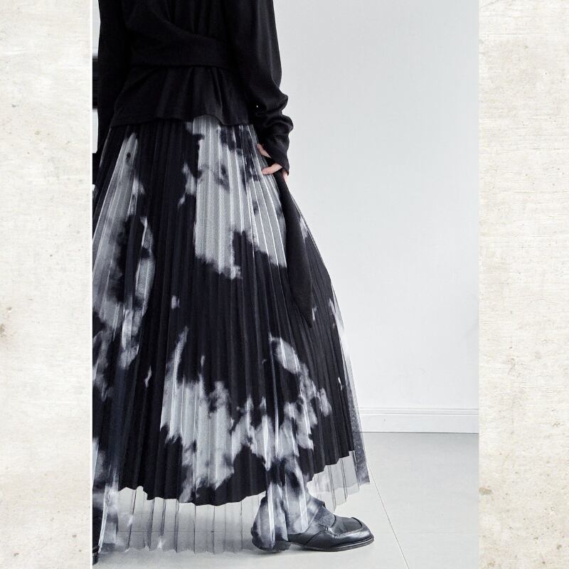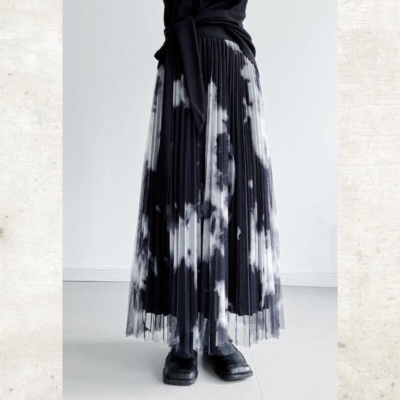 黒と白のコントラストが際立つ、タイダイ柄のプリントをチュール素材に重ねたモードなスカート。