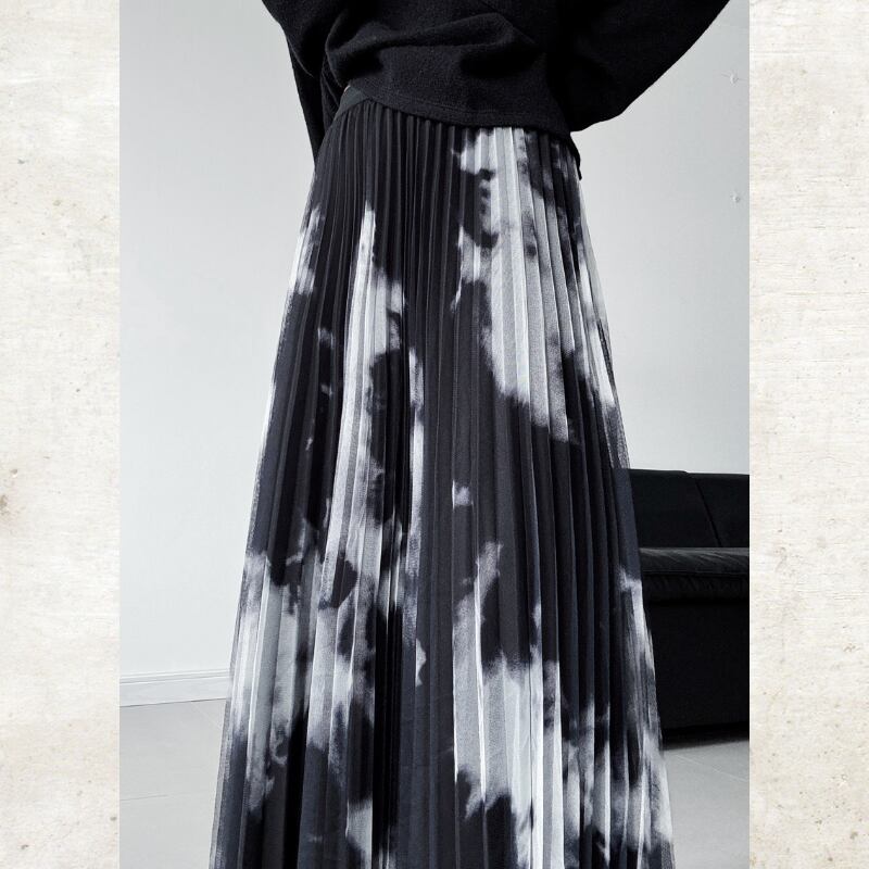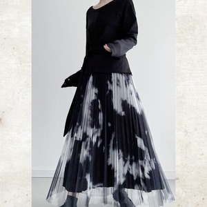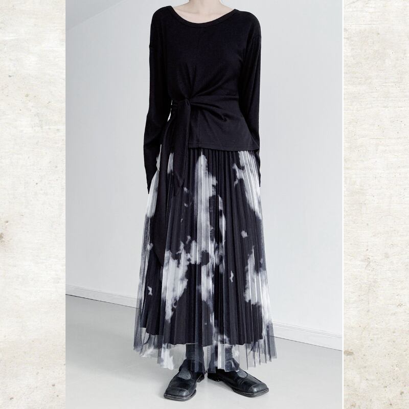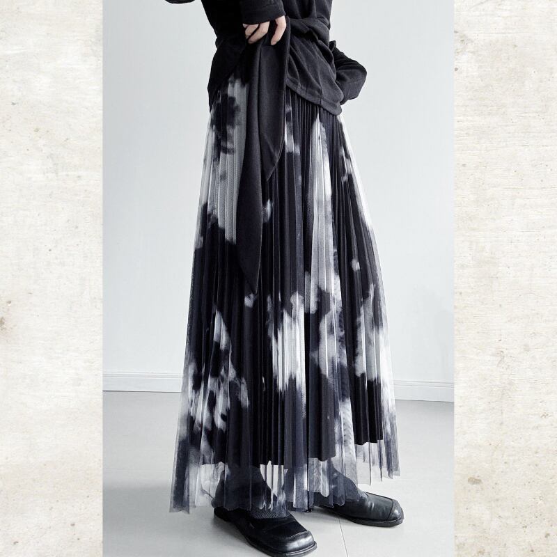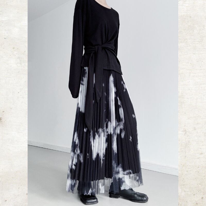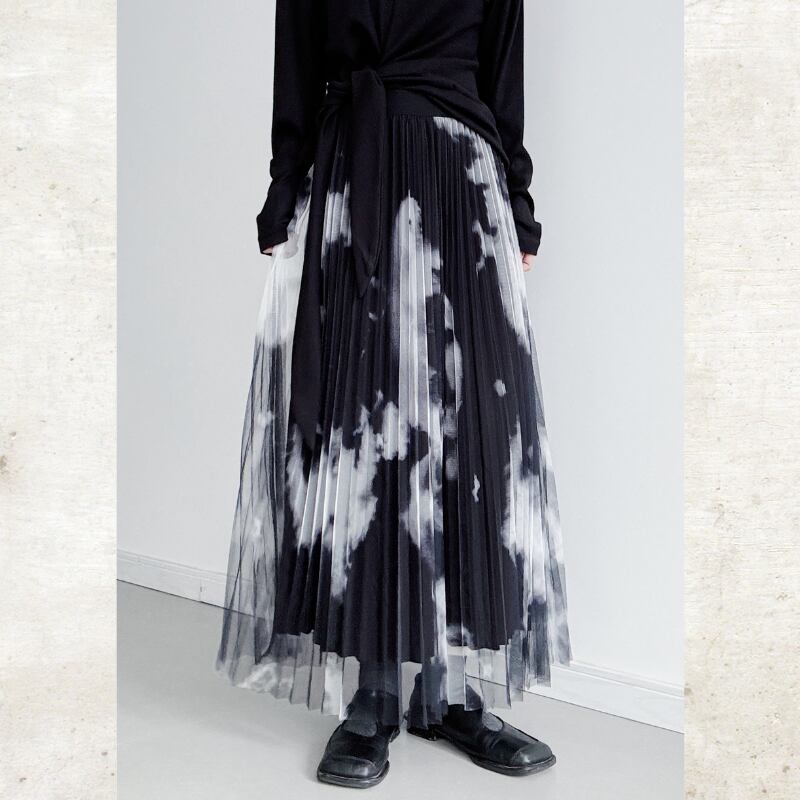黒と白のコントラストが際立つ、タイダイ柄のプリントをチュール素材に重ねたモードなスカート。