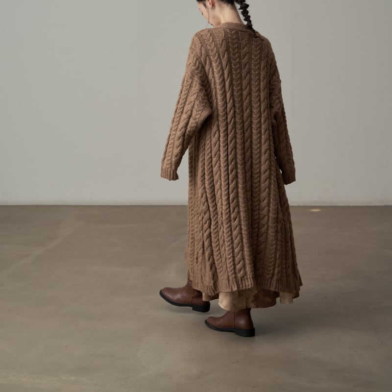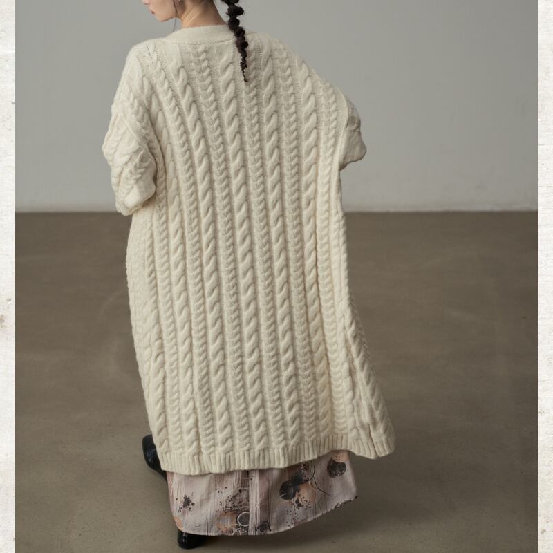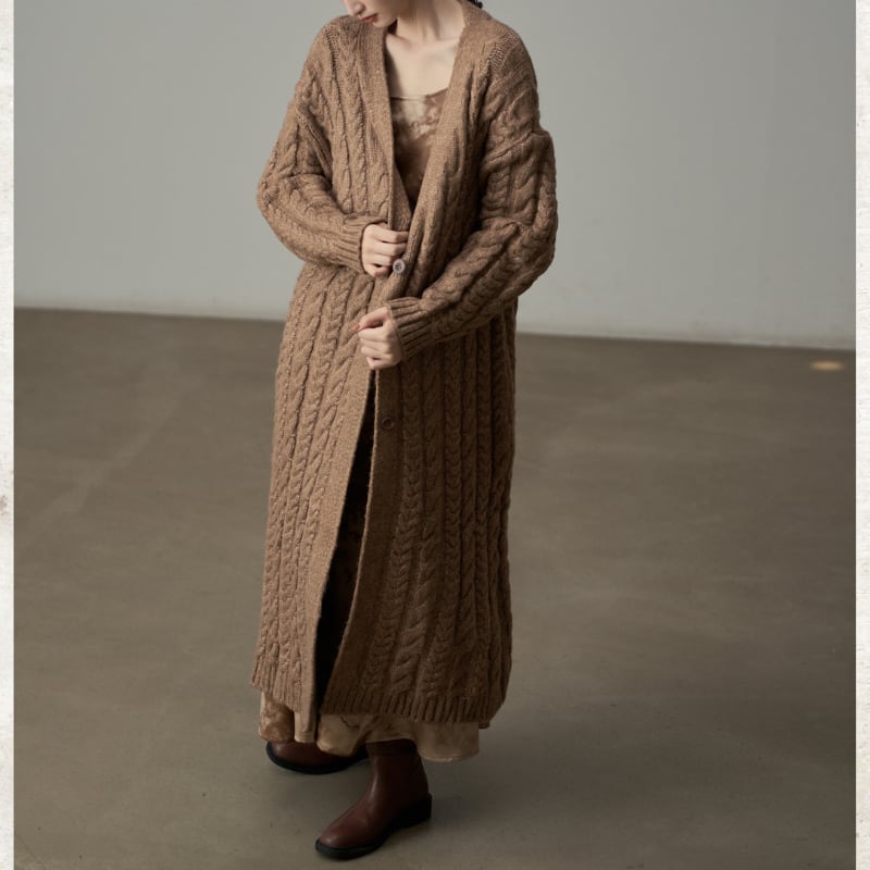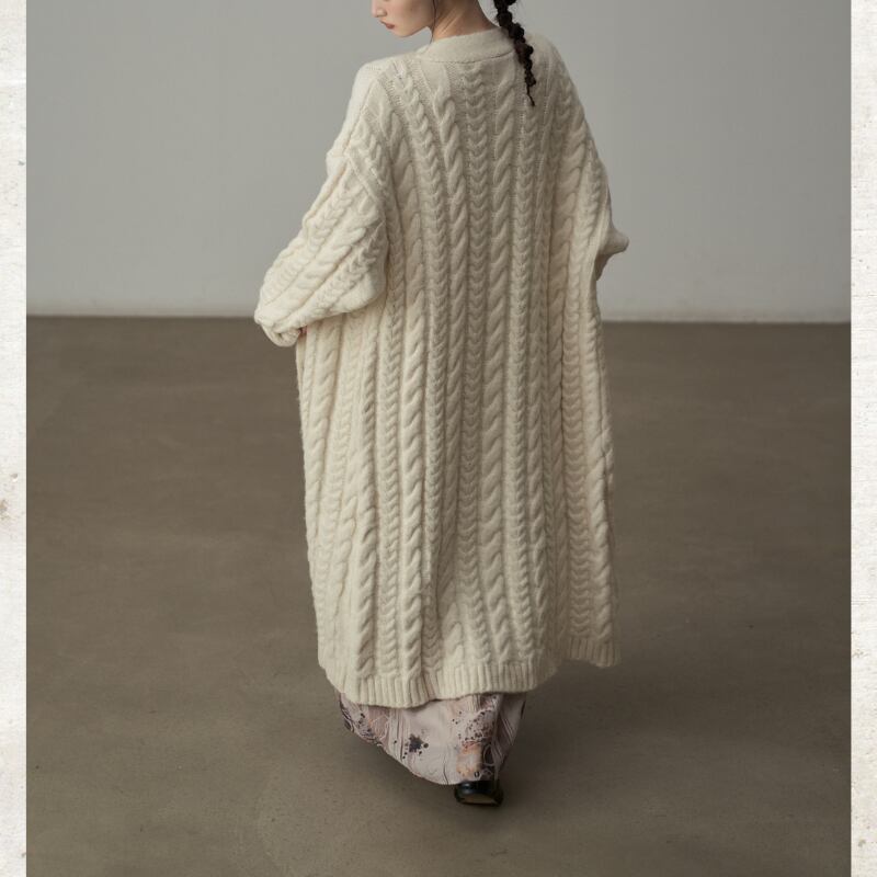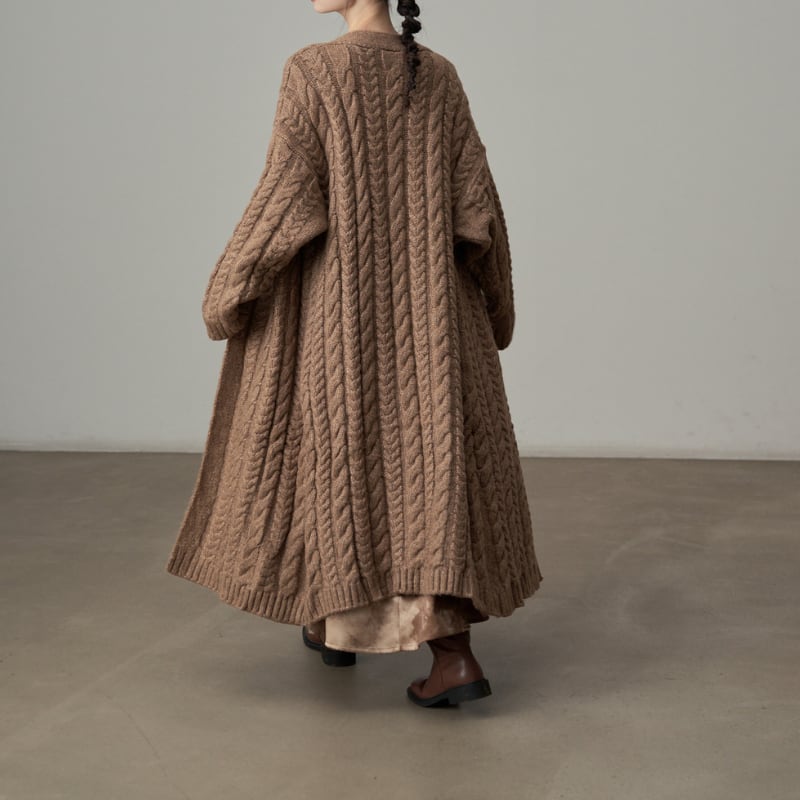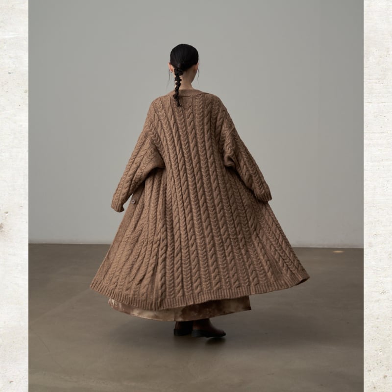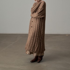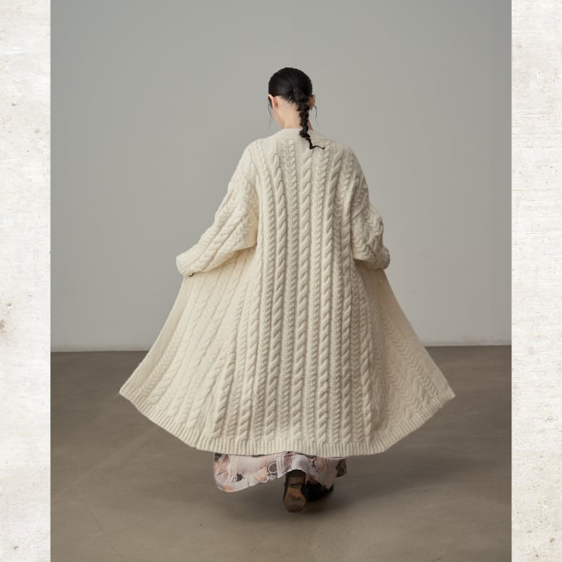 ざっくりとしたケーブル編みの豊かなテクスチャーのロングニットコート。