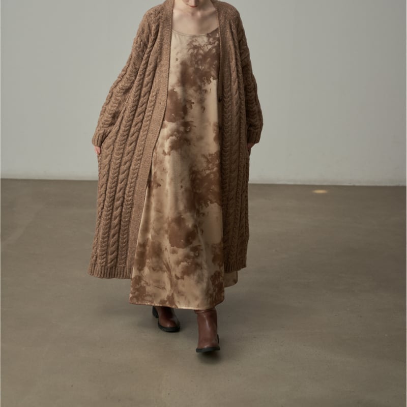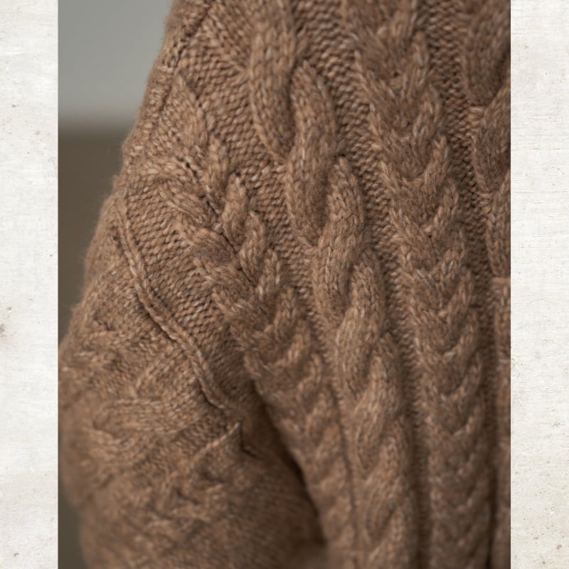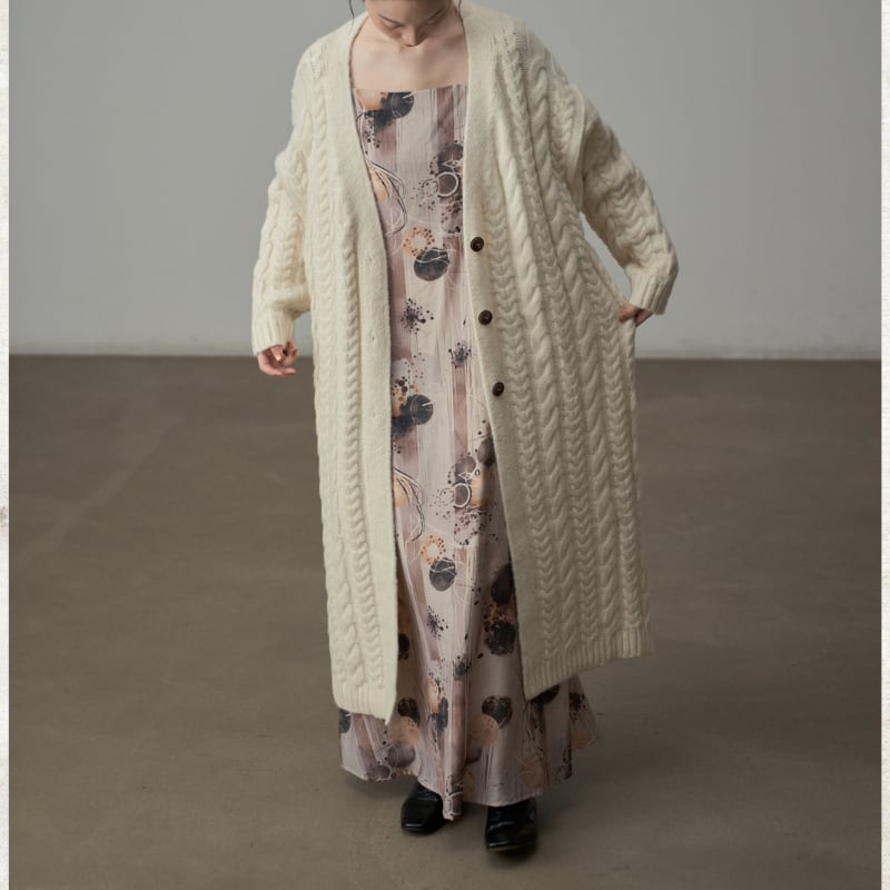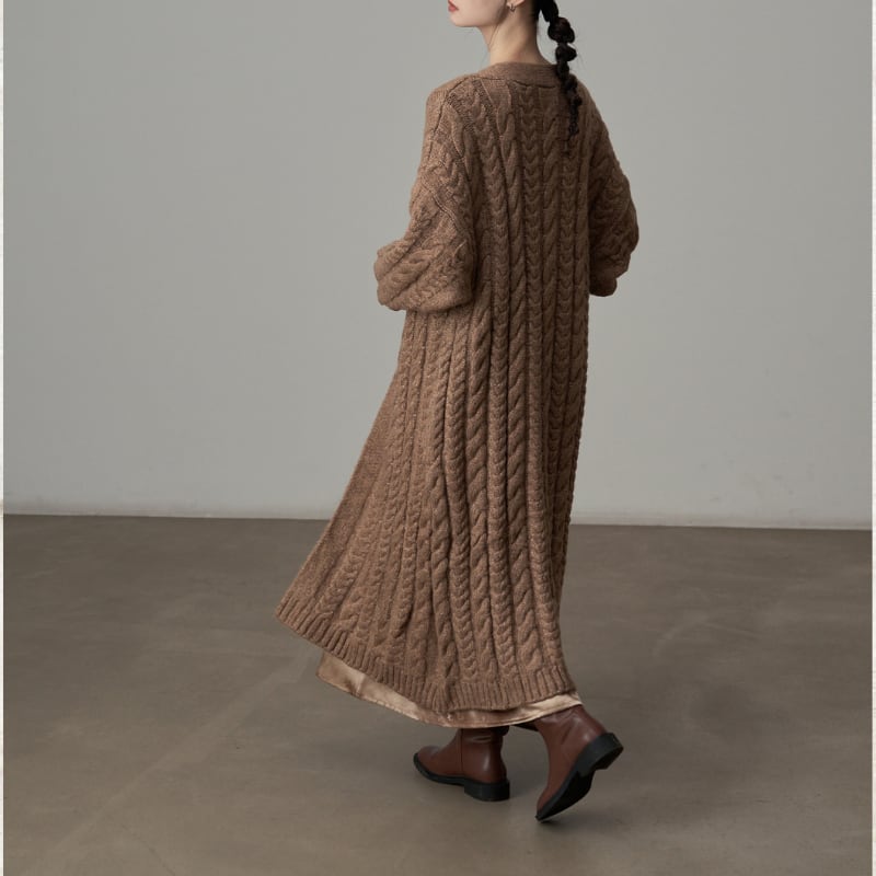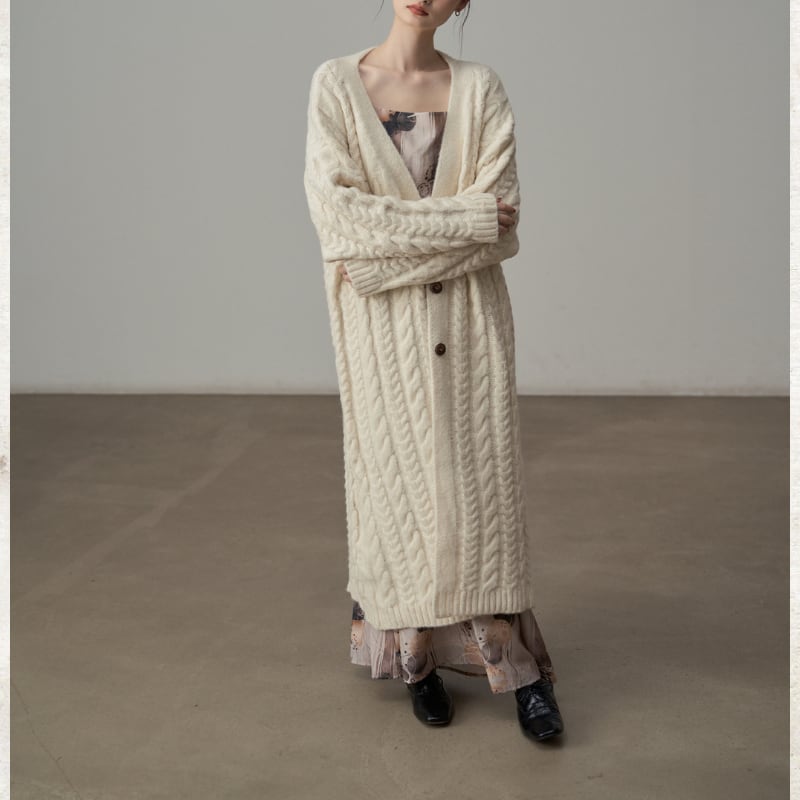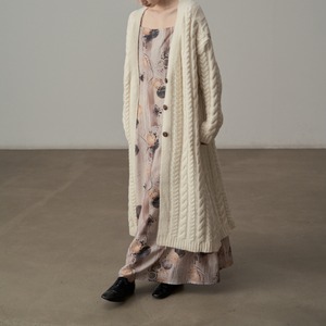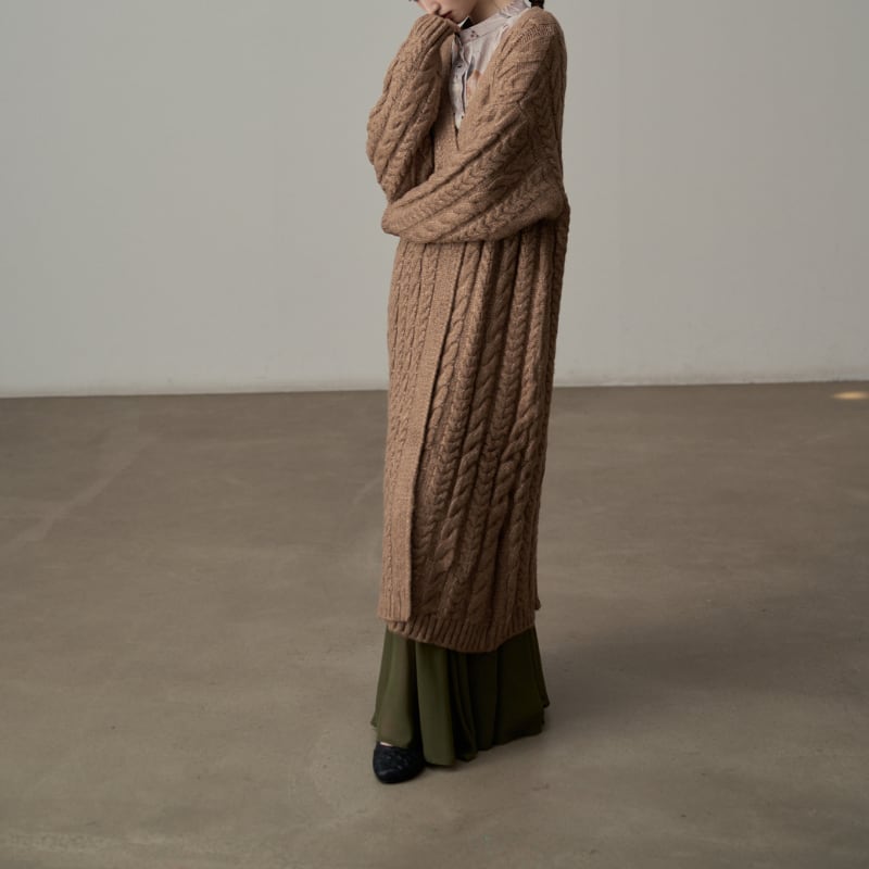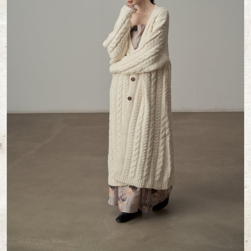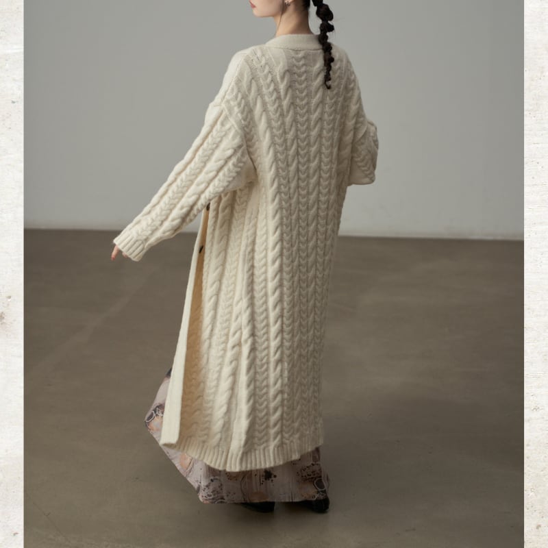 ざっくりとしたケーブル編みの豊かなテクスチャーのロングニットコート。