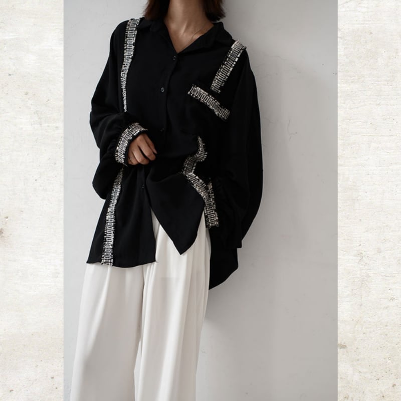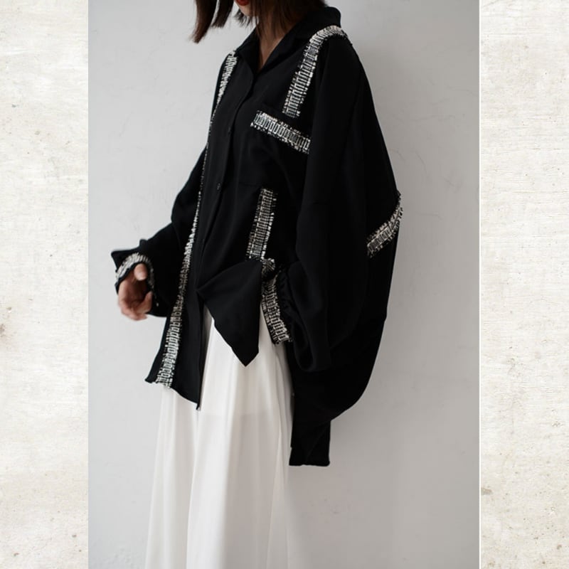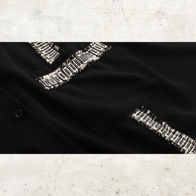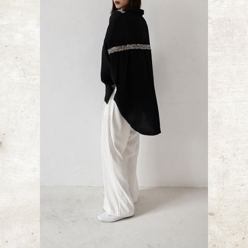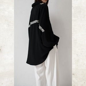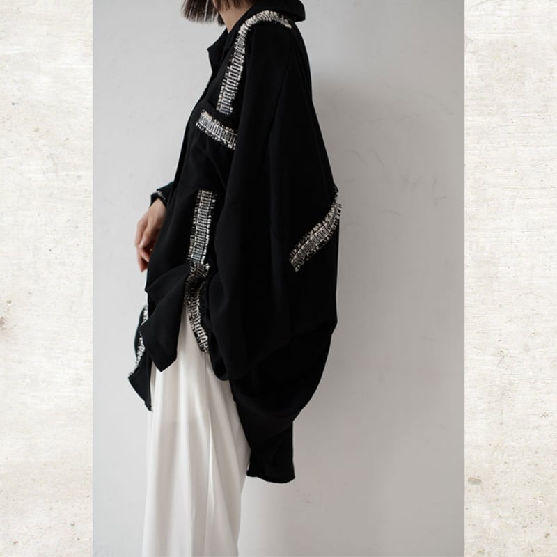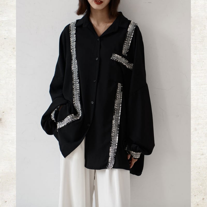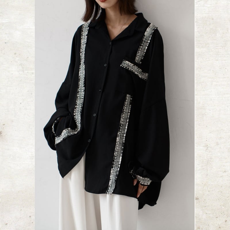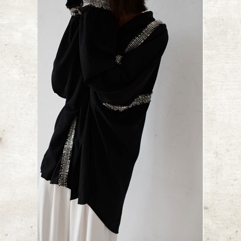 ソリッドなブラックに、ツイード調のフリンジラインがグラフィカルなエッジを効かせるルーズフィットシャツ。