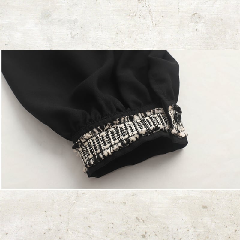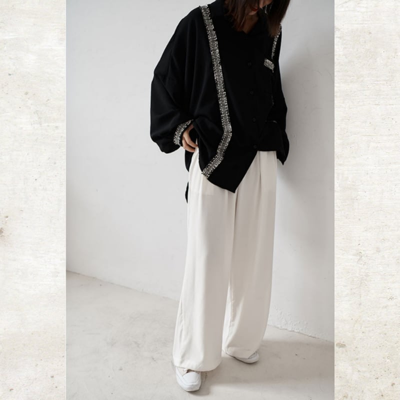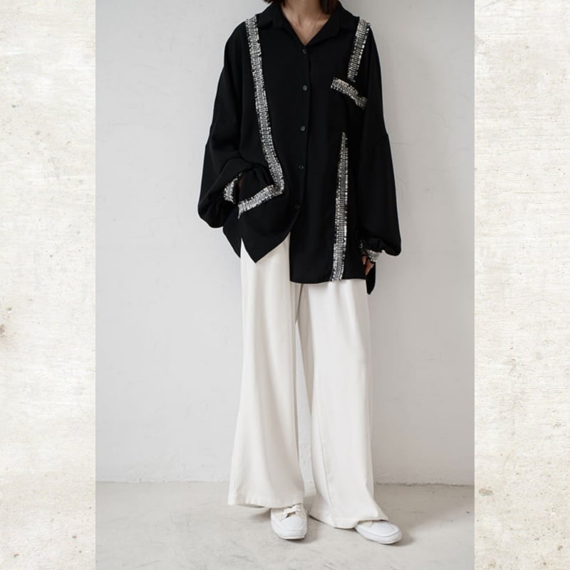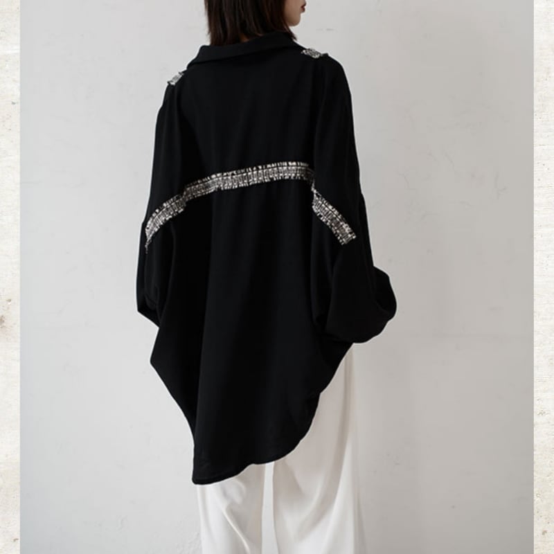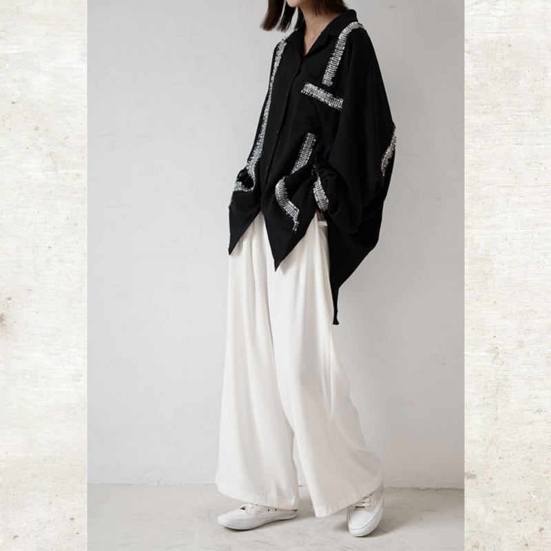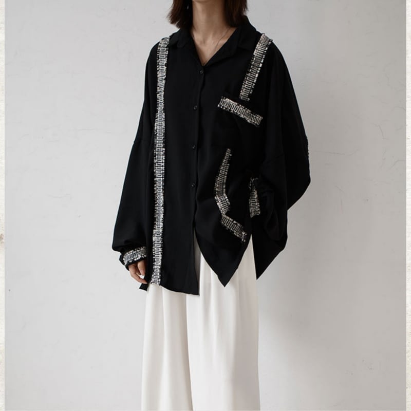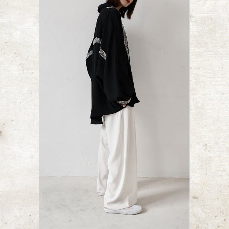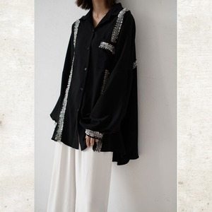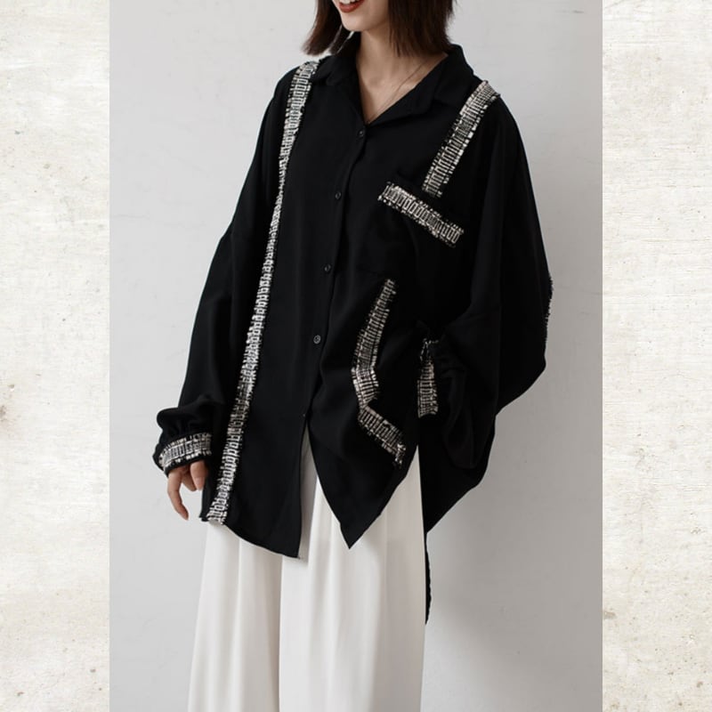 ソリッドなブラックに、ツイード調のフリンジラインがグラフィカルなエッジを効かせるルーズフィットシャツ。