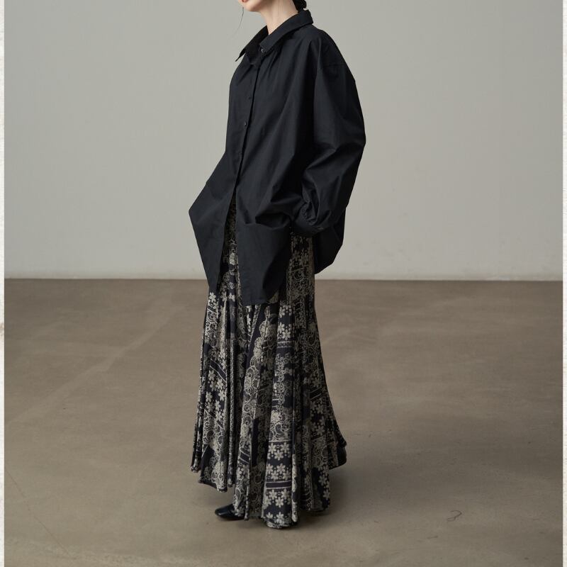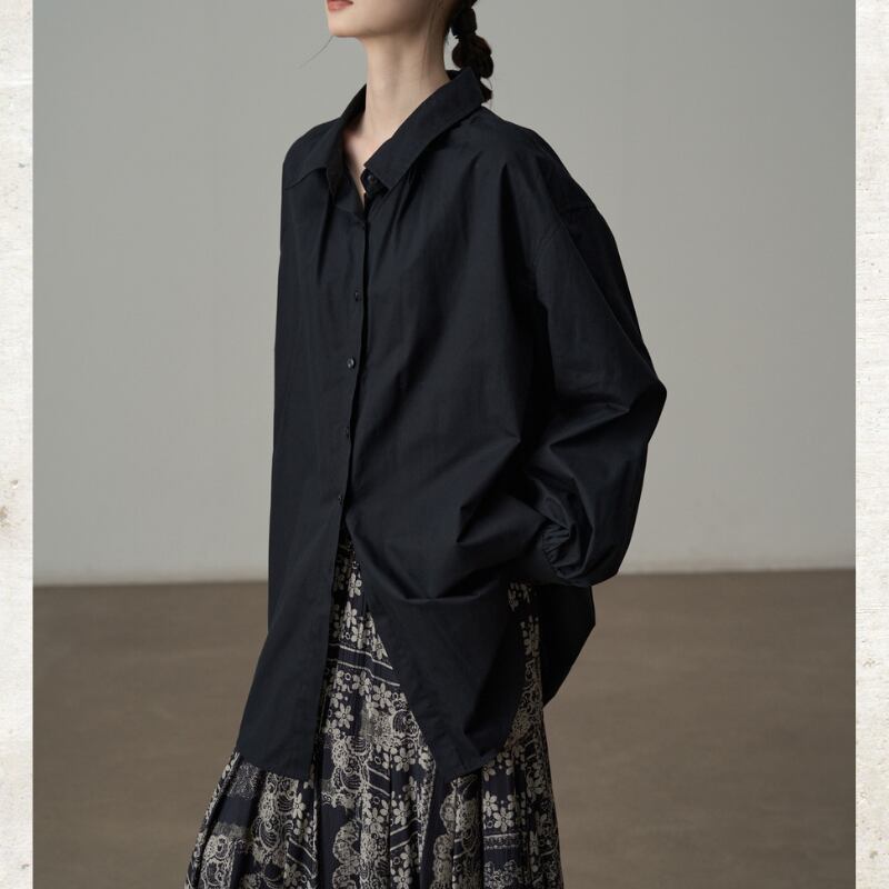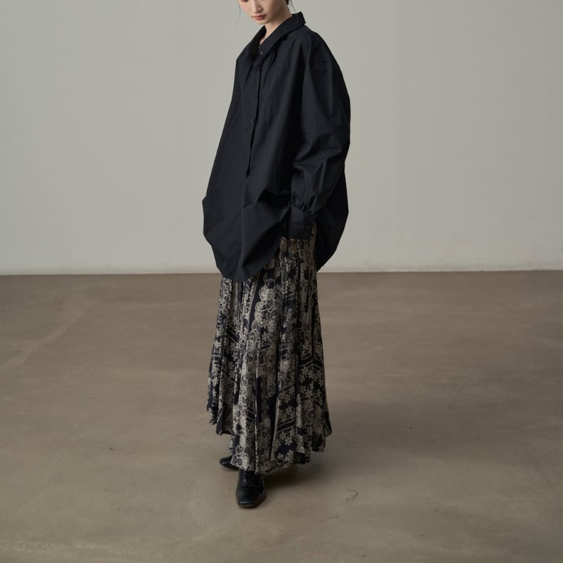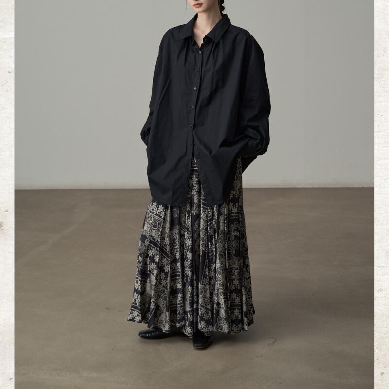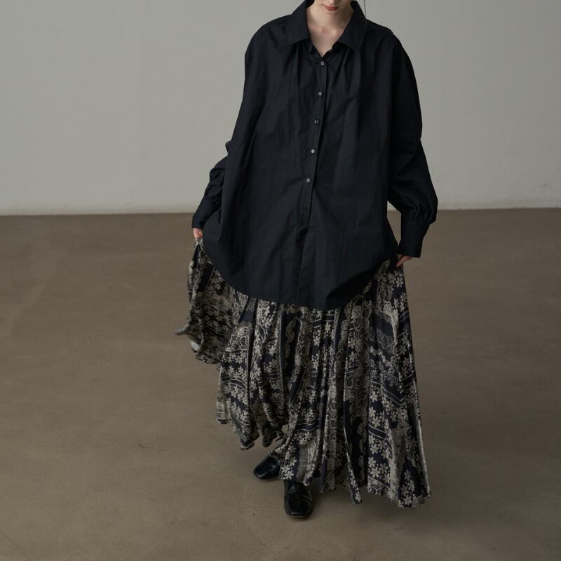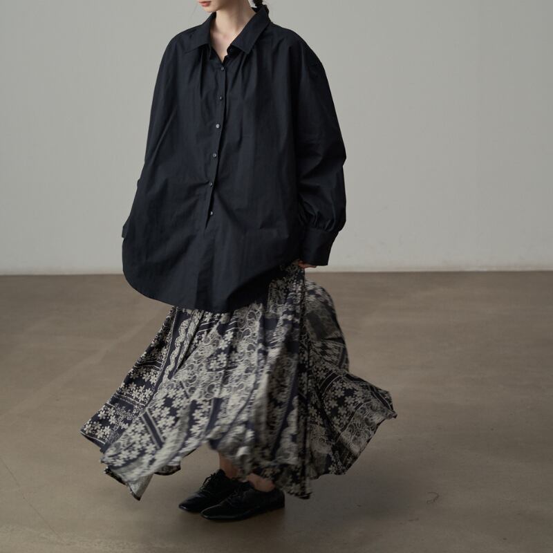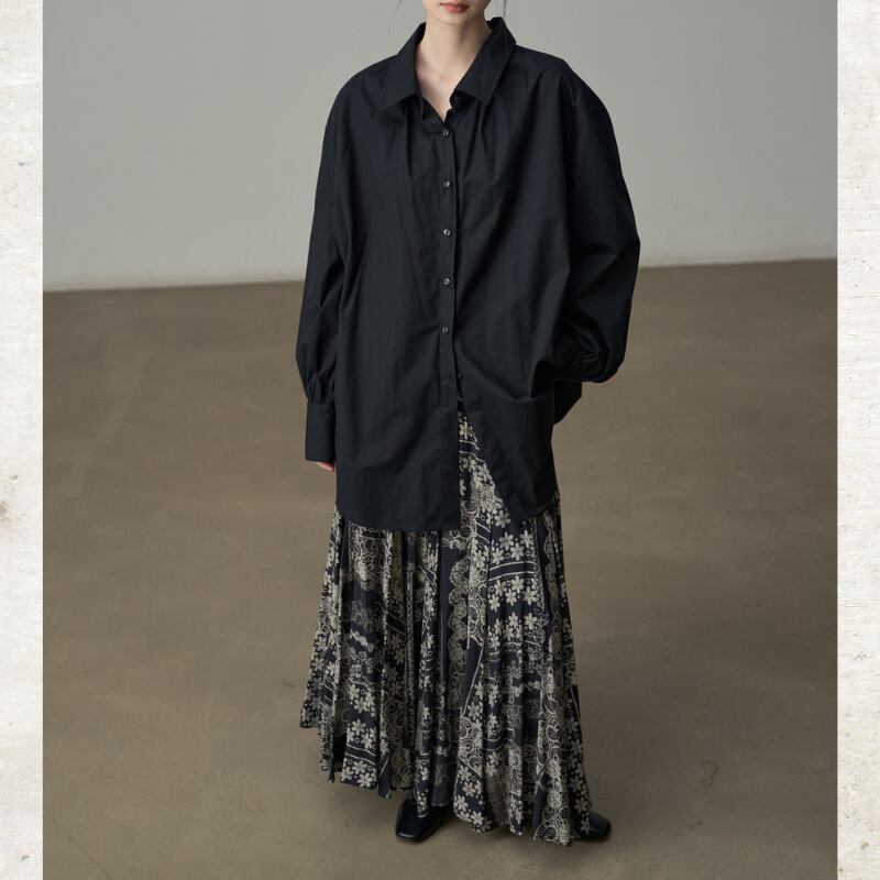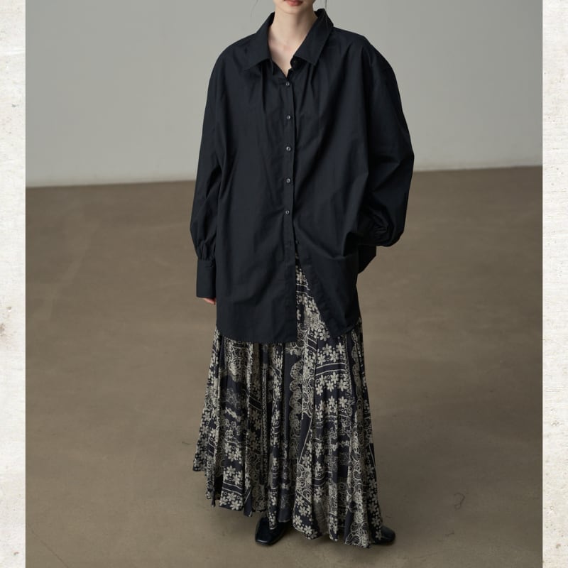 オーバーサイズのシルエットと、袖にボリュームを持たせたドロップショルダーデザインが特徴的なシャツ。