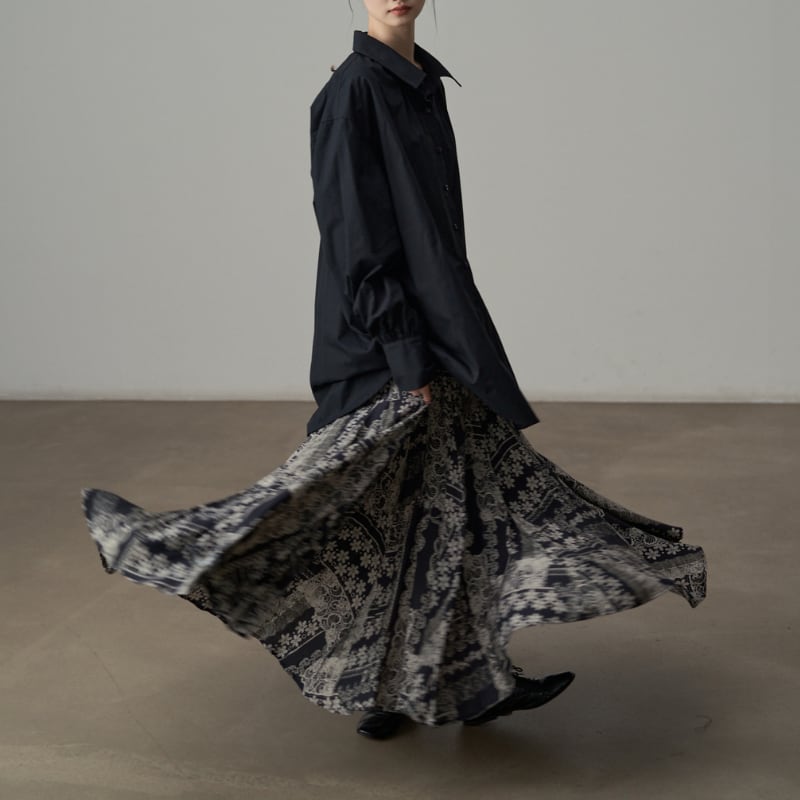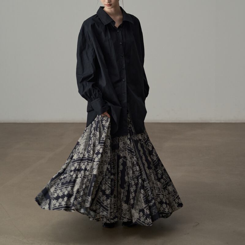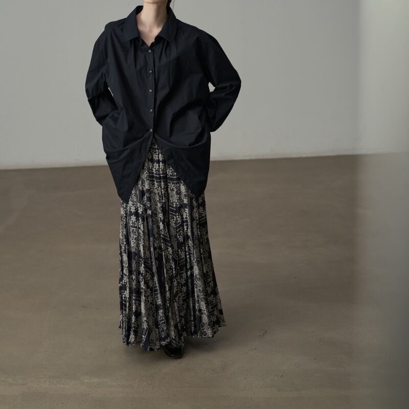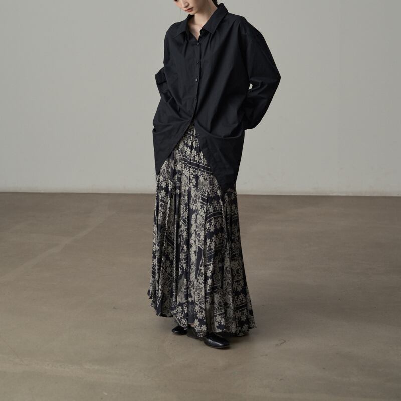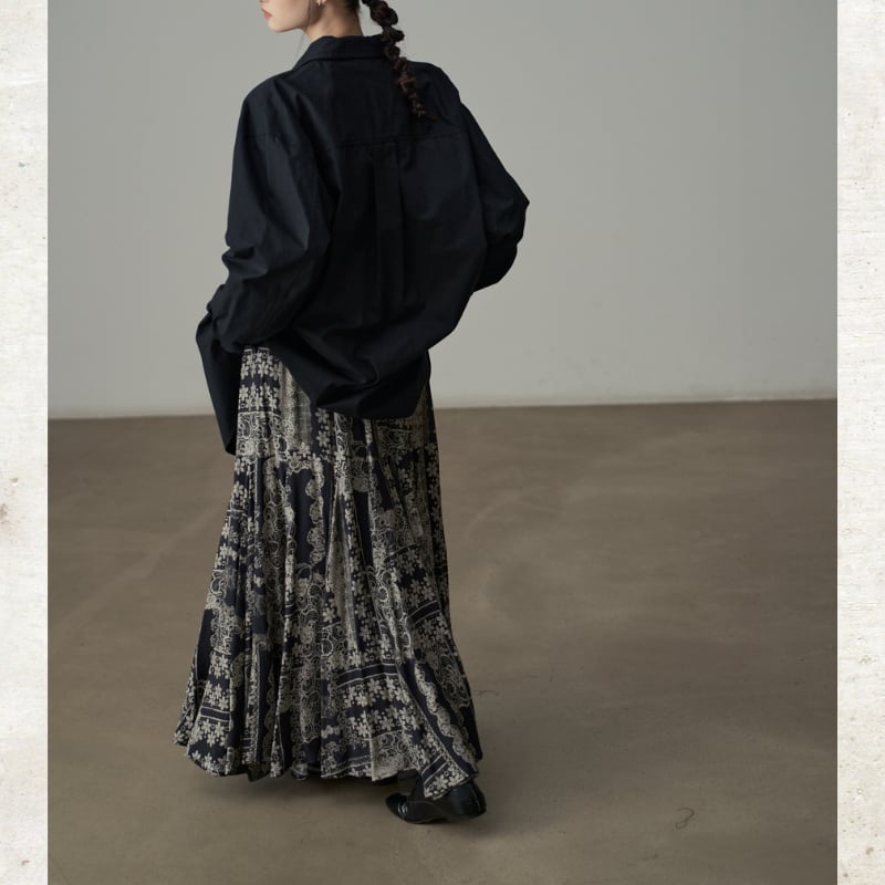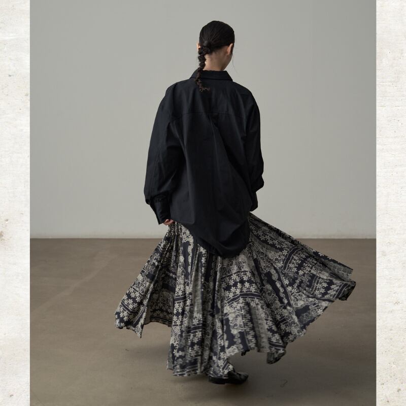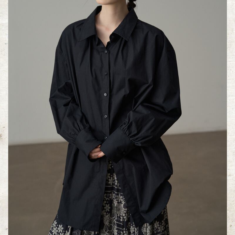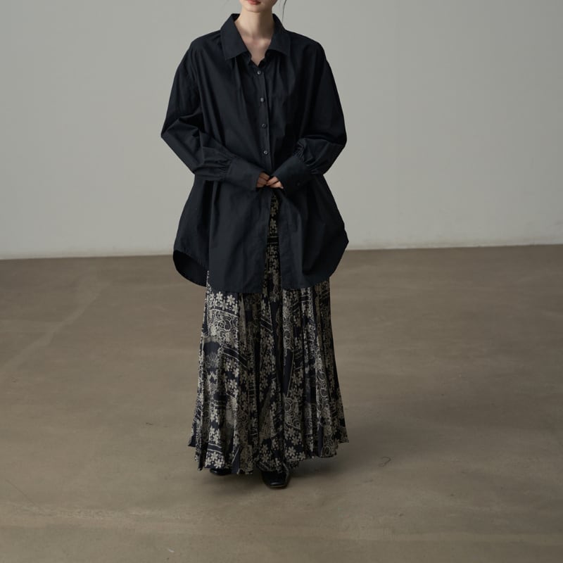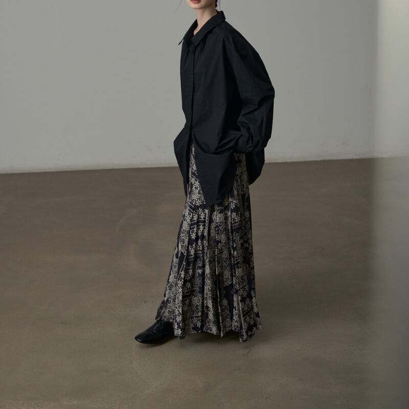 オーバーサイズのシルエットと、袖にボリュームを持たせたドロップショルダーデザインが特徴的なシャツ。