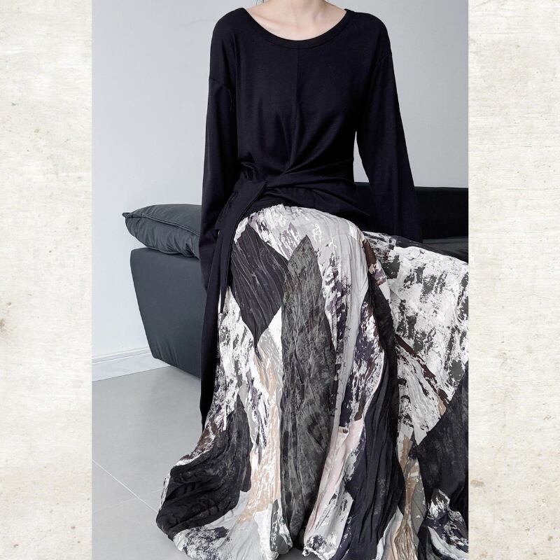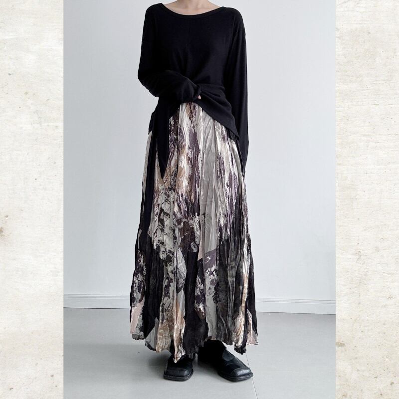 抽象的なアートプリントがスタイリングにモダンな奥行きを与えるマキシ丈スカート。