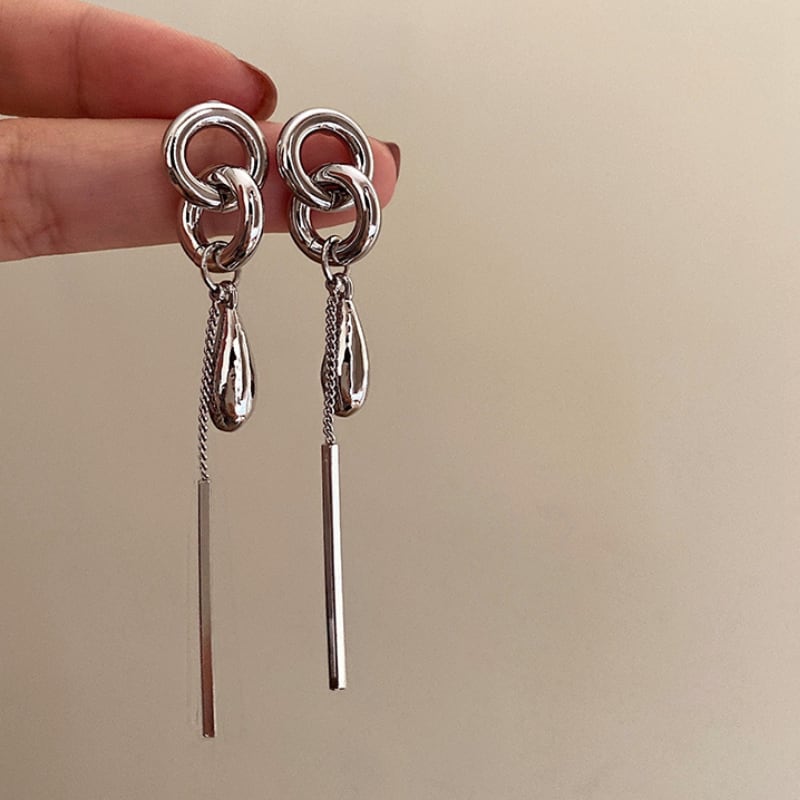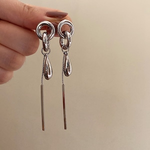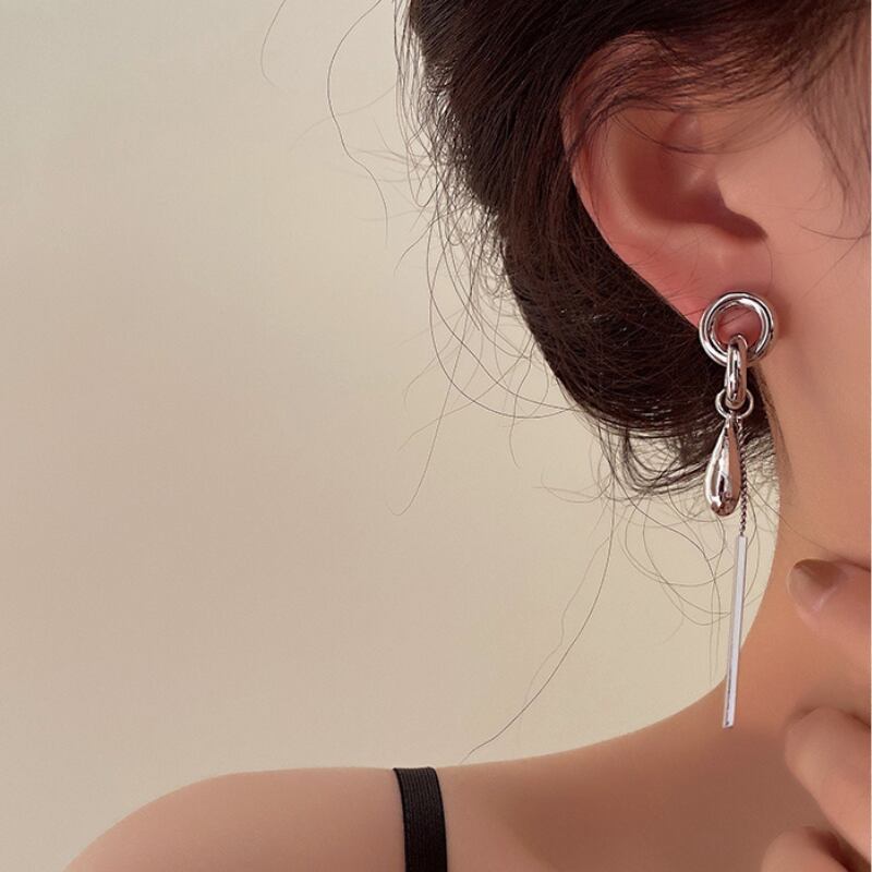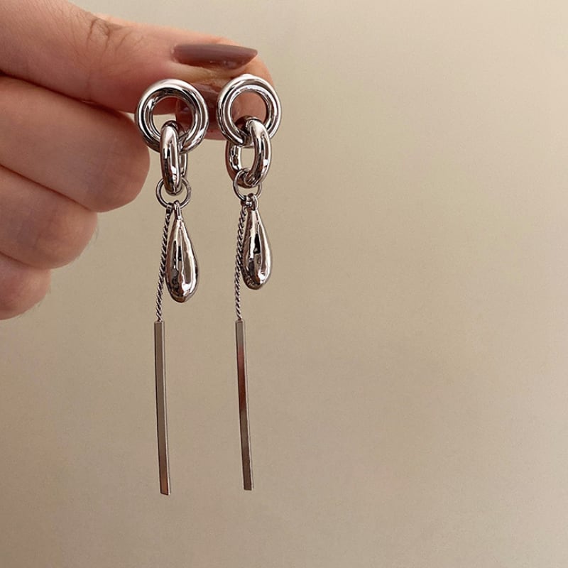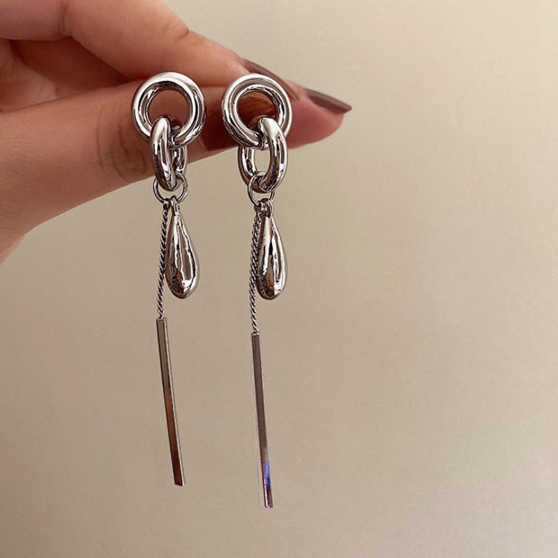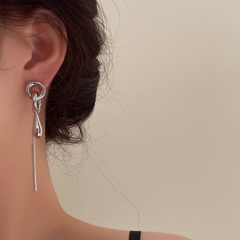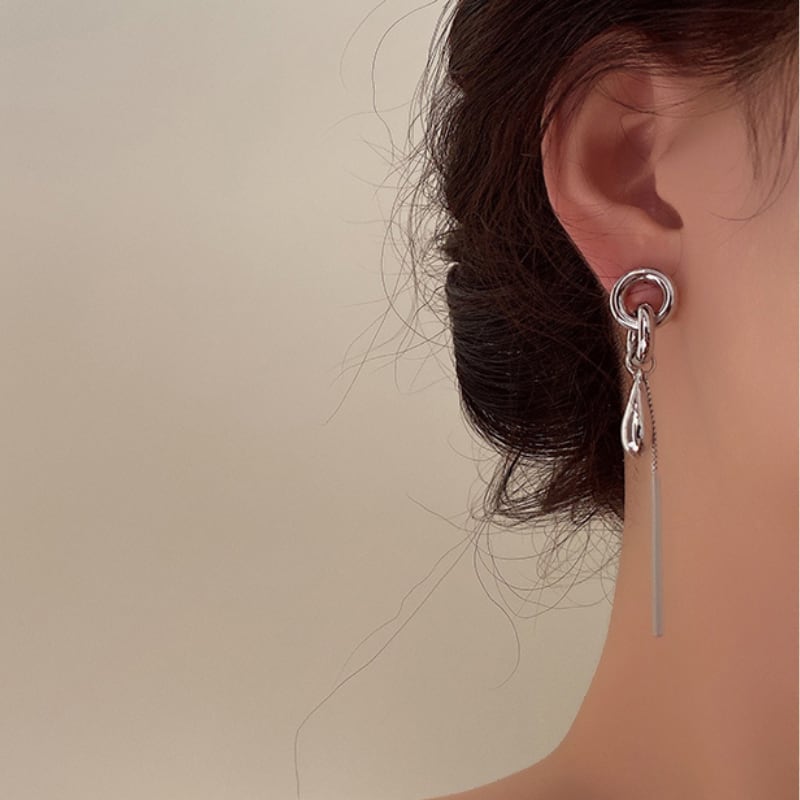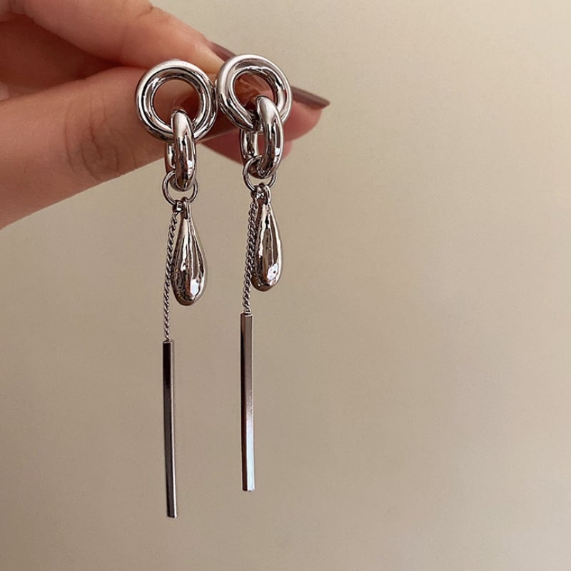 構築的なシルバーのフープからなめらかなドロップとシャープなバーモチーフが揺れる、モダンでクールなロングピアス。