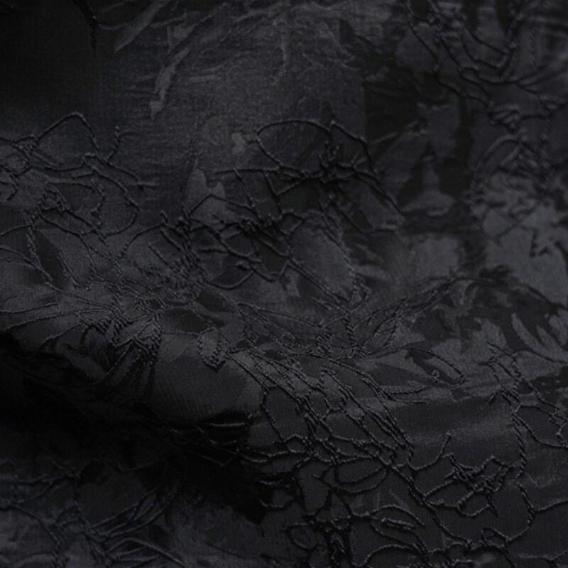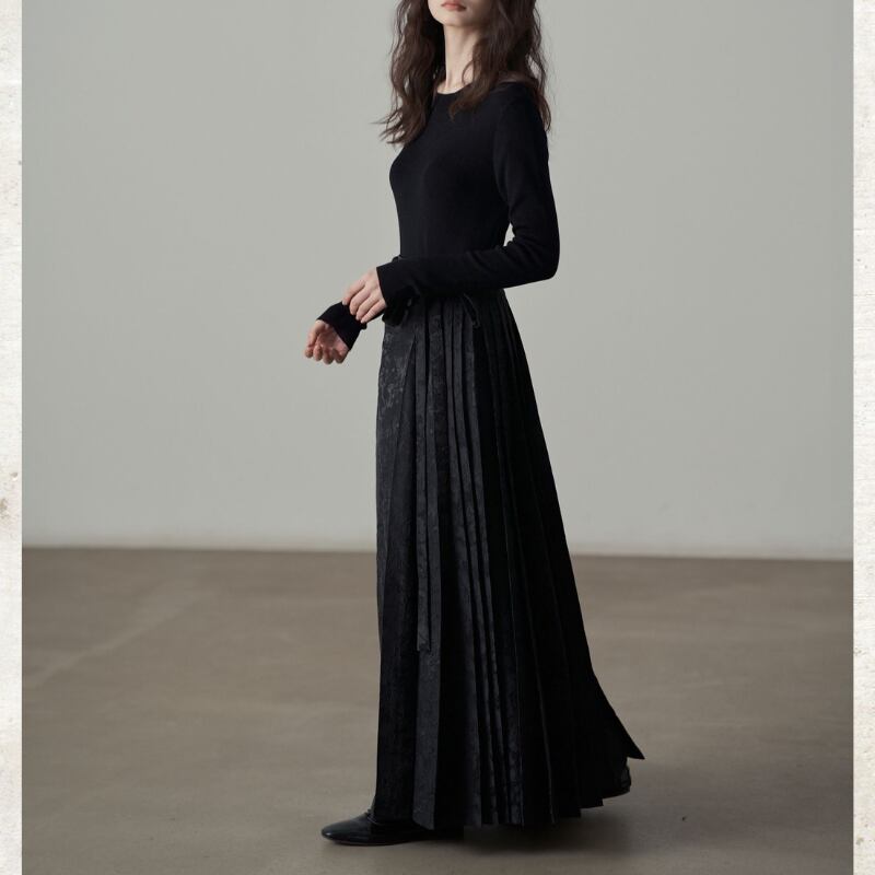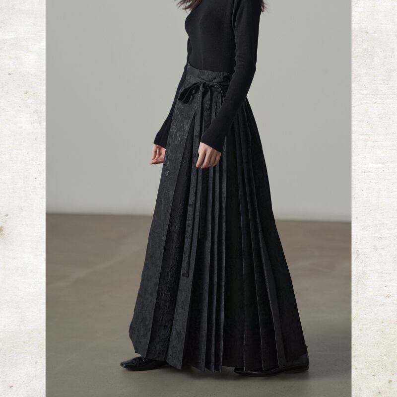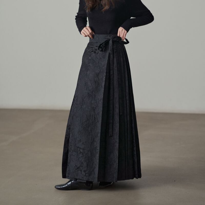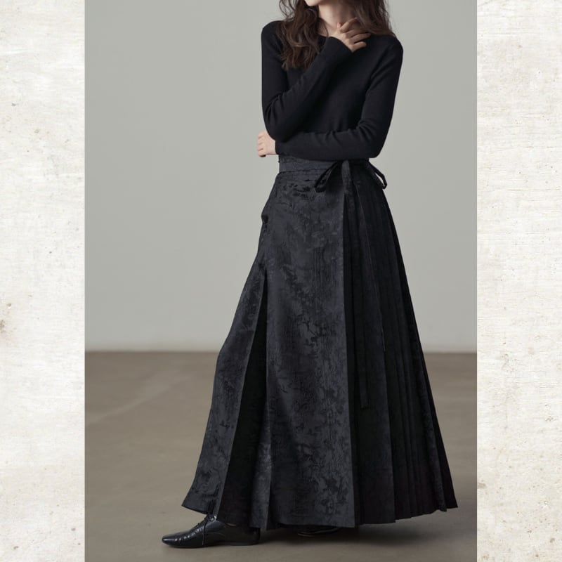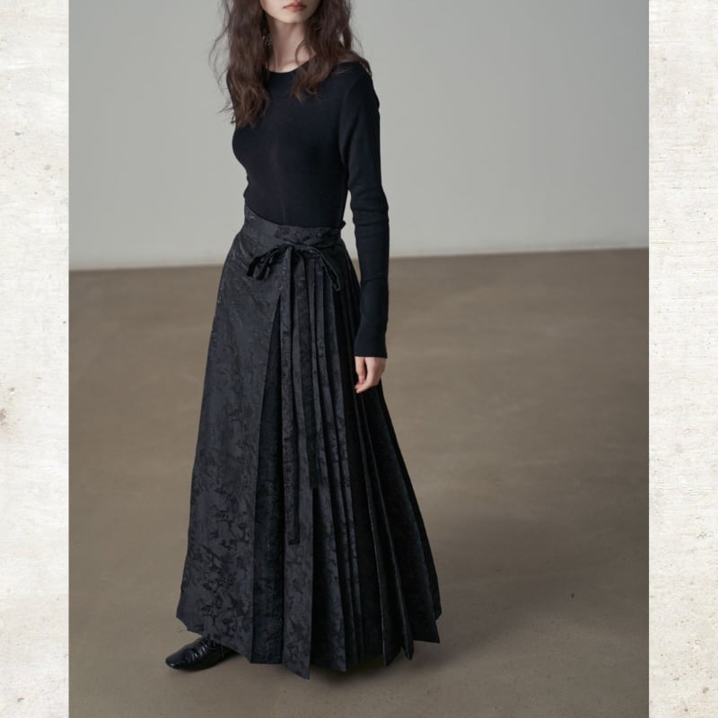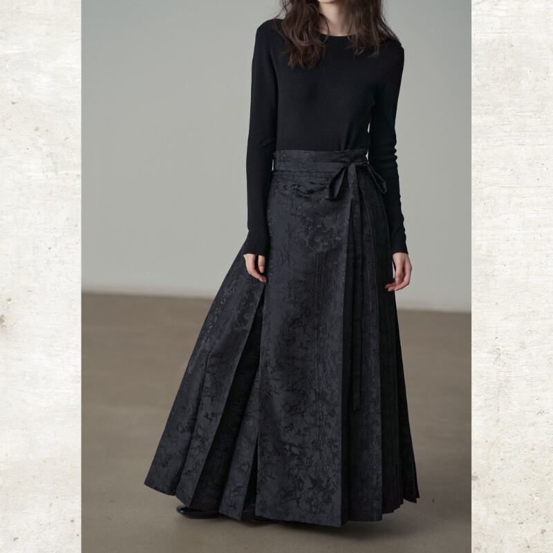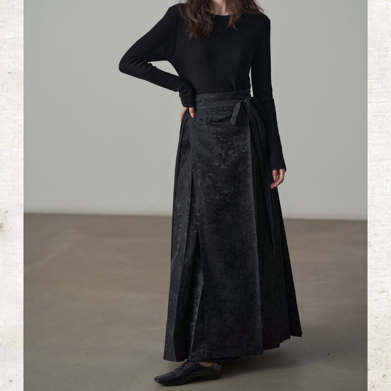 複雑なフラワーモチーフのジャガード織りが、奥行きのあるシックな光沢を放つマキシスカート。