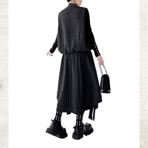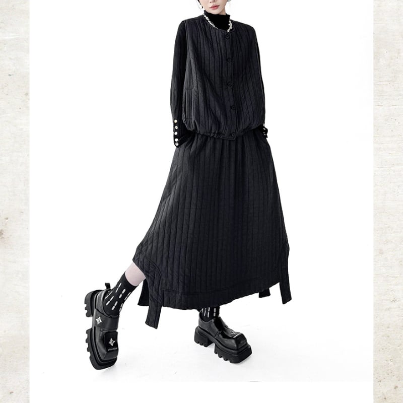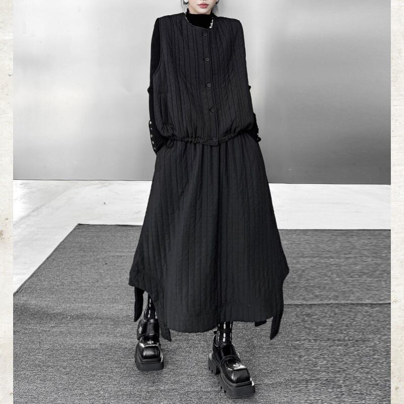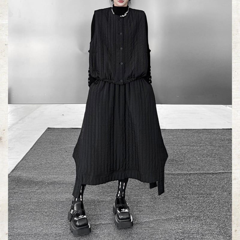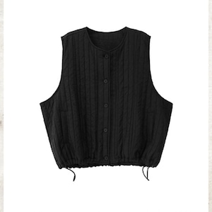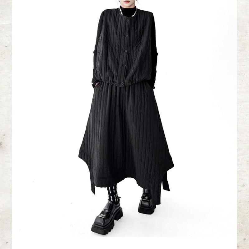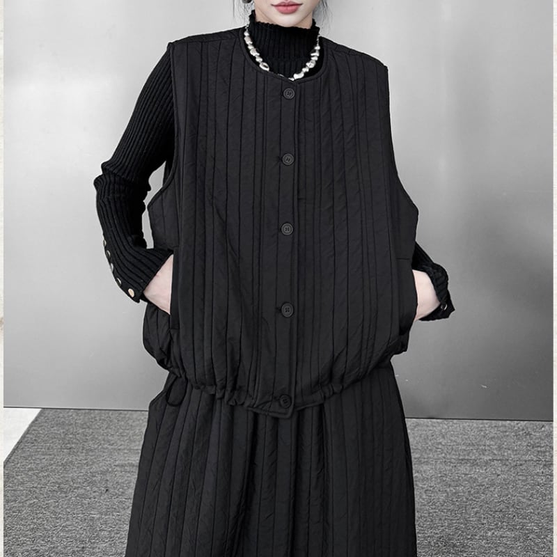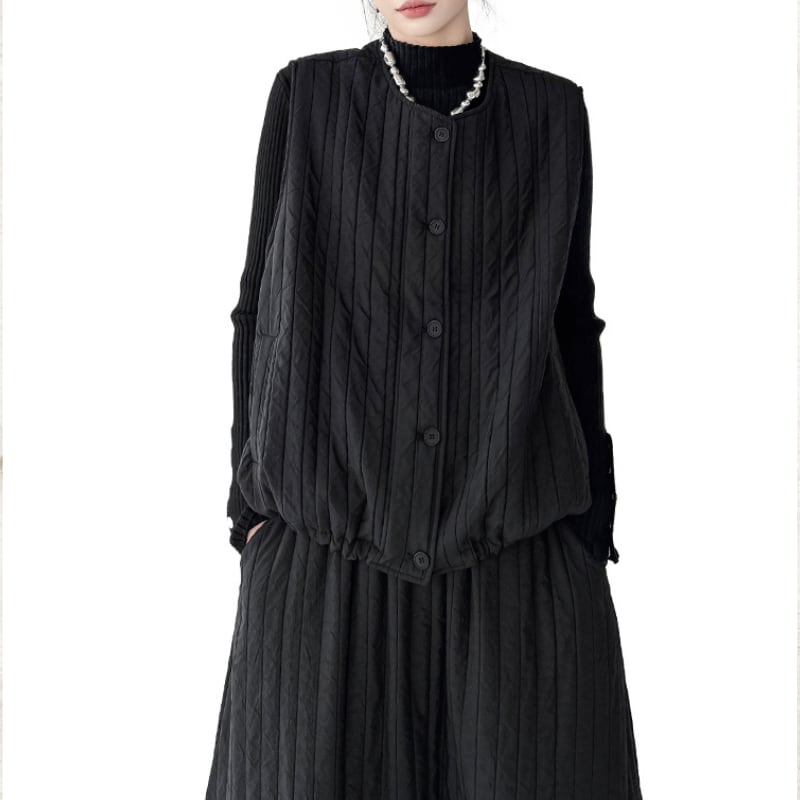 縦のラインが際立つキルティングと、ルーズなシルエットのコントラストがモダンなベスト。