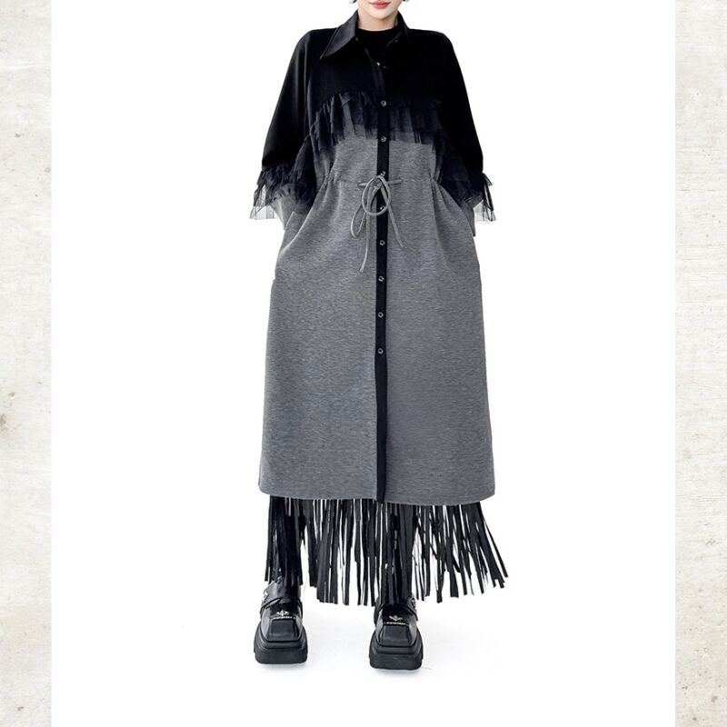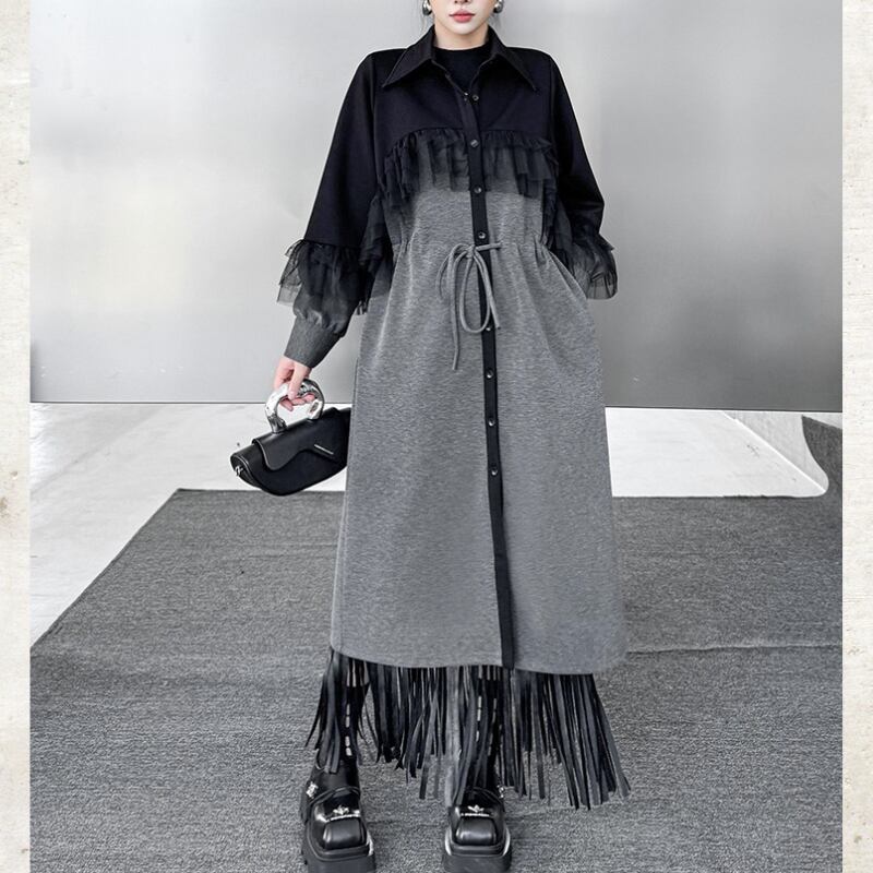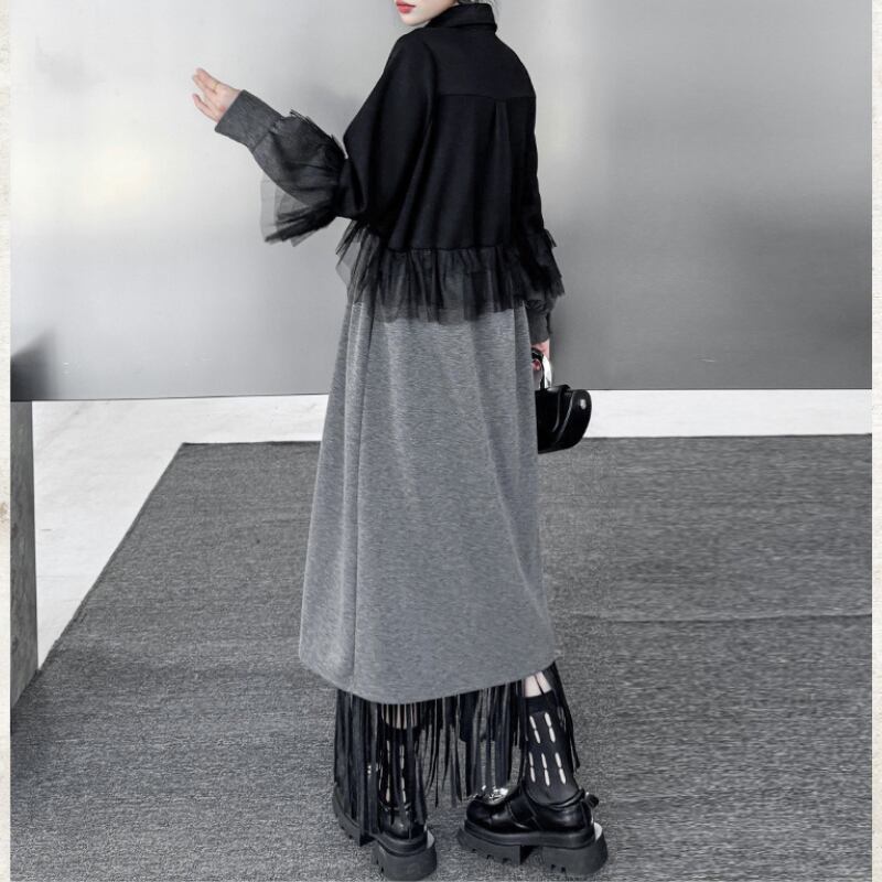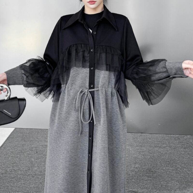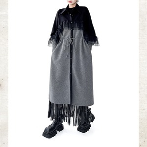 クリーンなシャツカラーと軽やかなチュールフリルが織りなす、モードな切替デザインのロングコート。