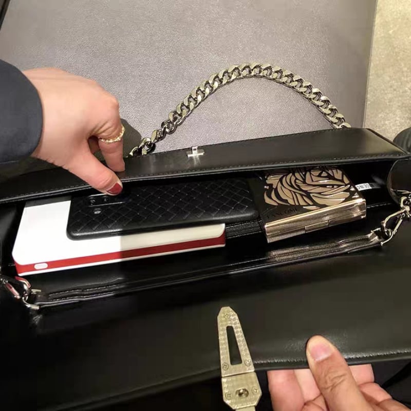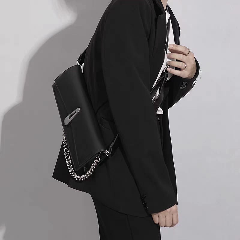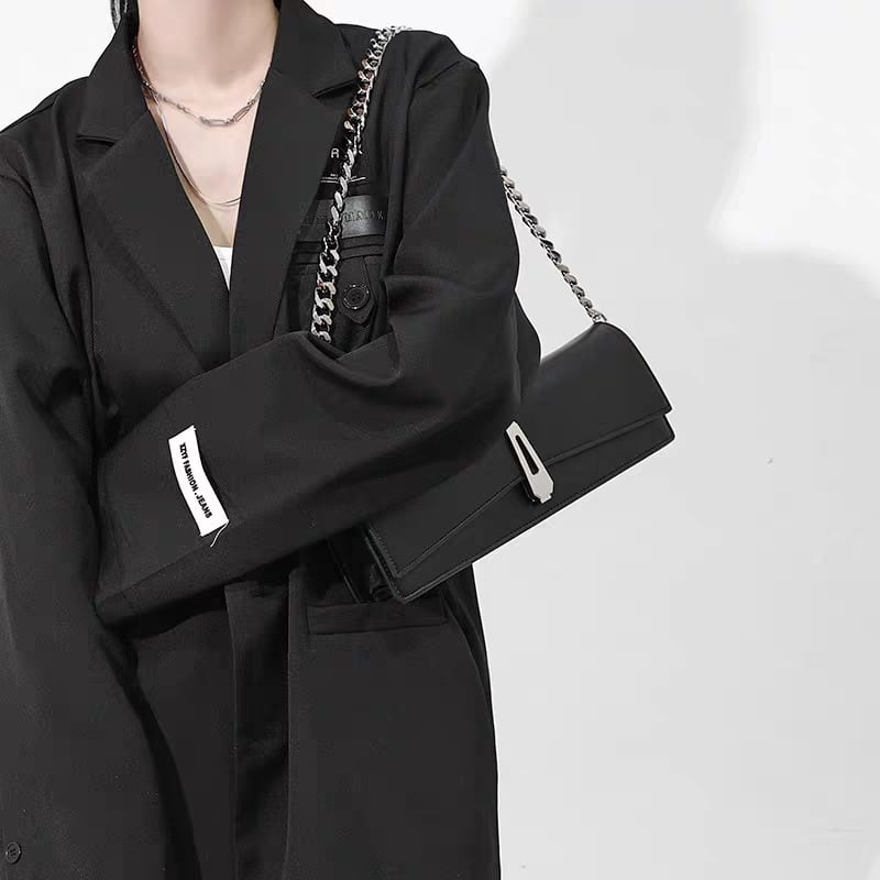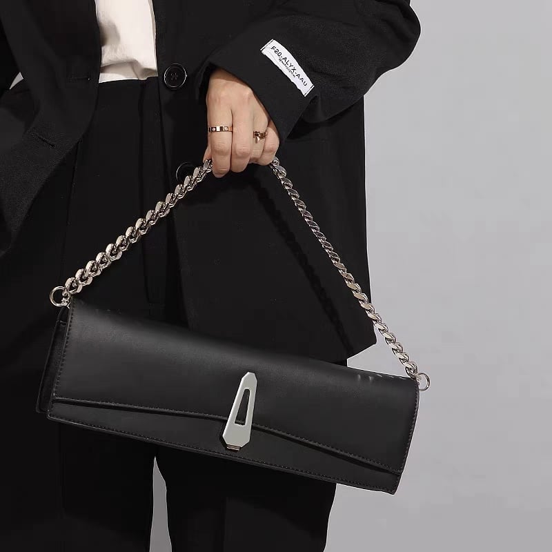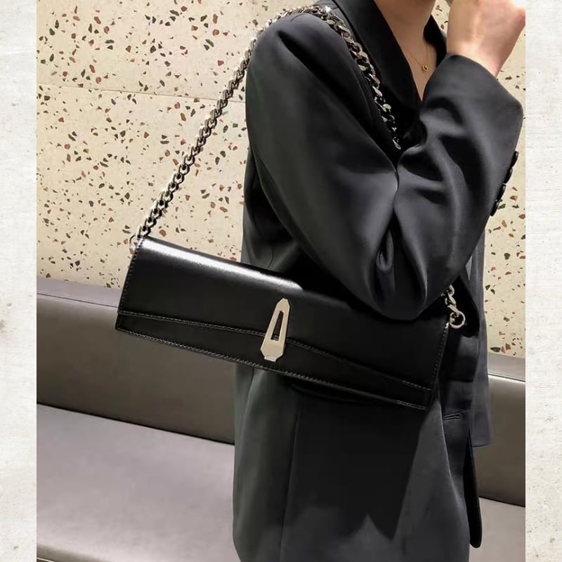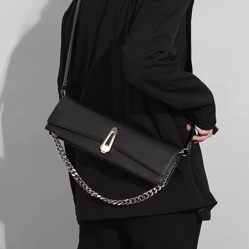 フロントのクリップ金具と、付属の太めチェーンストラップが、スタイルをクールでモダンに引き締めます。