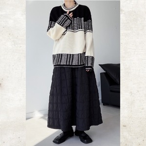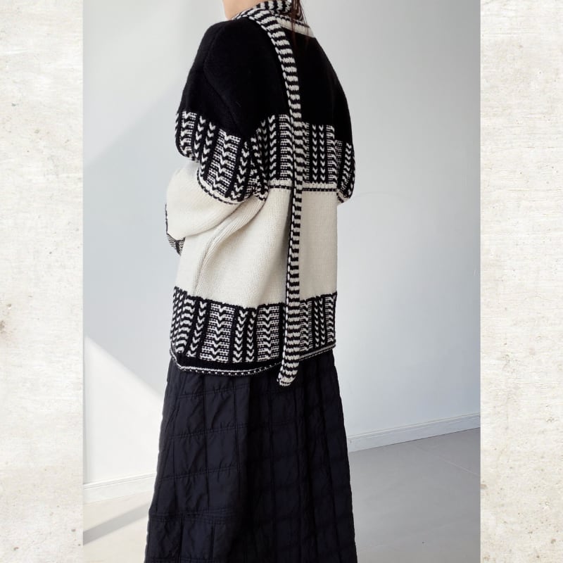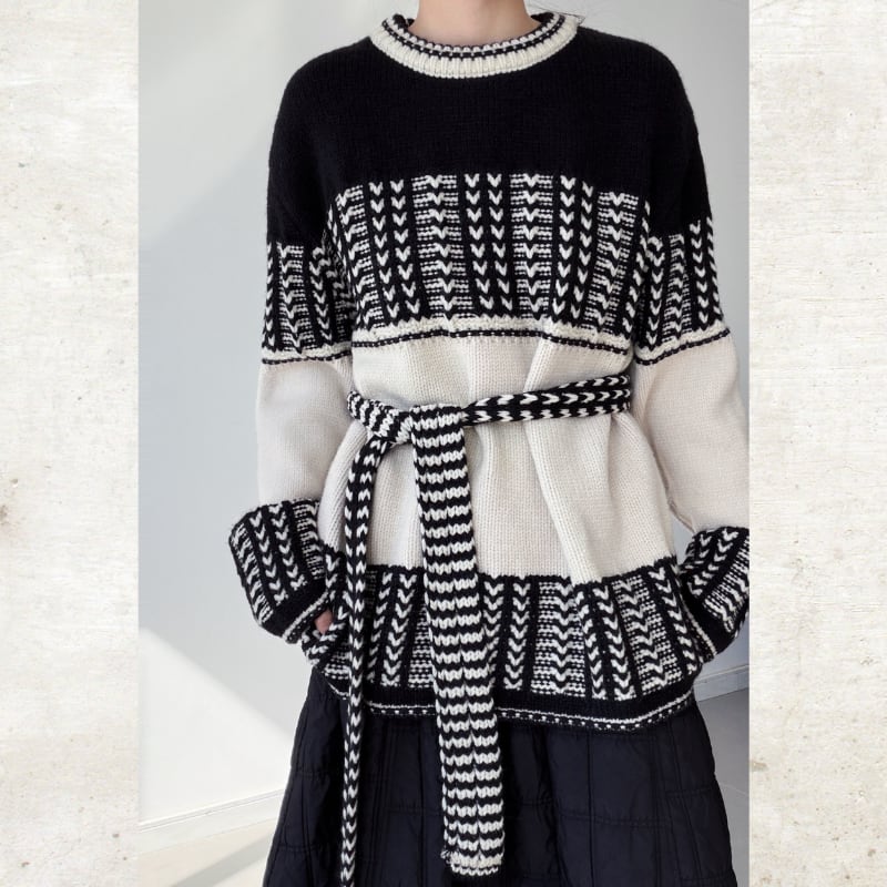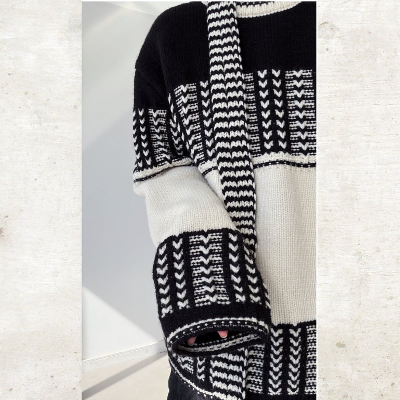 ソリッドなモノクローム配色で描かれた構築的なジオメトリックパターンが、スタイルにエッジを加えるニットセット。