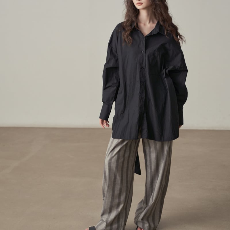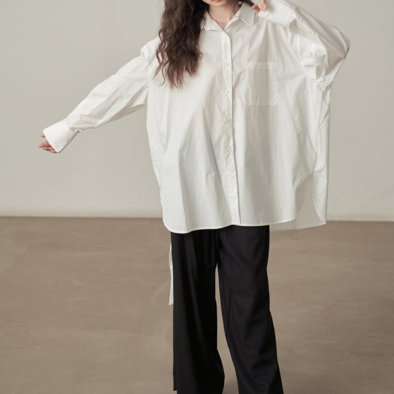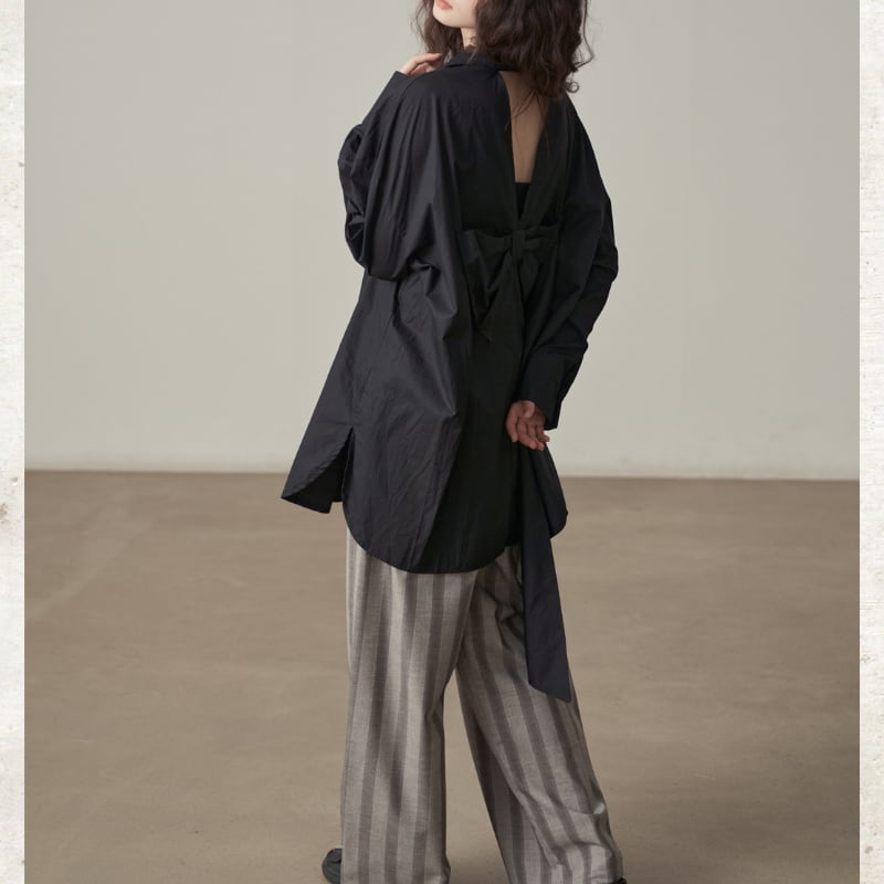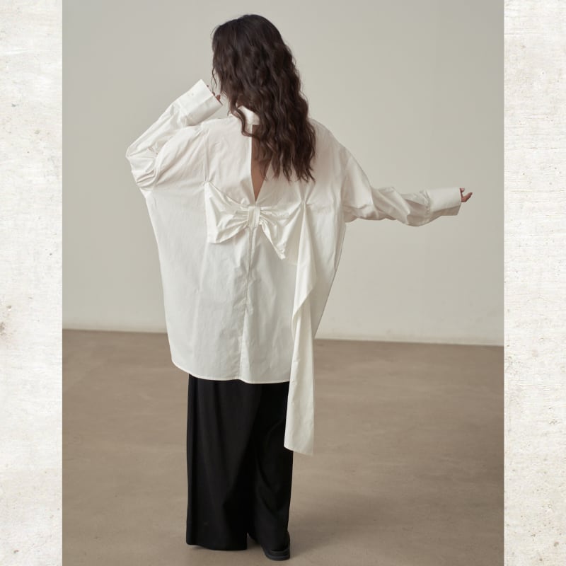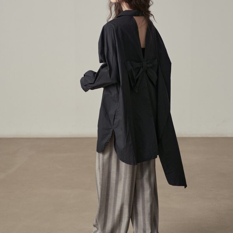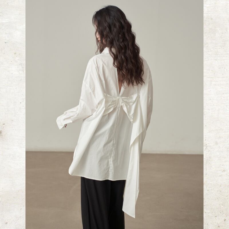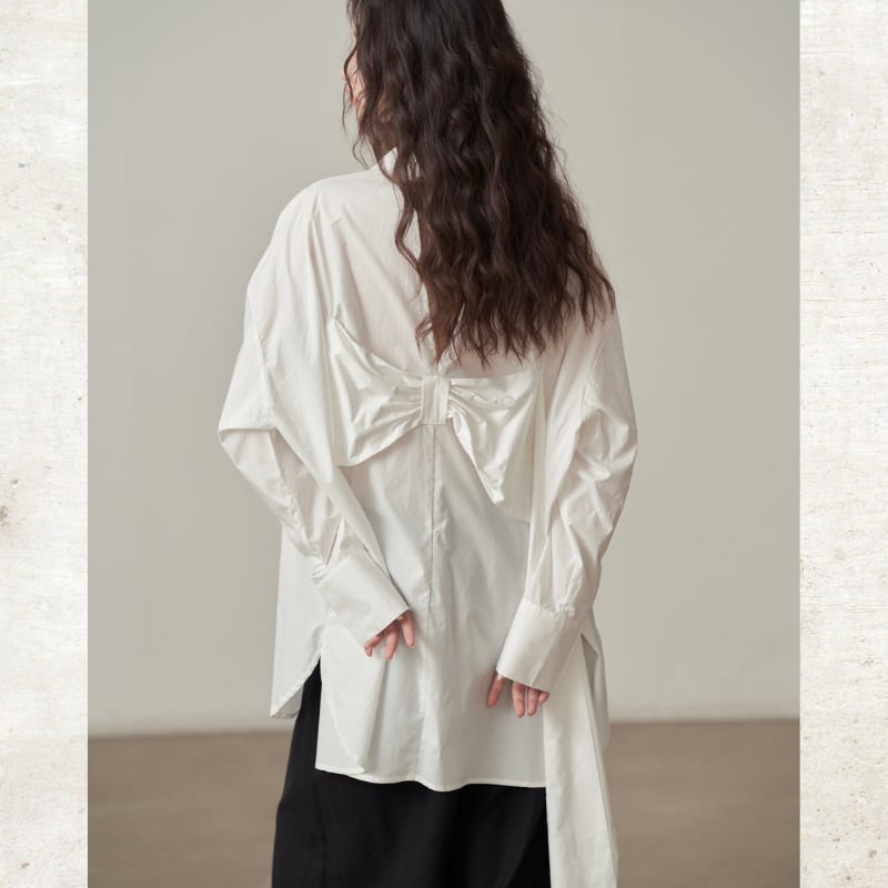 クリーンなオーバーサイズシルエットでありながら、大胆なバックシャンデザインで魅せるシャツ。