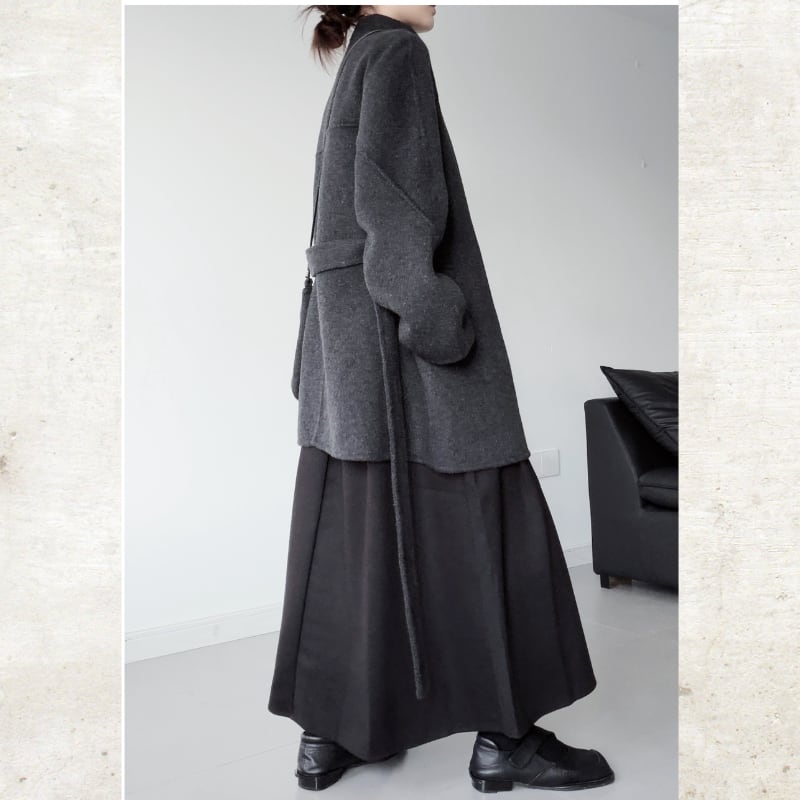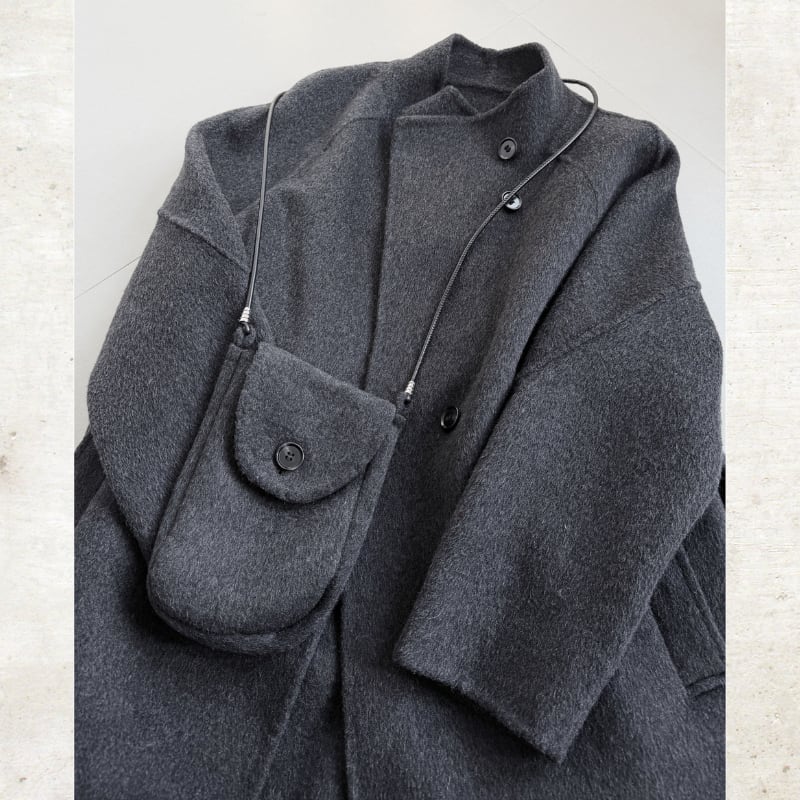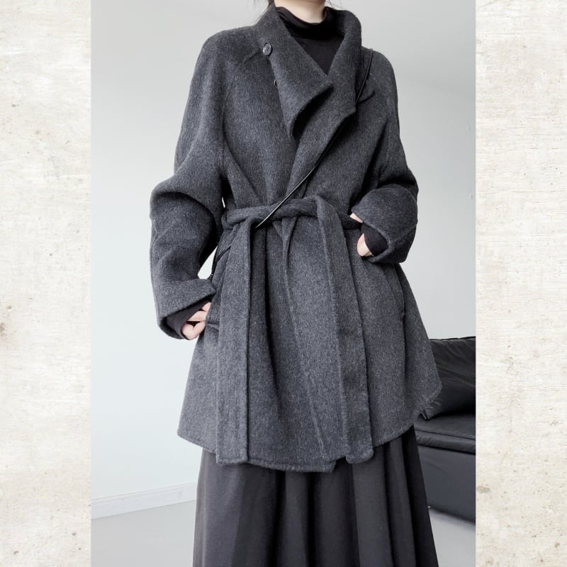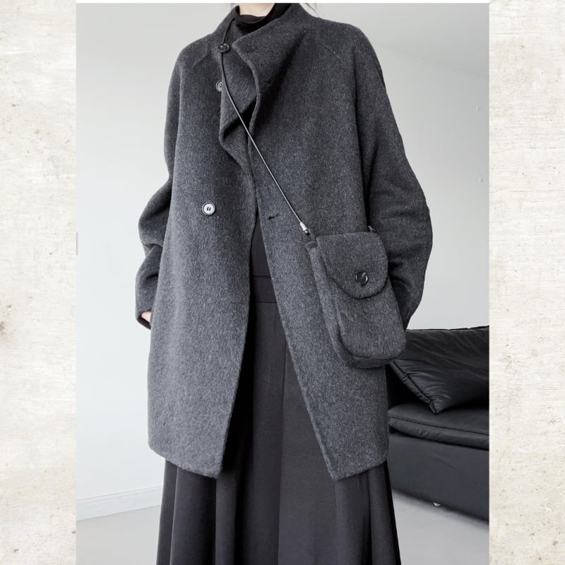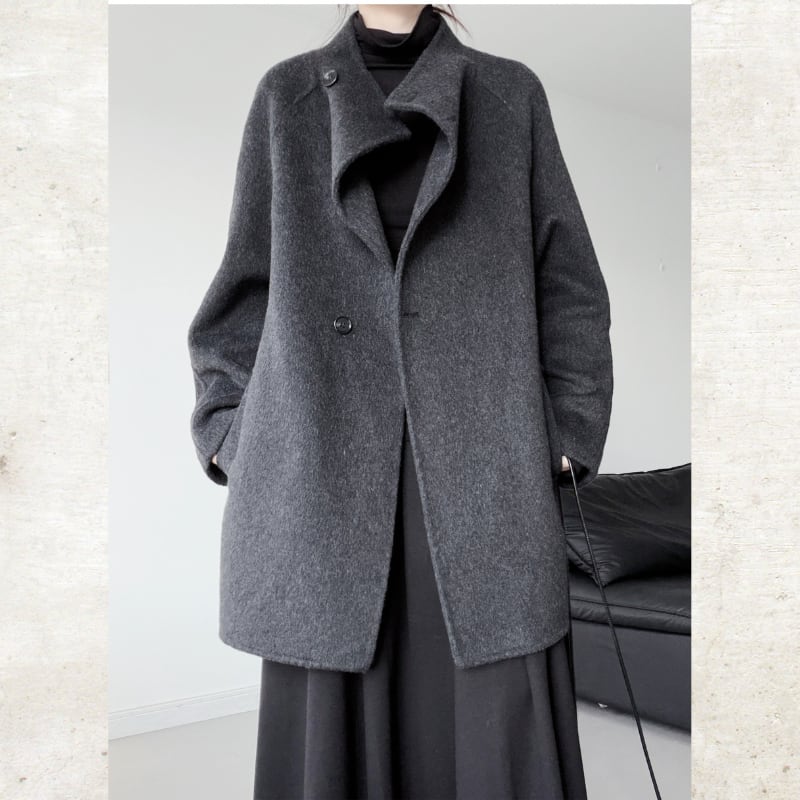 ウールライクな素材と、シャープなスタンドカラーが構築的なムードを放つミディアムコート。