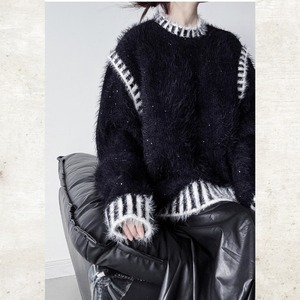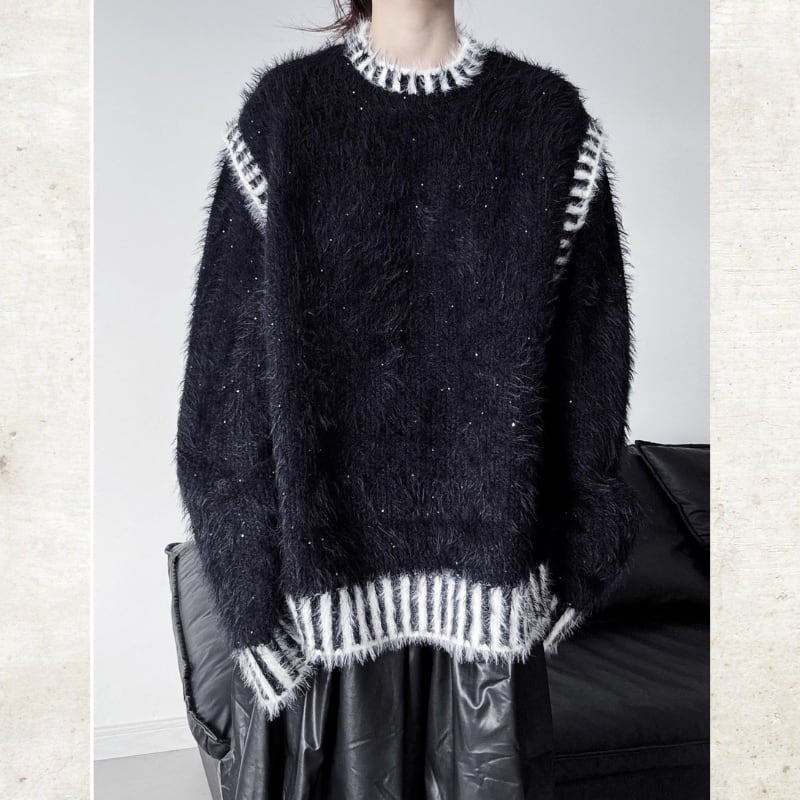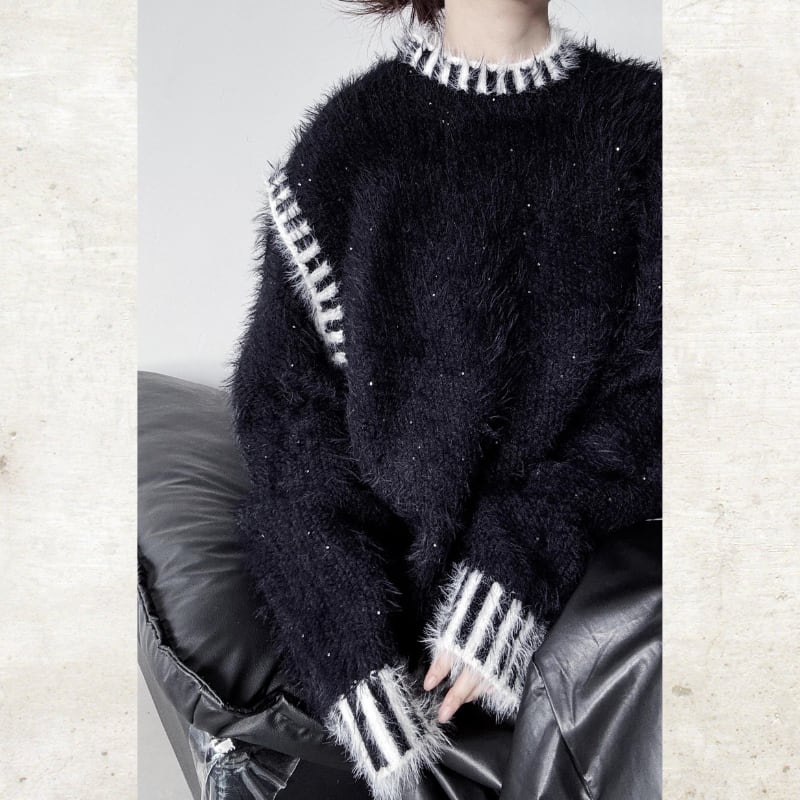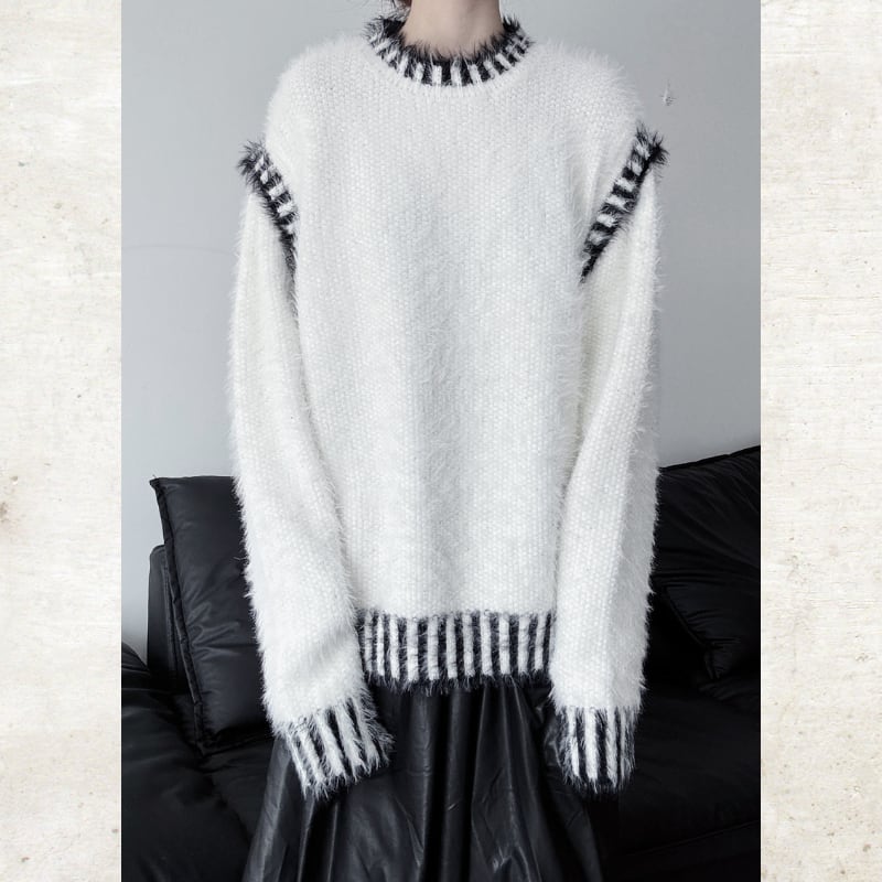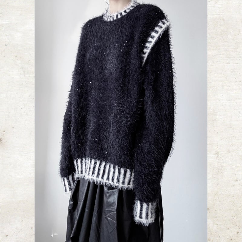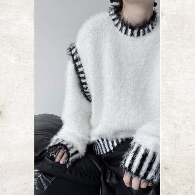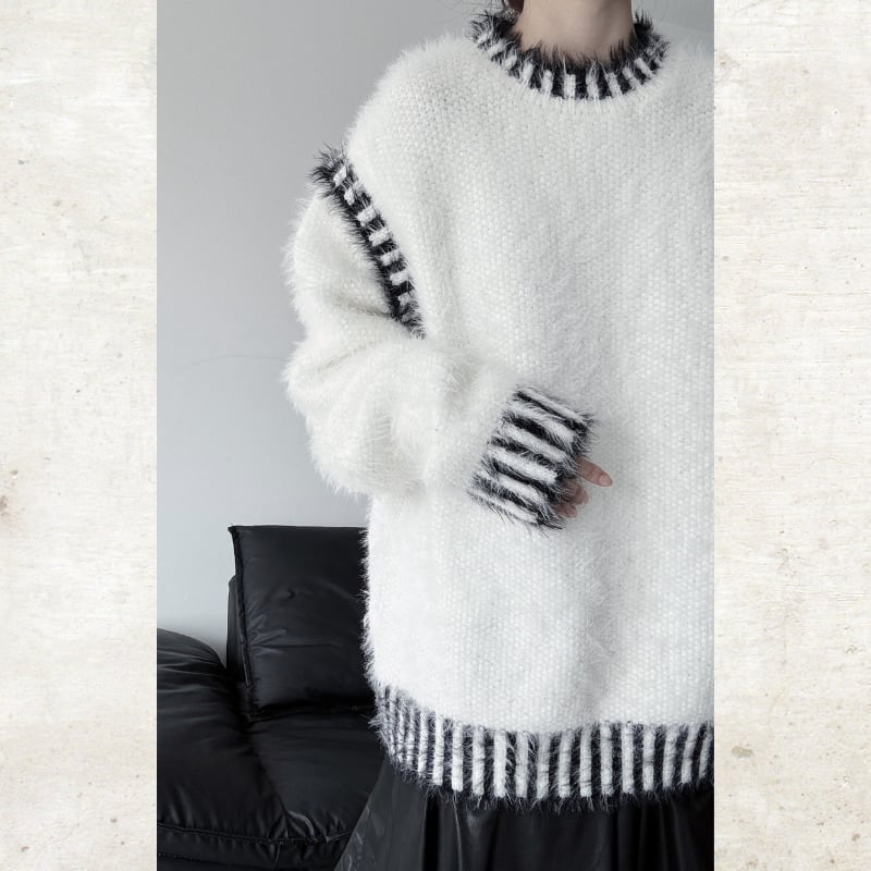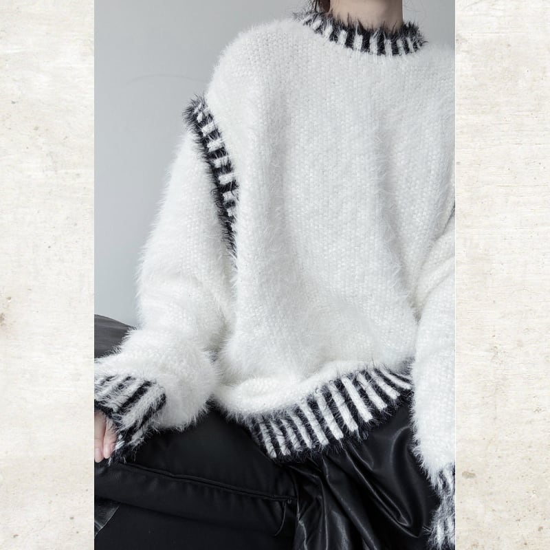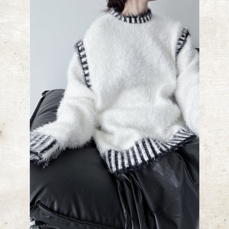 毛足の長いシャギーな素材に、コントラストの効いたボーダーのトリミングを施した、視覚的なインパクトを持つニット。