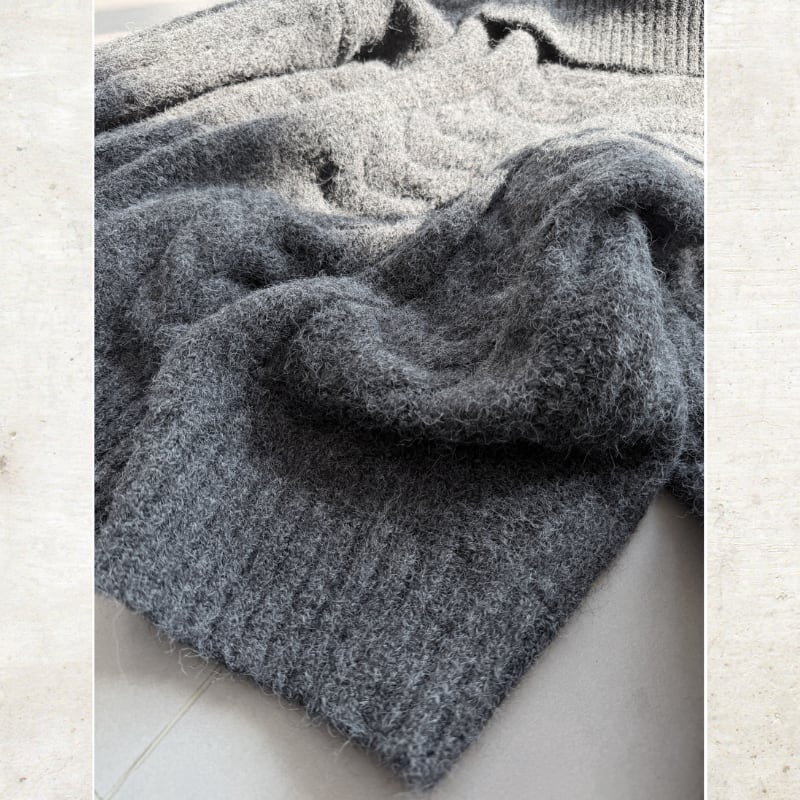 重厚感のある縦ラインのケーブル編みの存在感あるニット。