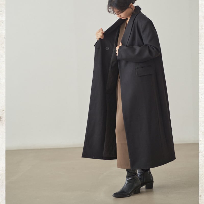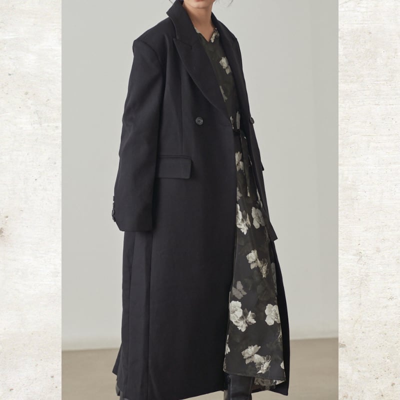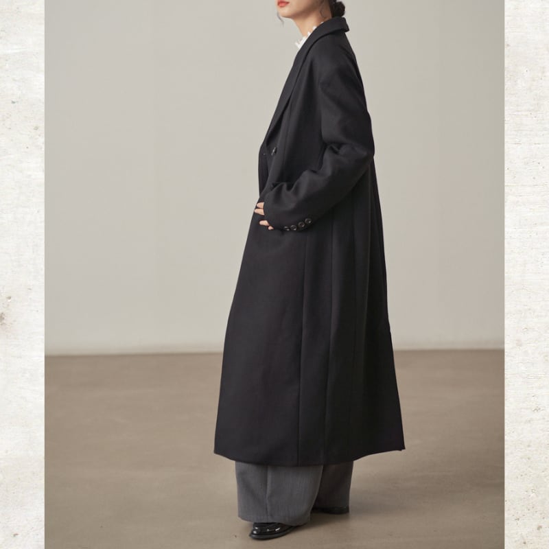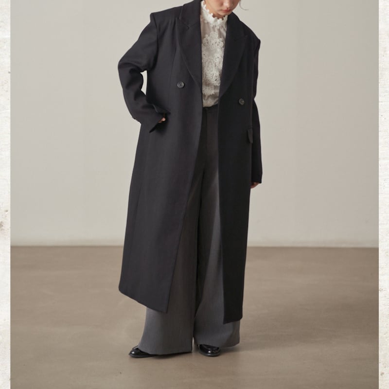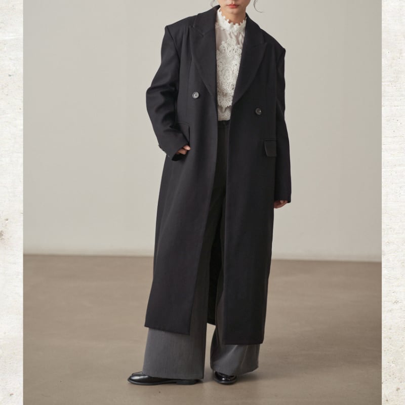 構築的なパワーショルダーが、クラシックなダブルブレストをモードへと昇華させたロングコート。