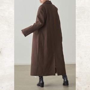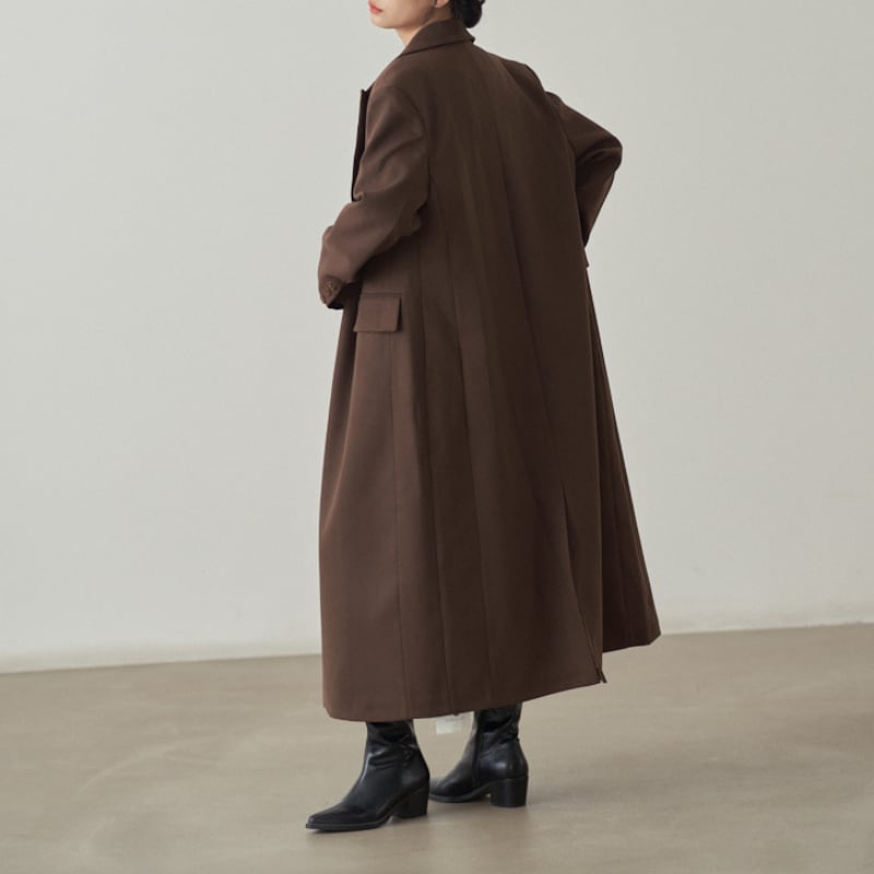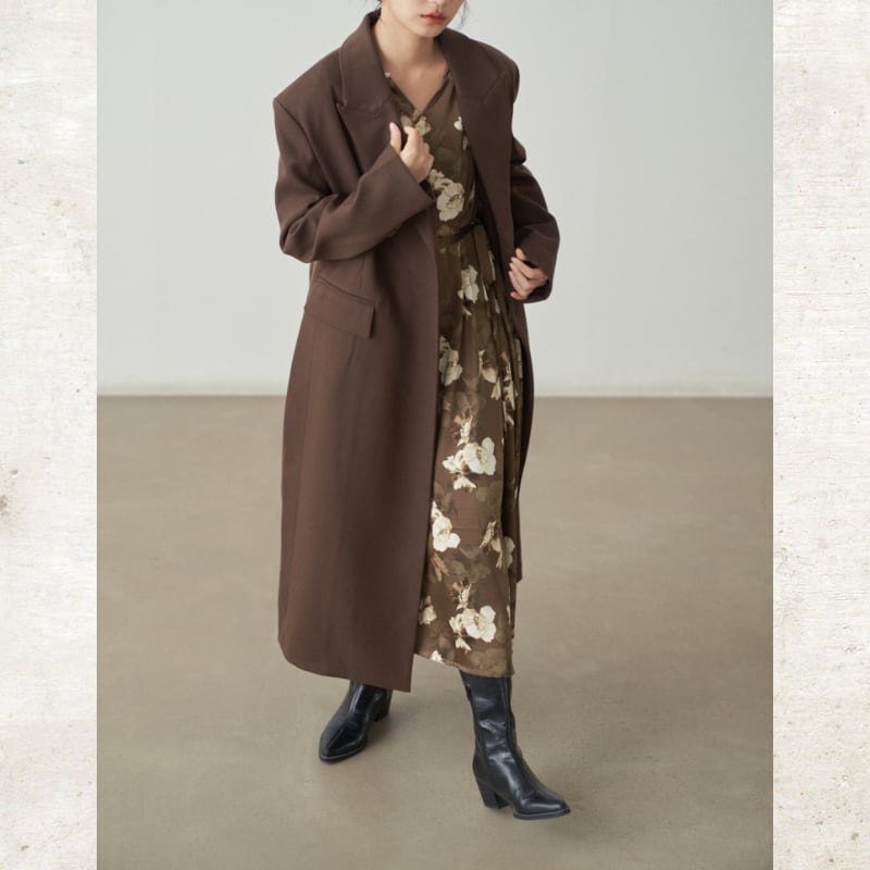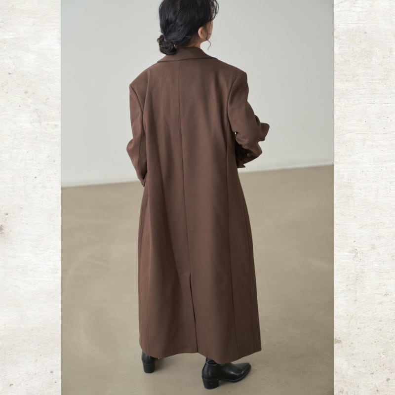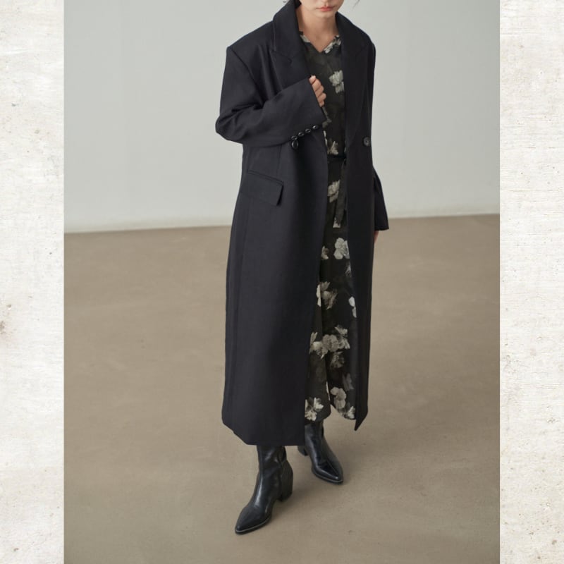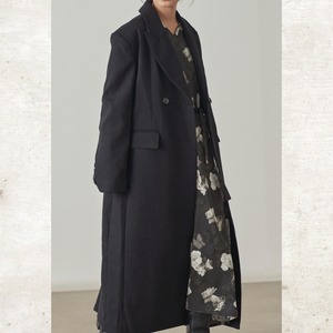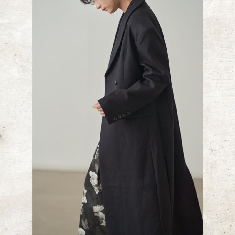 構築的なパワーショルダーが、クラシックなダブルブレストをモードへと昇華させたロングコート。