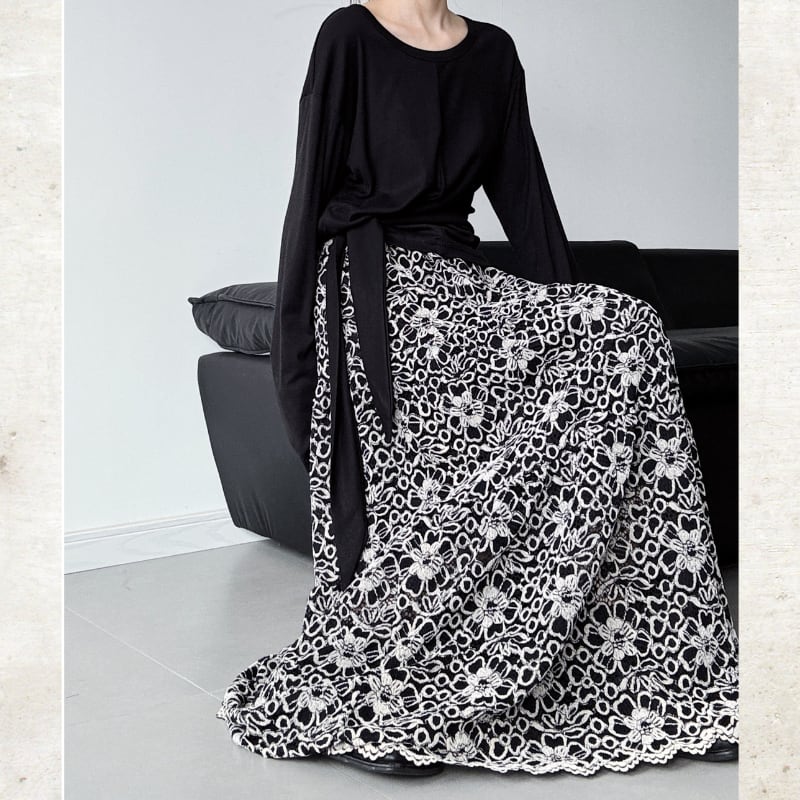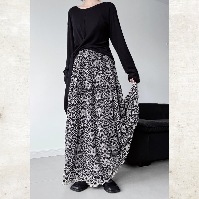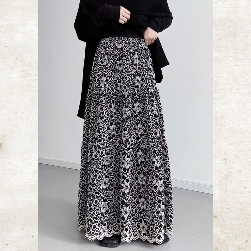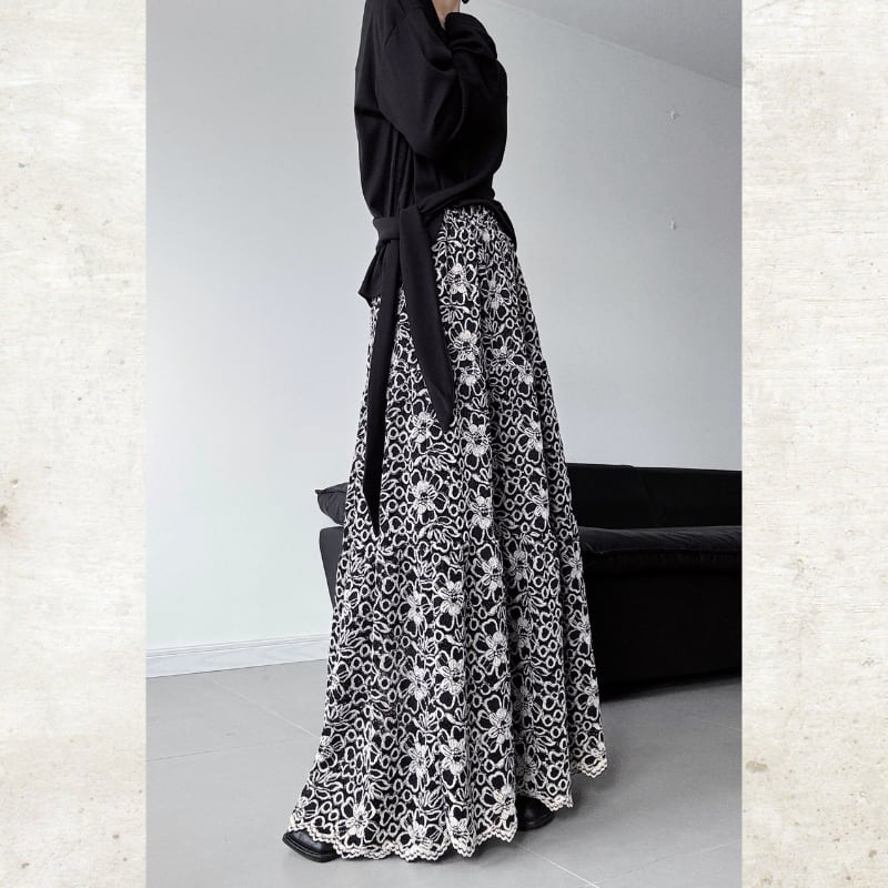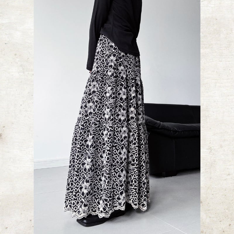 モノトーンで表現されたダイナミックなフラワーモチーフが、装いに視覚的なインパクトを与えるロングスカート。