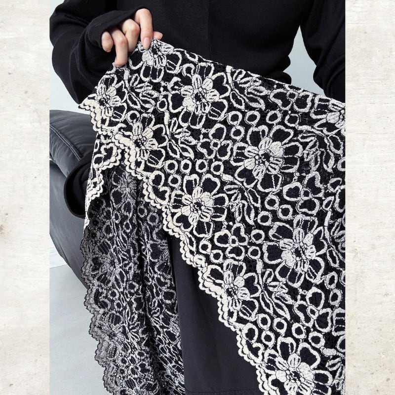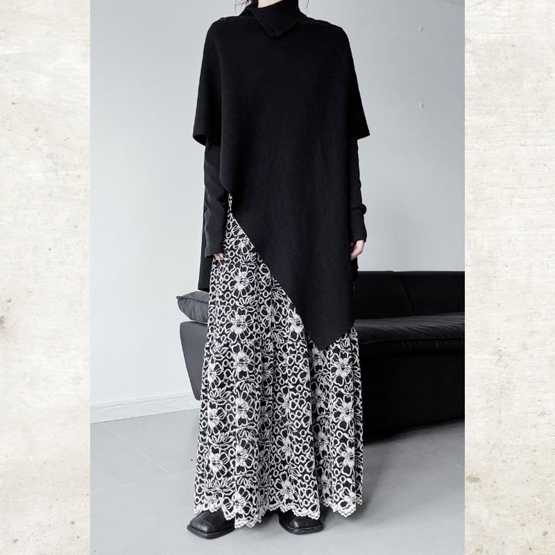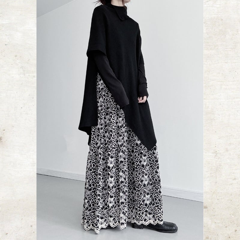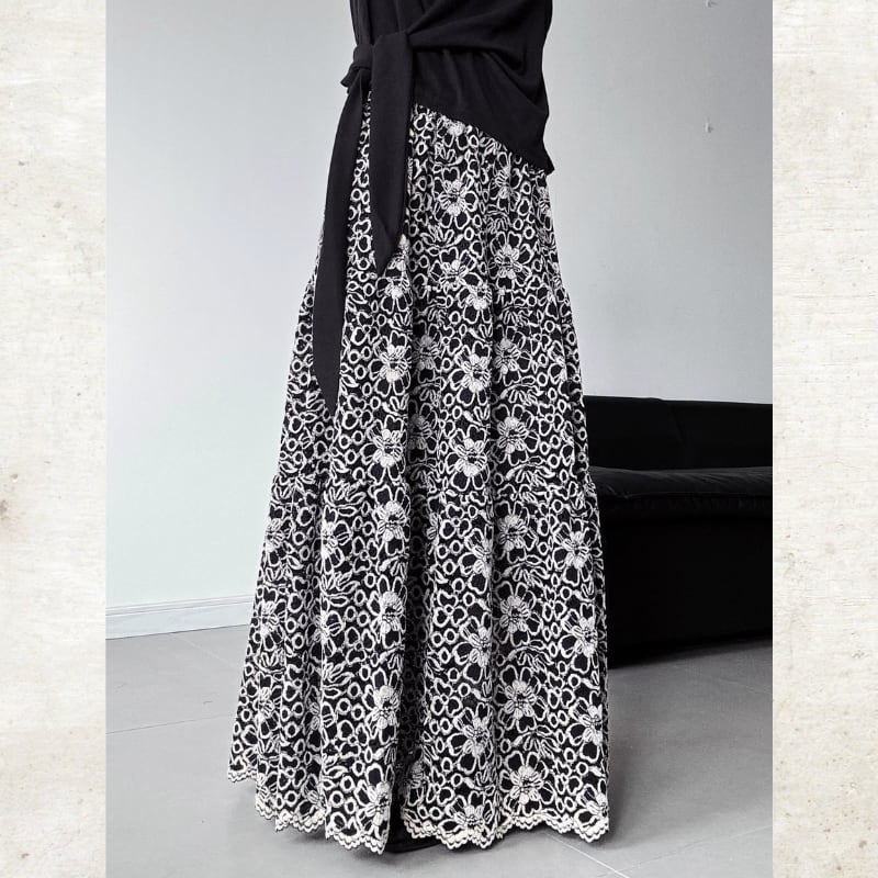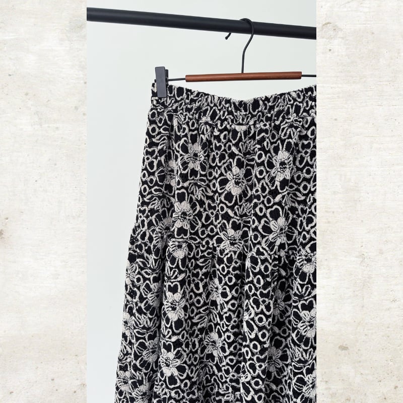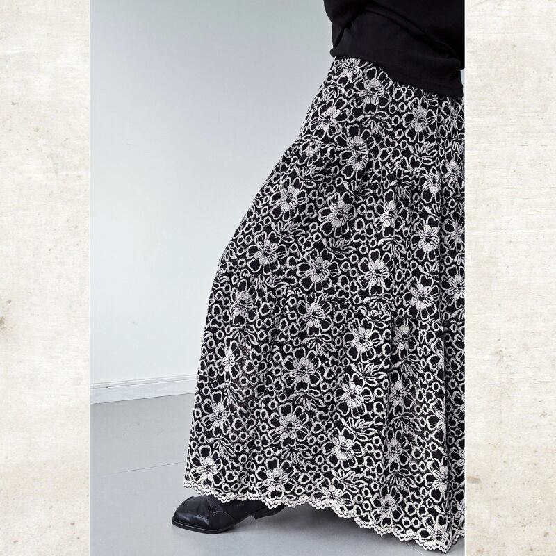 モノトーンで表現されたダイナミックなフラワーモチーフが、装いに視覚的なインパクトを与えるロングスカート。